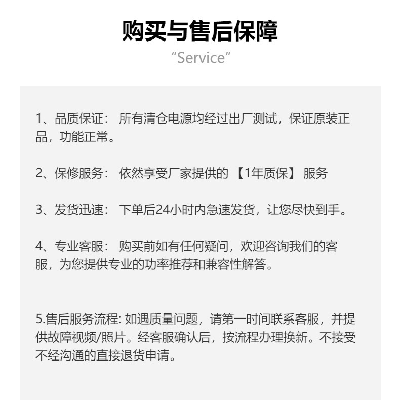 Please rest assured that all clearance power supplies are brand new and genuine, with no quality issues!A small portion of the goods may have packaging damage, slight transportation wear and tear, or minor scratches on the appearance (as shown in the actual product photos) or as display samples, which do not affect normal use.