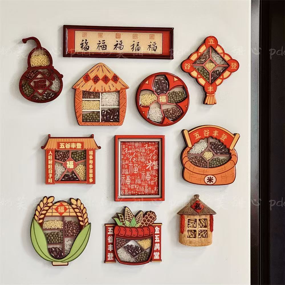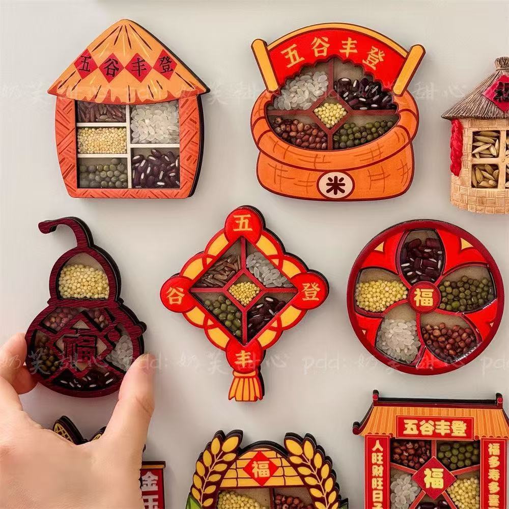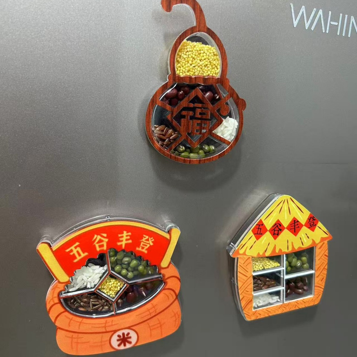 国潮五谷丰登亚克力冰箱贴木纹创意乔迁礼物原创磁吸磁贴工艺品