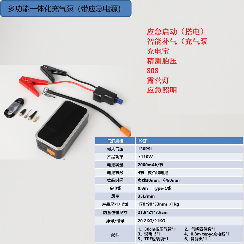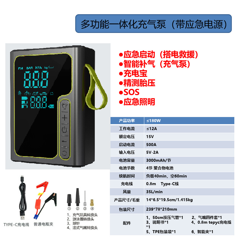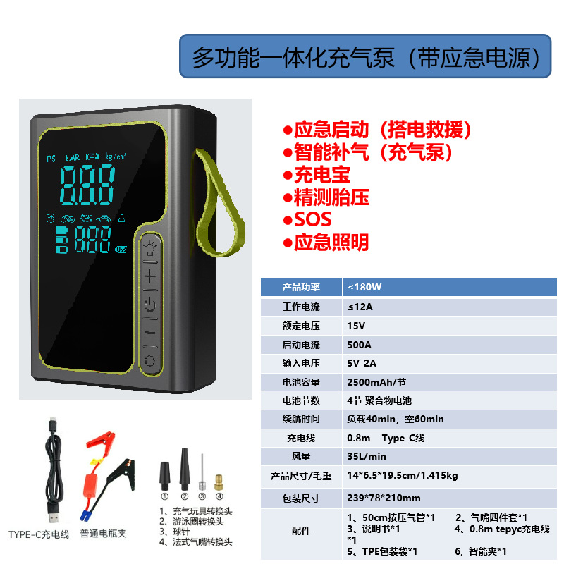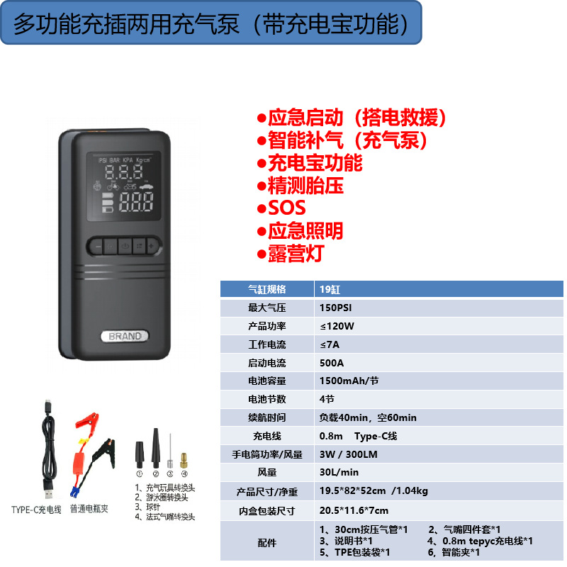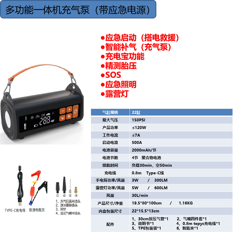 | 附加功能 | 照明;胎压表;警示灯;USB充电 |