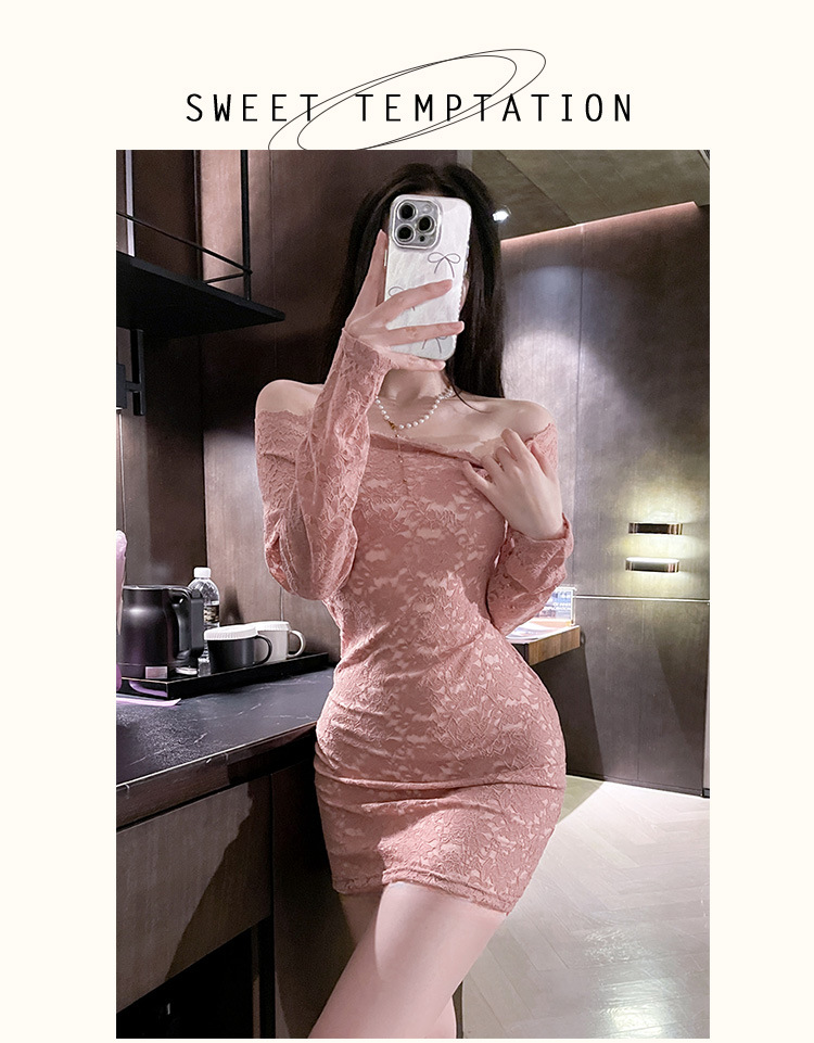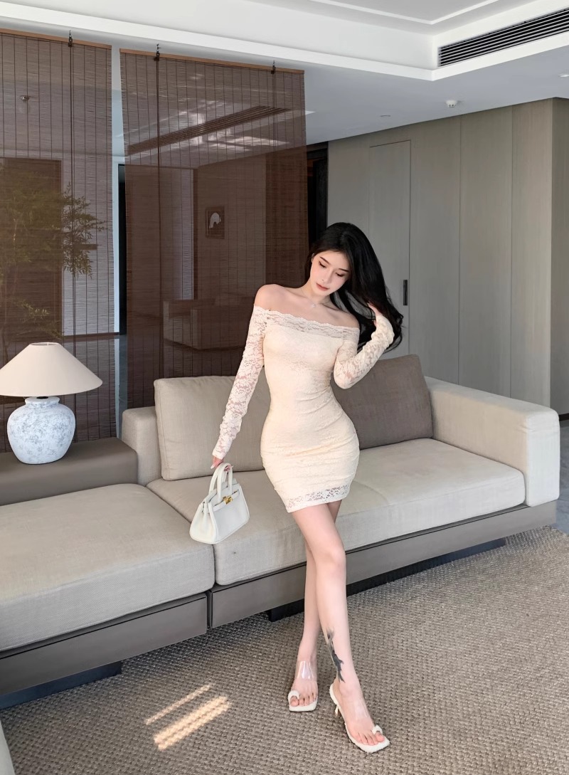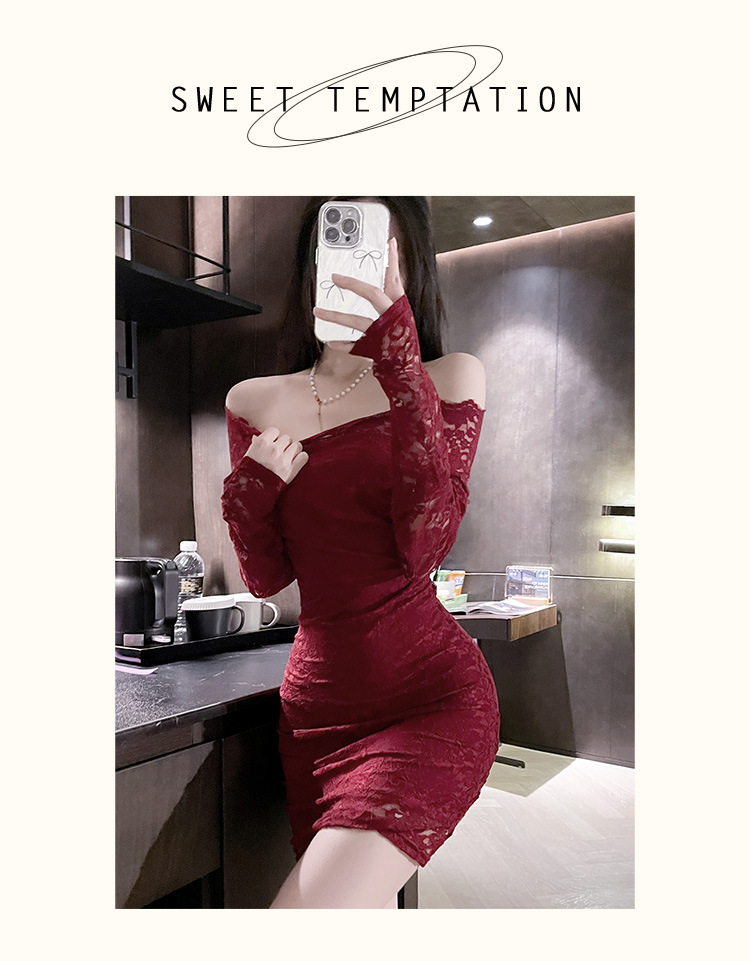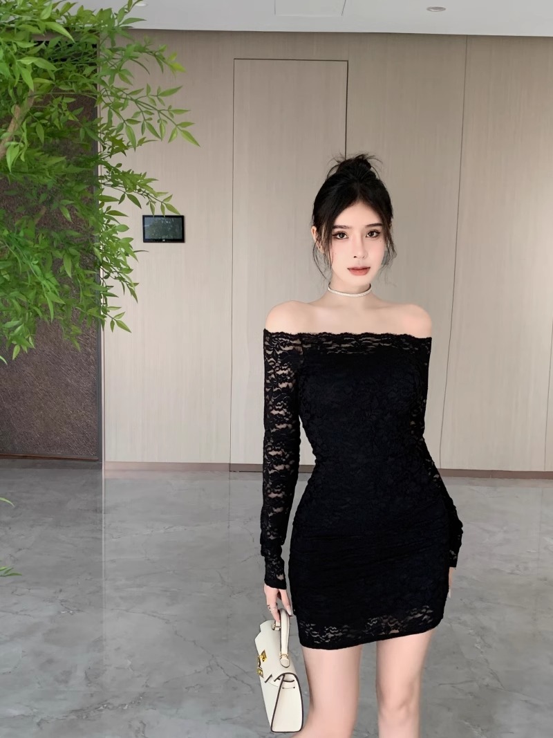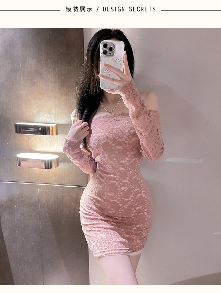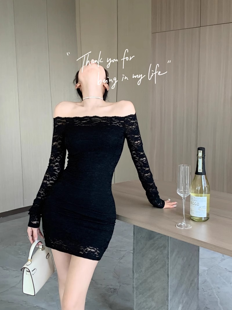 Платье с длинными рукавами, сексуальное кружево, высокое чувство плеча, толстый пакет, юбка с ягодицами.