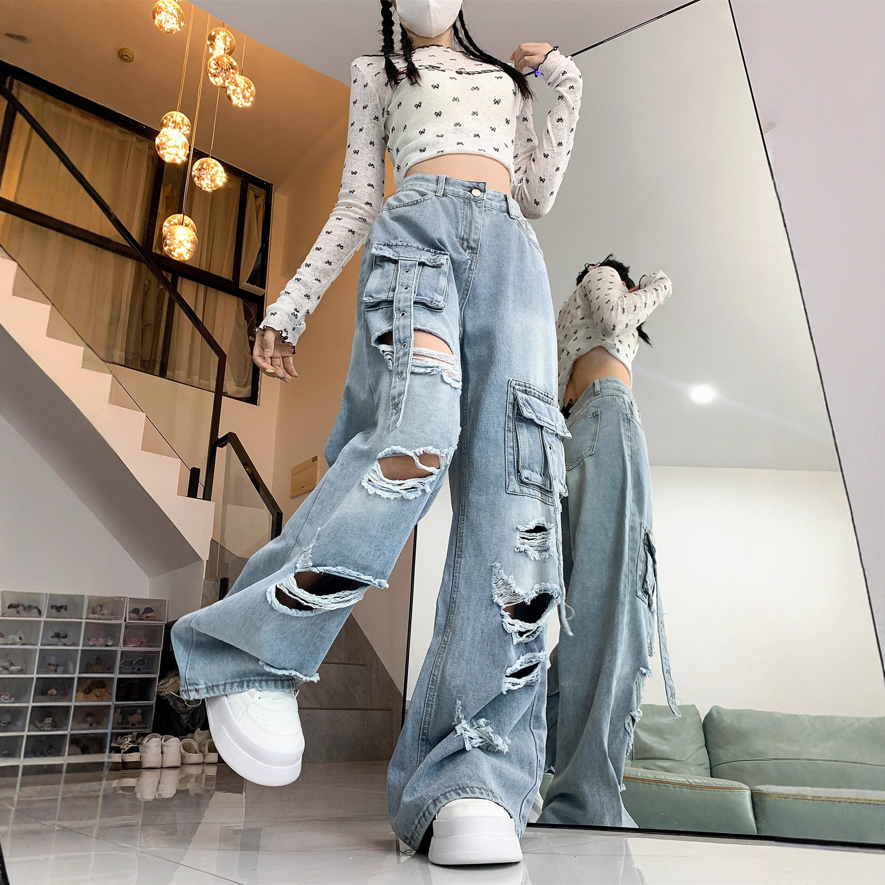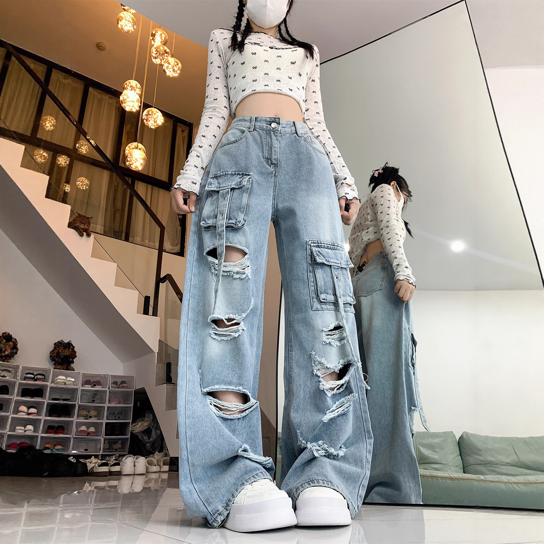2025 Broken Hole High Street workwear for women with a niche design sense, vertical feeling, floor dragging straight leg wide leg pants wholesale jeans