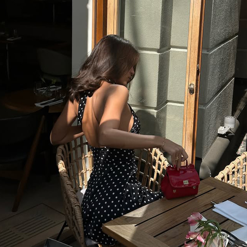 | workmanship | Hanging neck and exposed back, polka dot print |