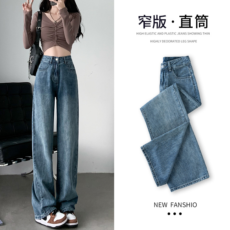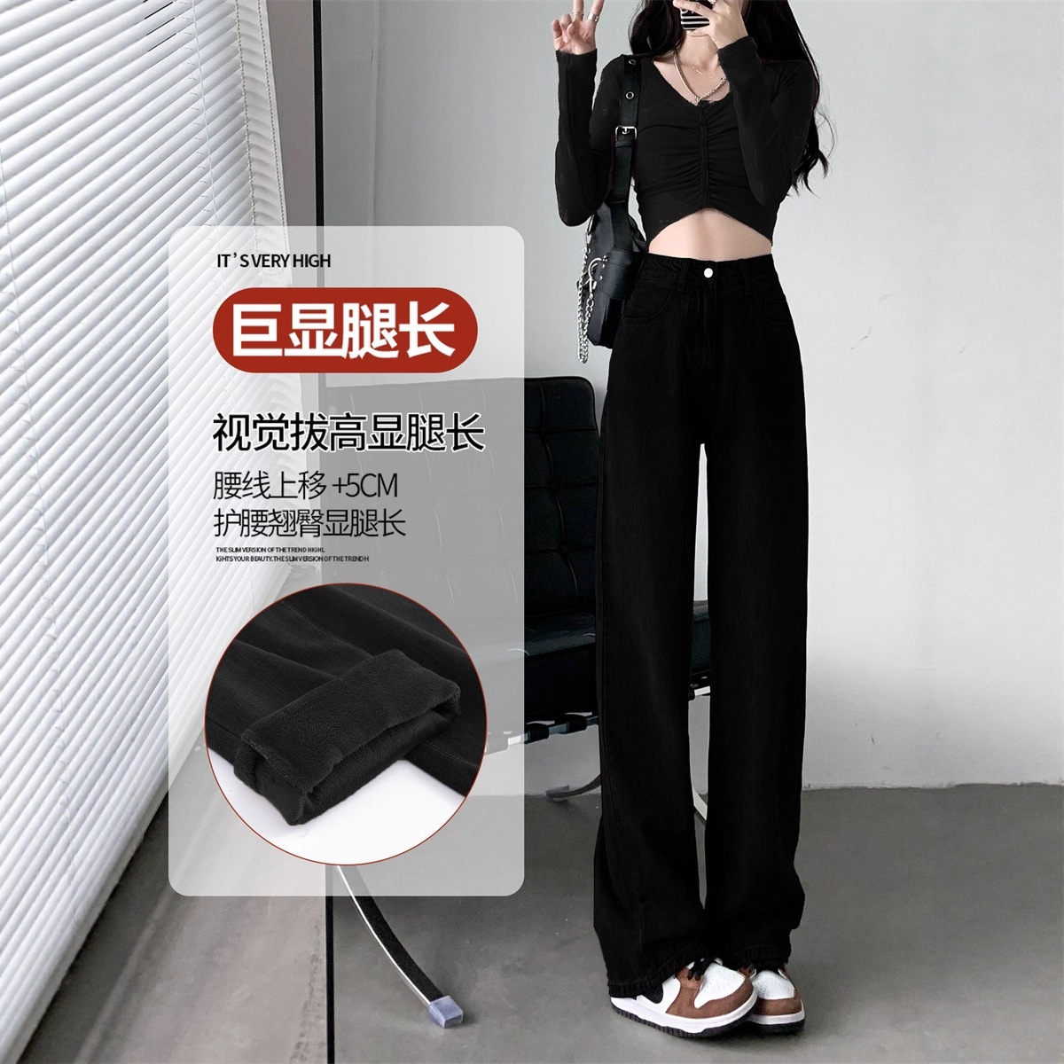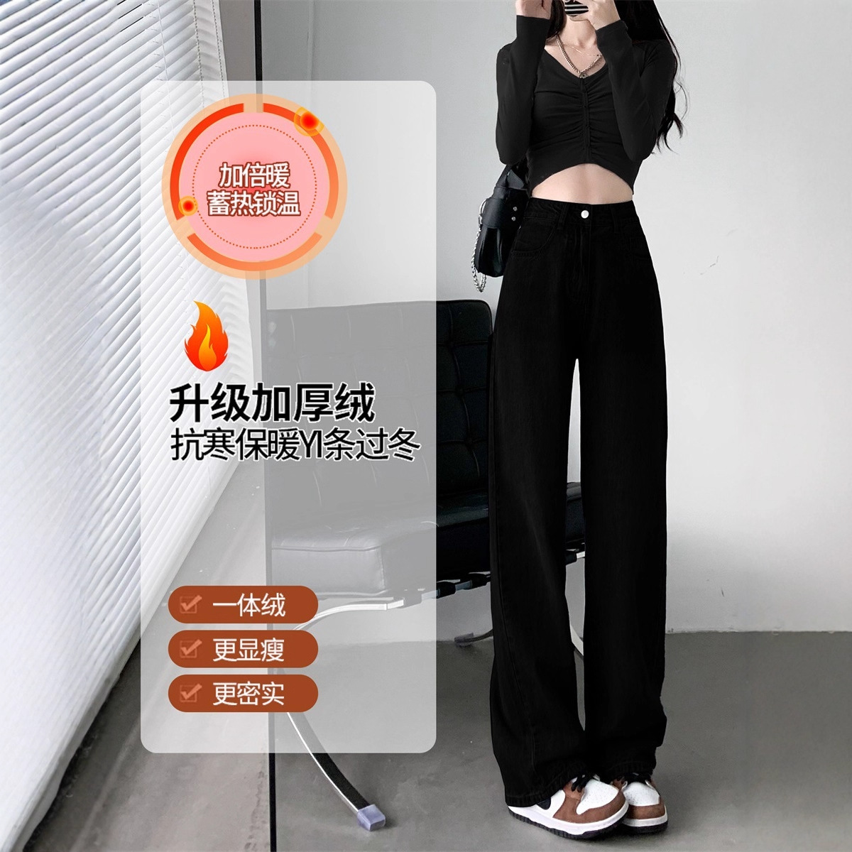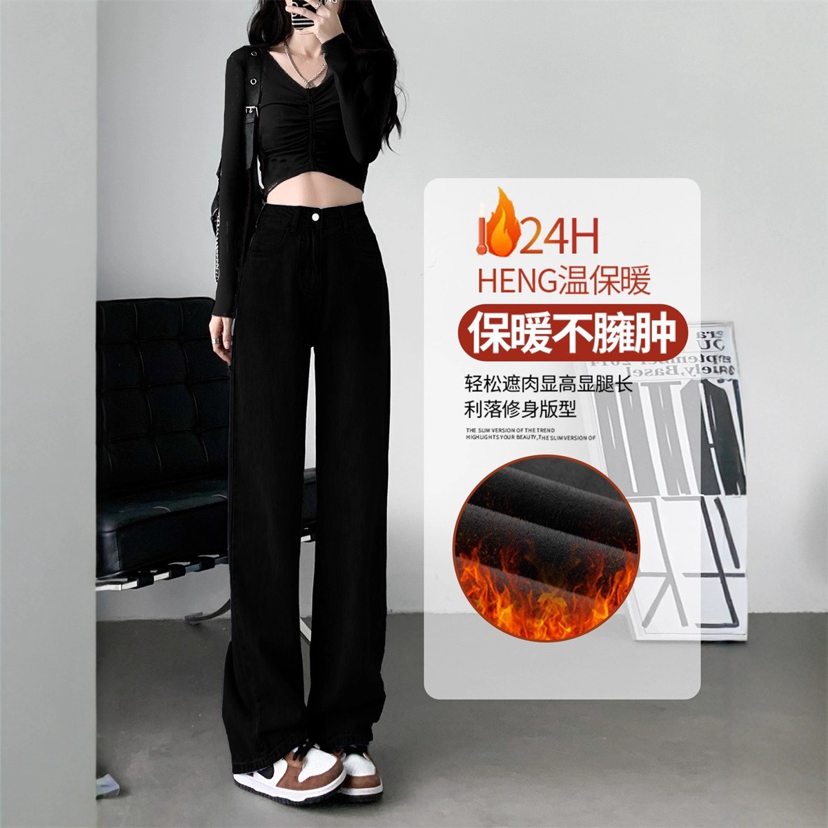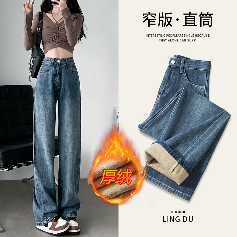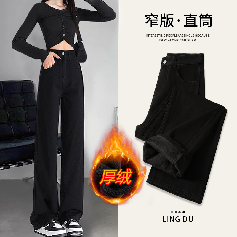 Black velvet straight leg jeans for women's autumn and winter 2025 new high waisted, crotch covering, thick and warm, narrow version wide leg pants