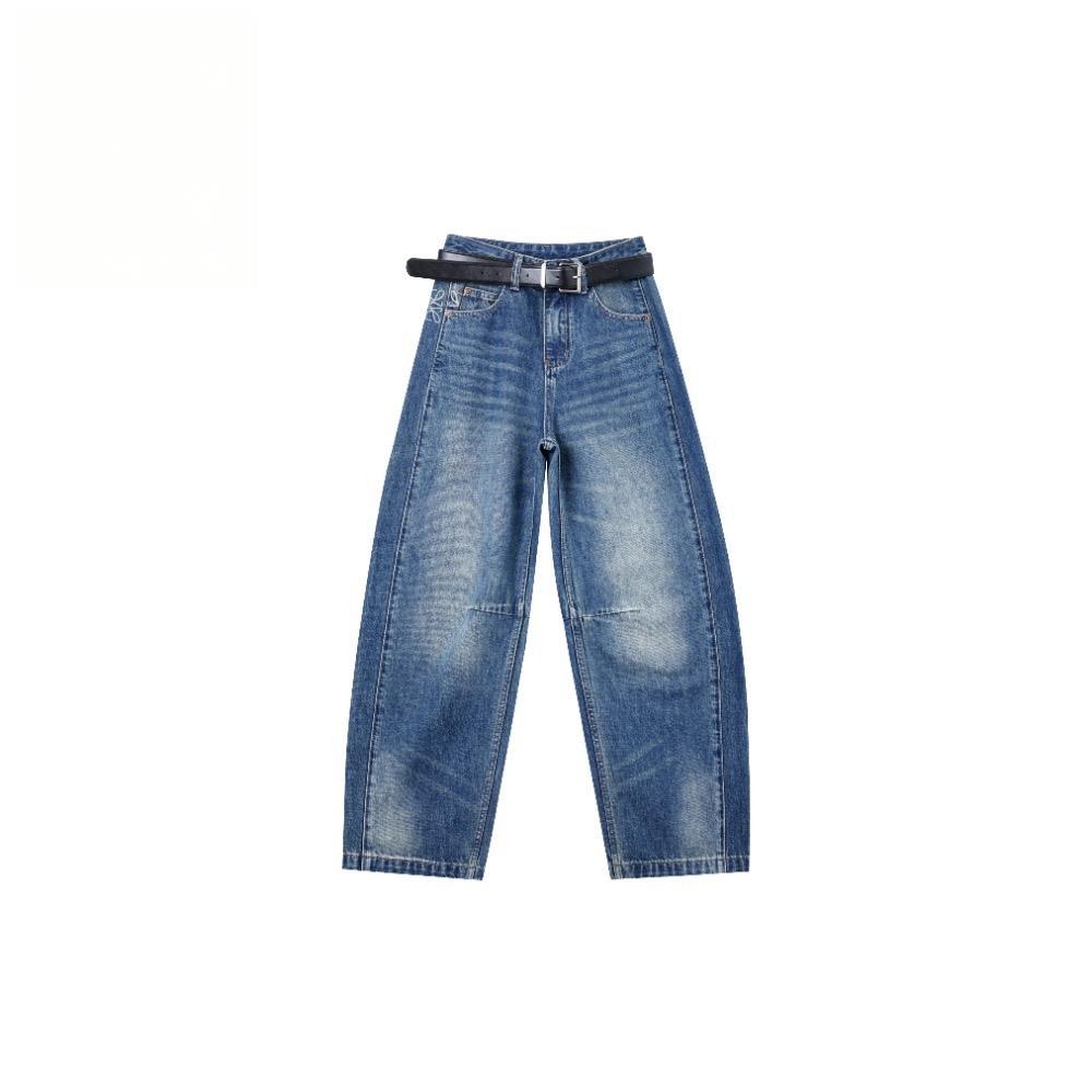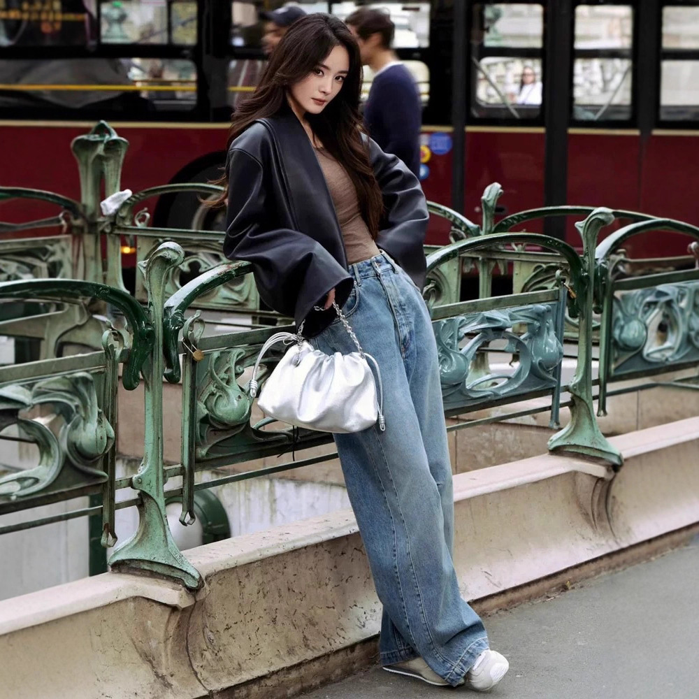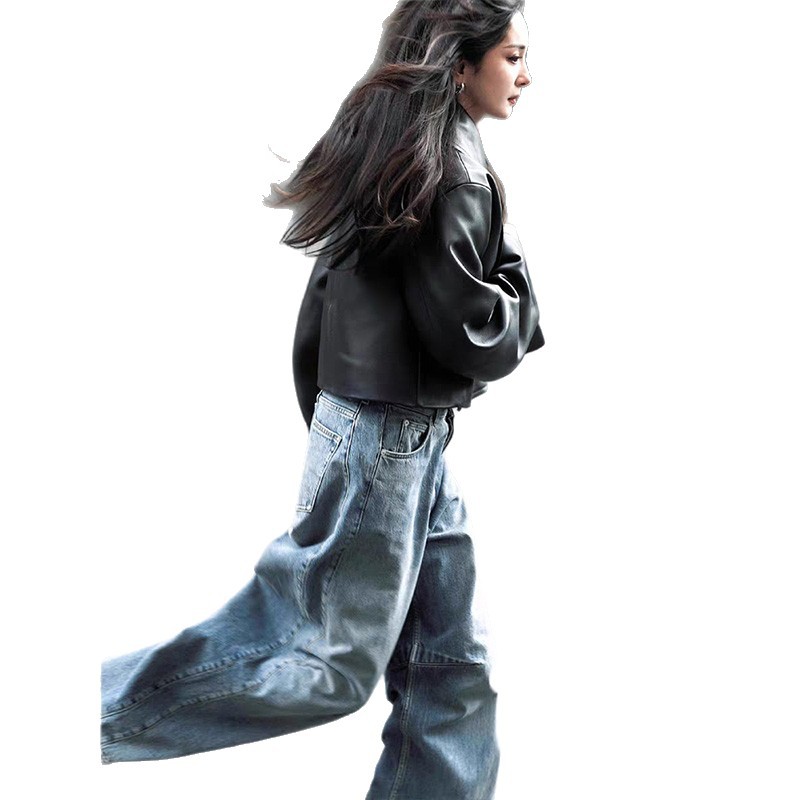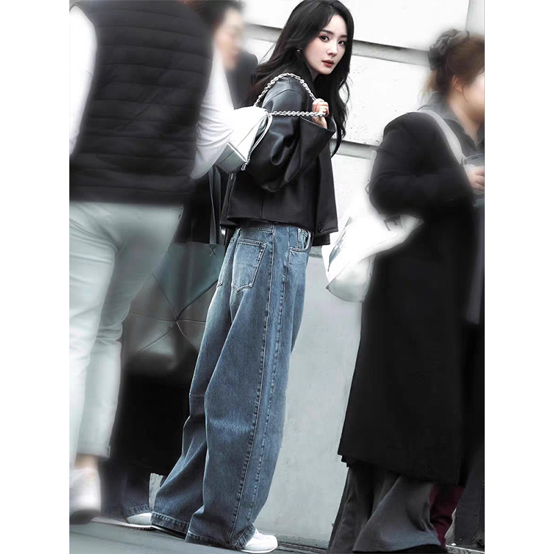 Yang Mi Blue Wide Leg Jeans Women's Autumn Celebrity Same Style Retro High Waist Look Thin Loose Straight Pants