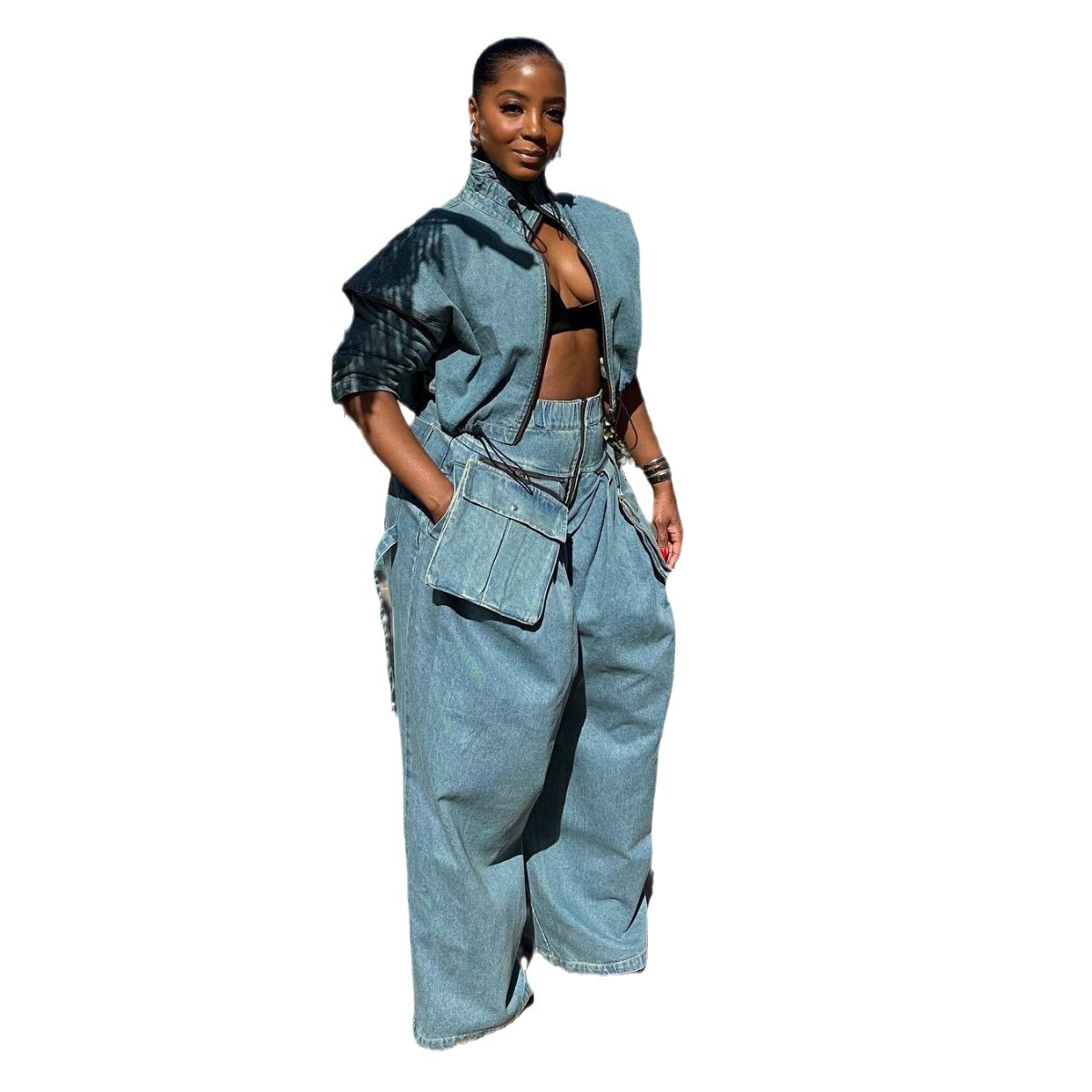 Amazon Cross border European and American Fashion Retro Wide Leg Loose Heavy duty Cowboy Two Piece Set Women's Clothing