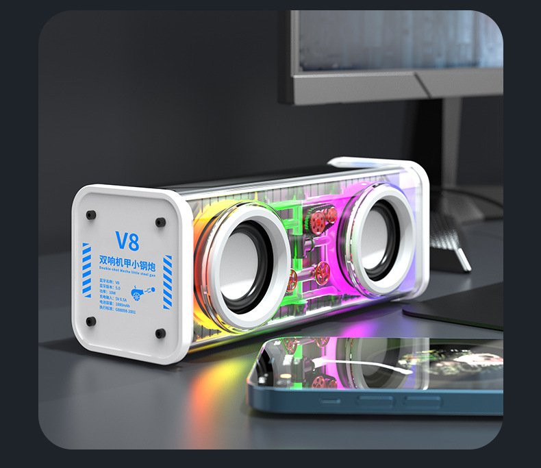 Explosive V8 Transparent Mech Dual Sound Small Steel Cannon Multi Power Bass Cannon Audio Outdoor Portable Internet Celebrity Desktop Small Speaker