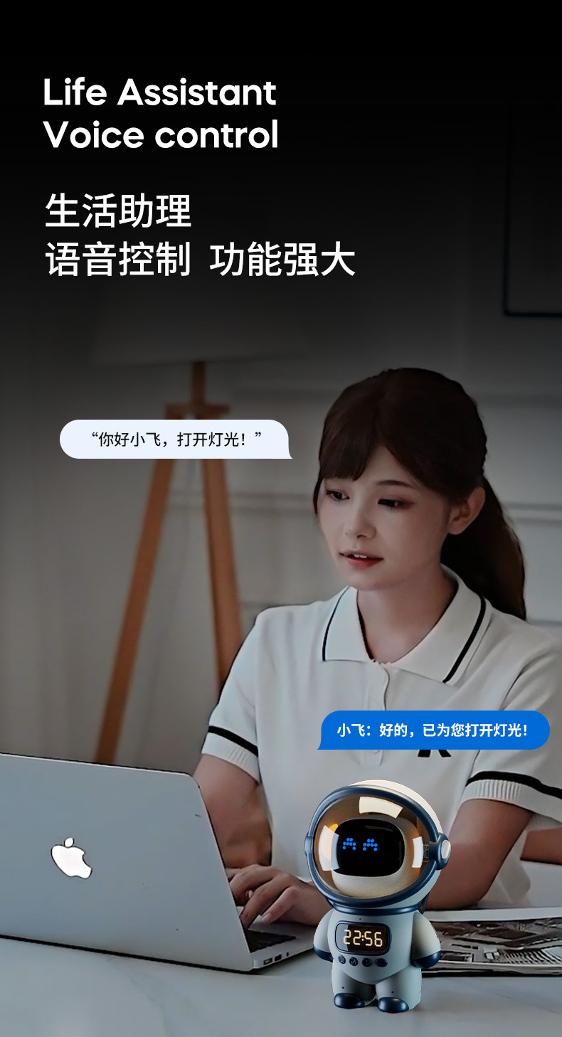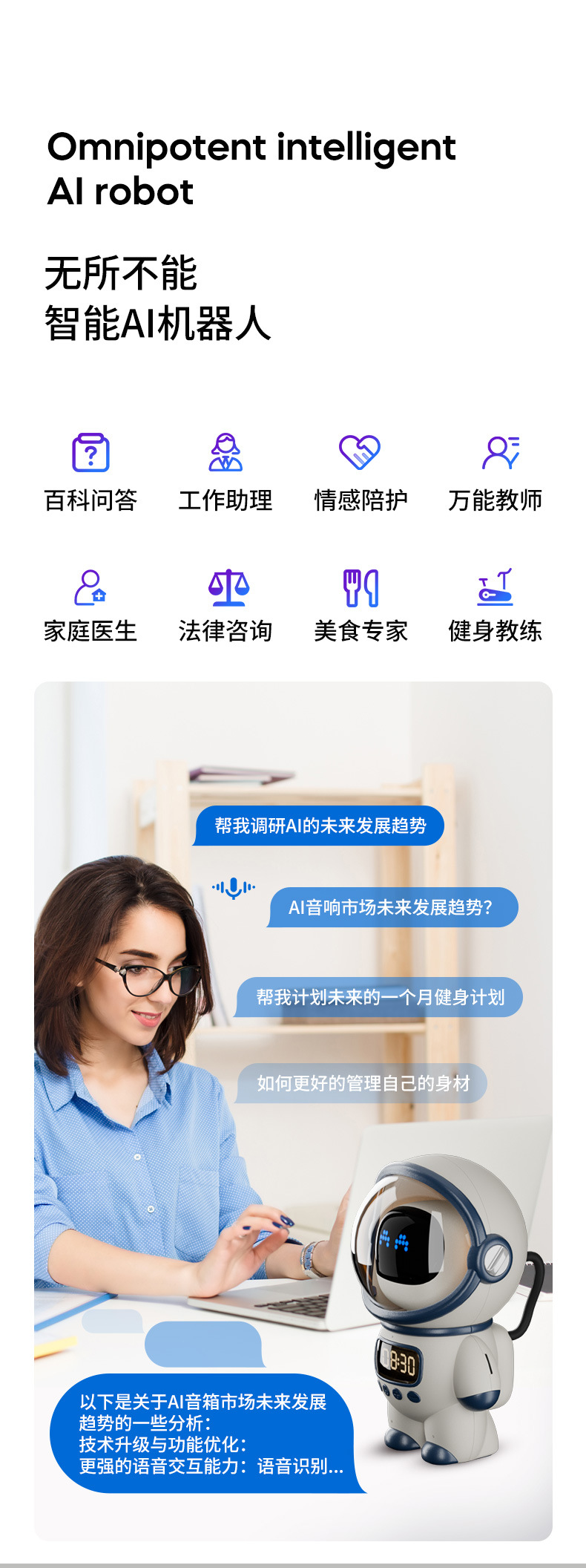 Функции продукта: 1. Интеллектуальный голосовой диалог 2.AI Большая модель 3. AI, Повседневная жизнь, работа, энциклопедический всемогущий помощник 4. Настройка голосового будильника, автоматическая синхронизация 5. Динамический спектр, спектр эмоционального выражения 6. Функция ночного света 7. Поддержка вставки TFCA MP3 формата 8. Поддержка внешнего аудиоввода AUX 9. Поддержка подключения Bluetooth для воспроизведения музыки 10. Поддержка разговоров в чате человека 11. Поддержка сетевого соединения 2.4G / WIFI 12. Поддержка платформы микропрограмм 13. Поддержка голосового поиска и ответов на вопросы 14. Часы показывают 15. Поддержка небольших программ для онлайн - редактирования, интеллектуального AI - письма, создание контента в Интернете одним нажатием кнопки, автомати 16. Охватывает различные сцены, такие как письмо / эмоции / копирование / развлечения / обучение / образование / творчество.