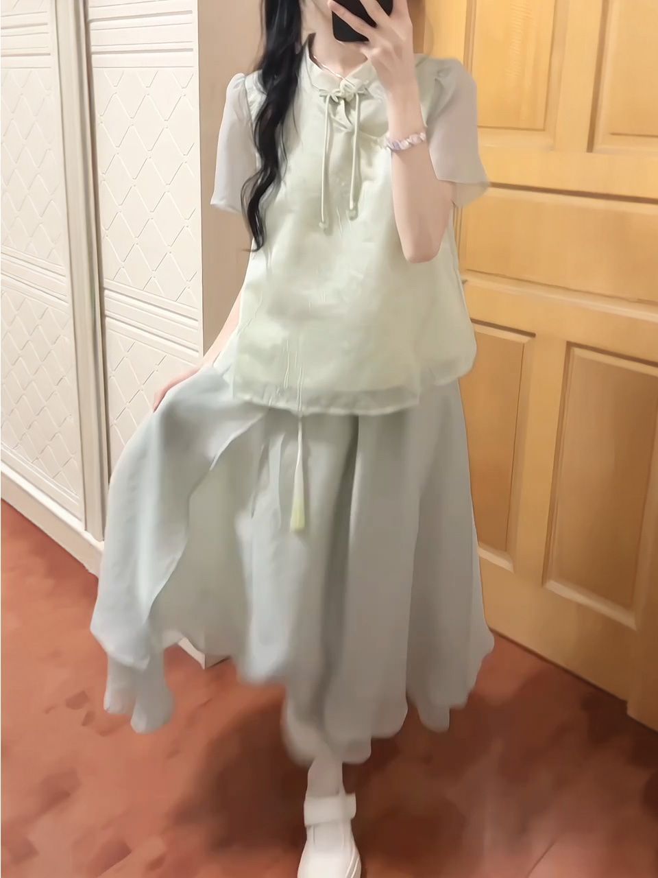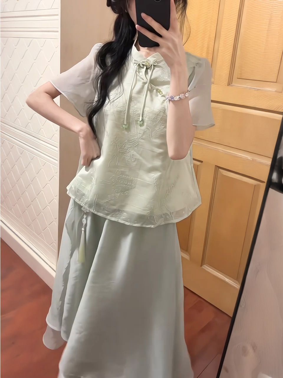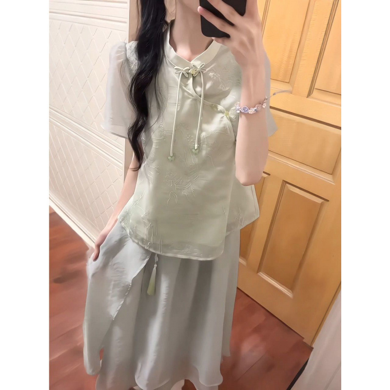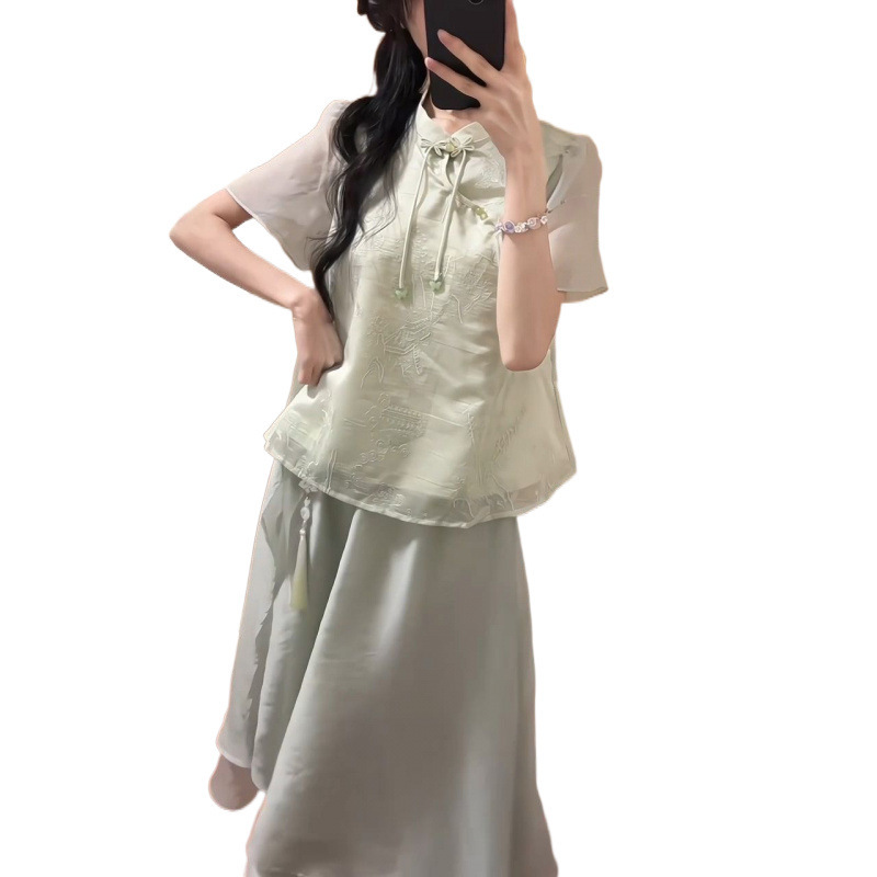 Chinese style summer embroidery temperament splicing Hanfu buckle casual top for female students, fresh half skirt set for women
