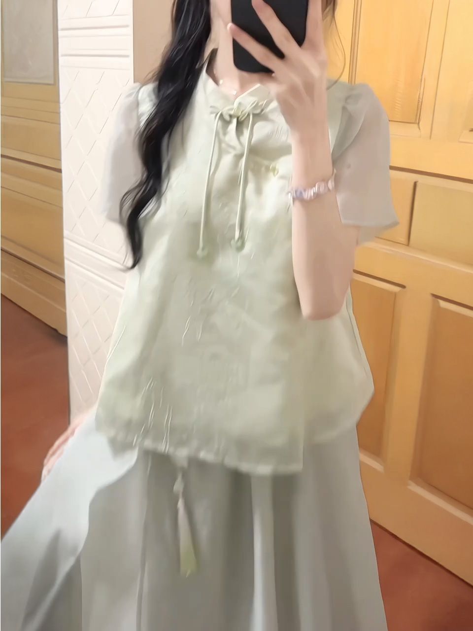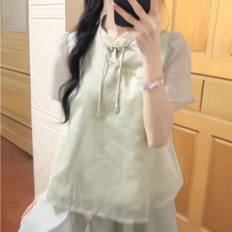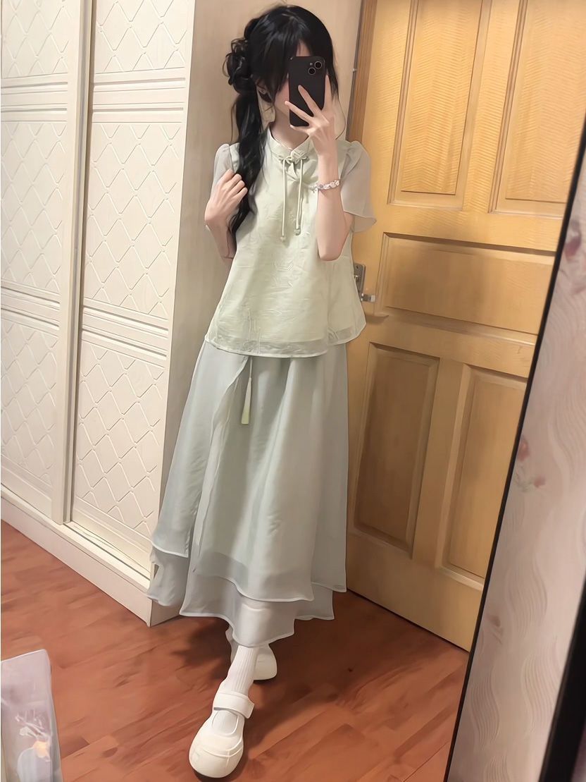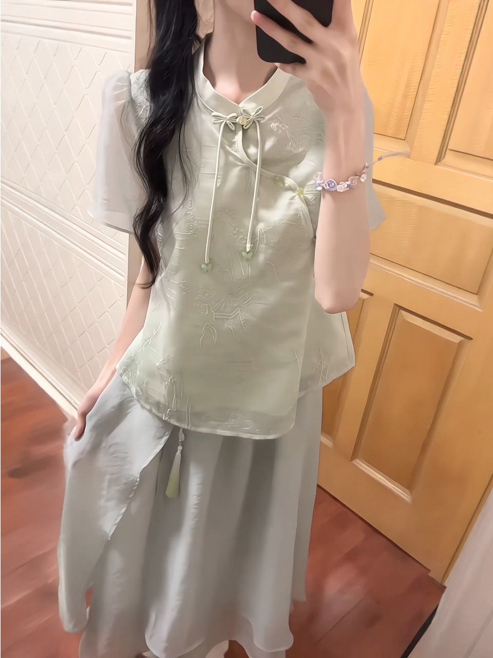 Chinese style summer embroidery temperament splicing Hanfu buckle casual top for female students, fresh half skirt set for women