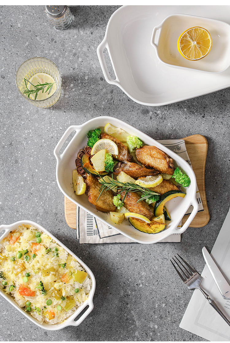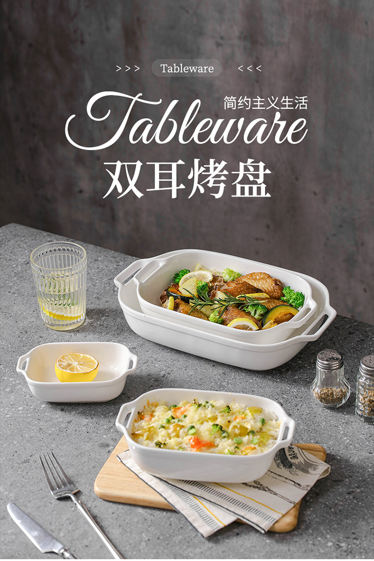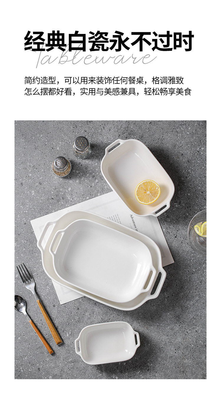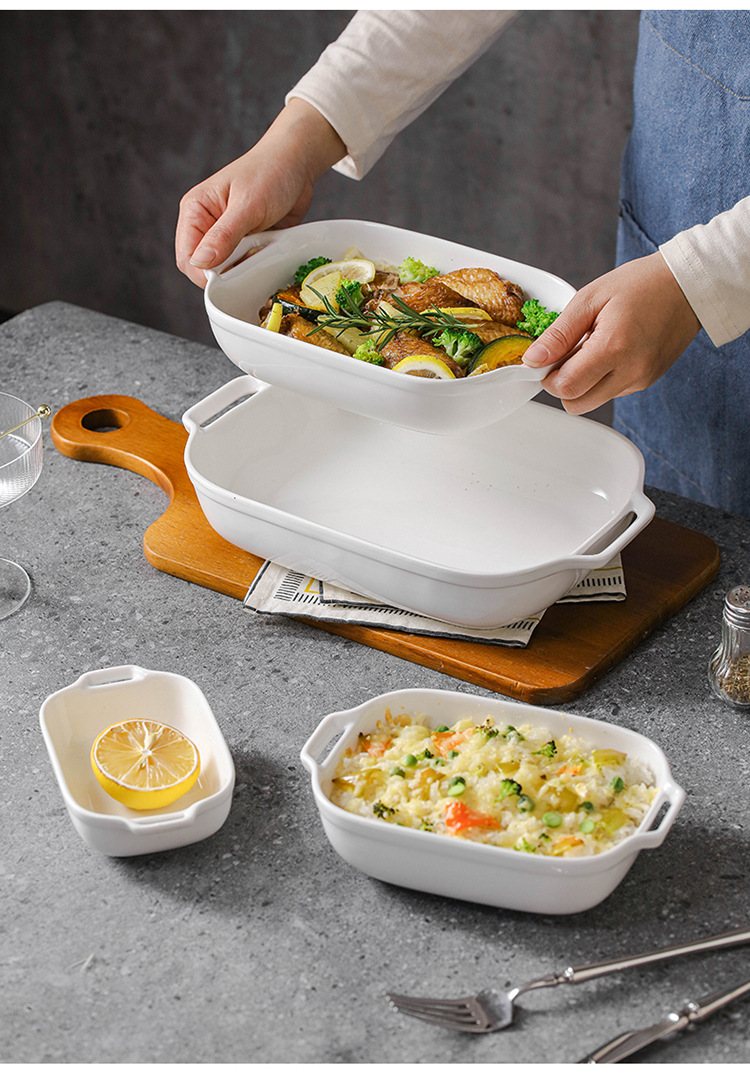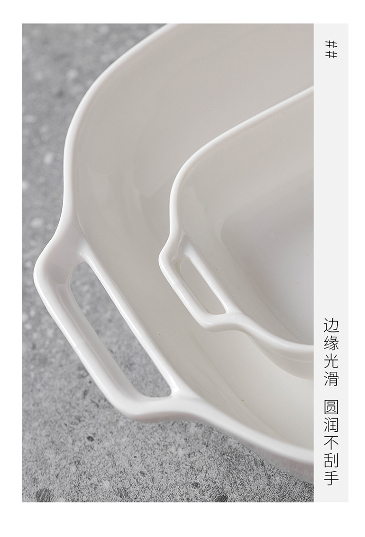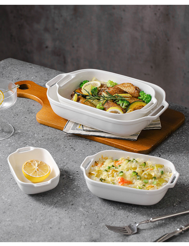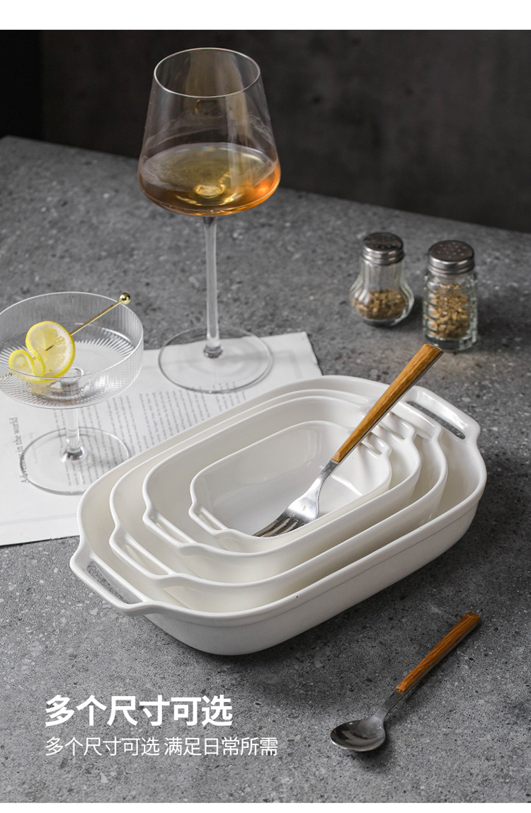 Simple pure white ceramic rectangular double ear baking tray, cheese baked rice bowl, heat-resistant household baking bowl, snack bowl, steamed fish dish