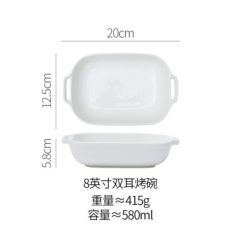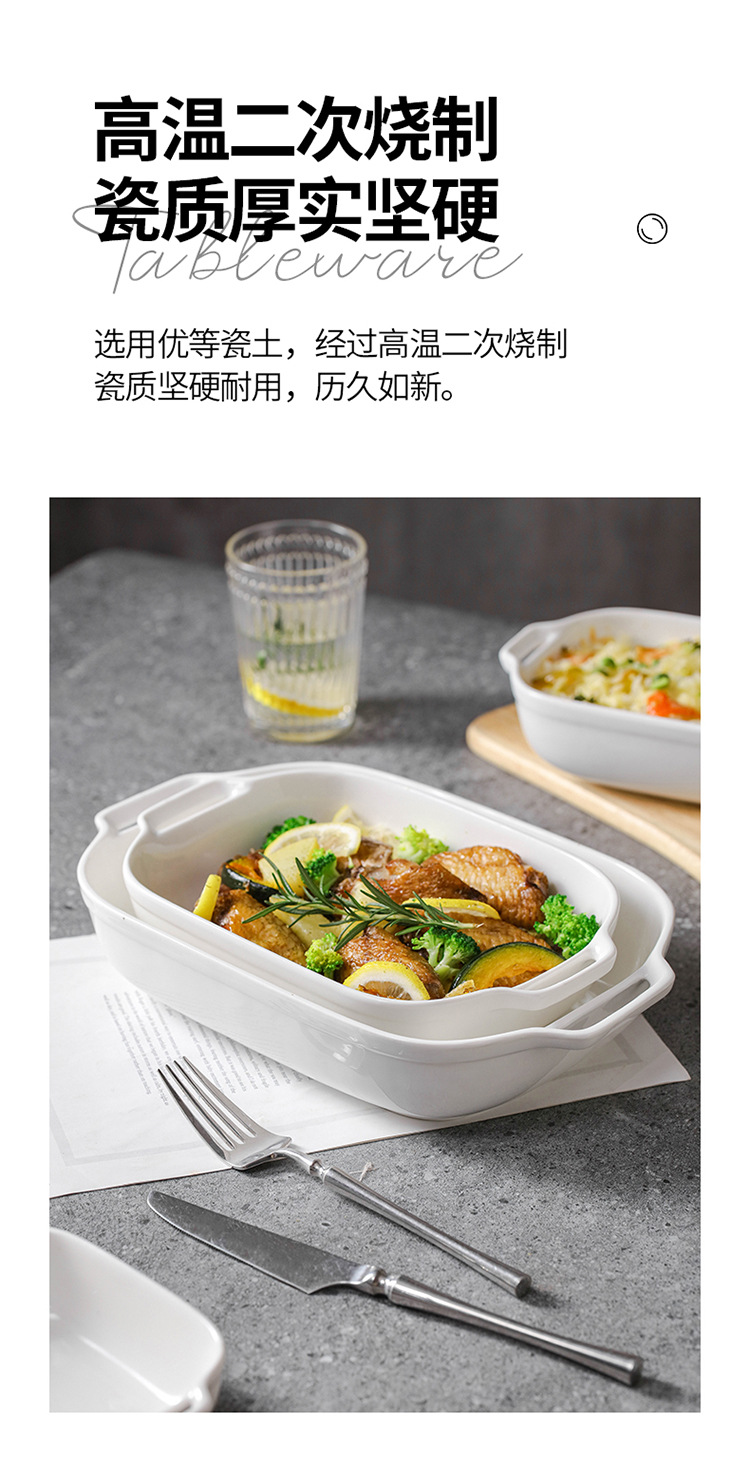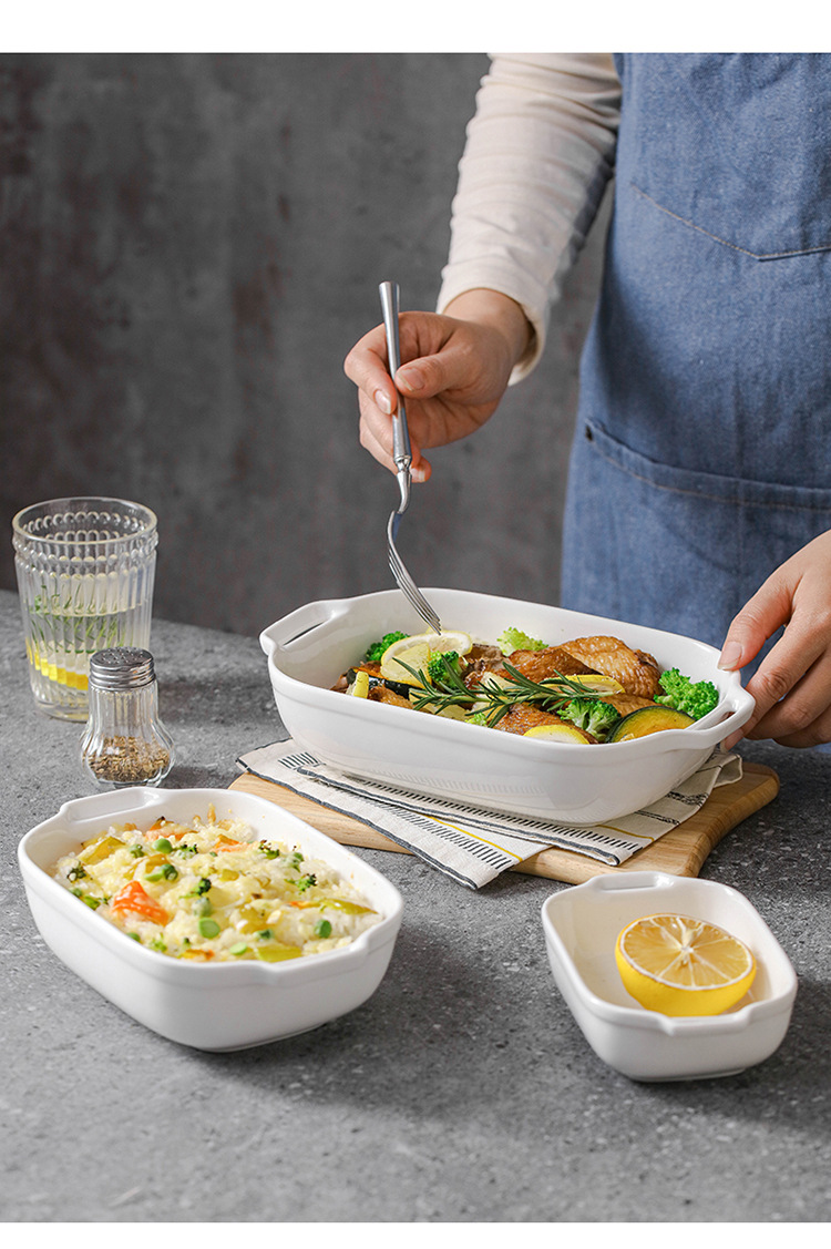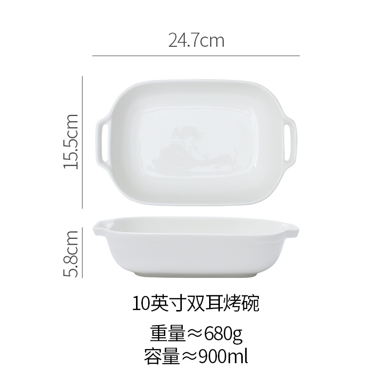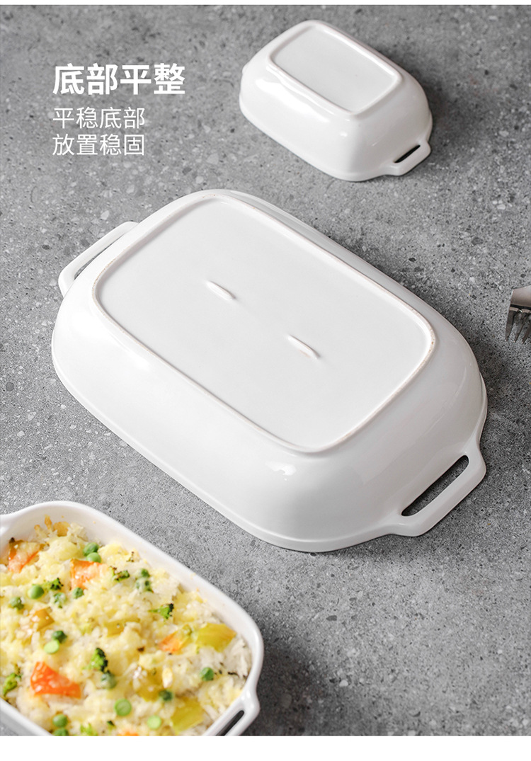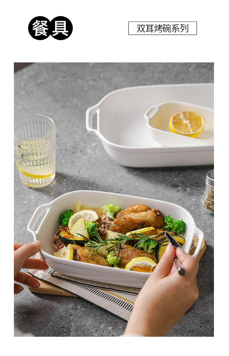 Simple pure white ceramic rectangular double ear baking tray, cheese baked rice bowl, heat-resistant household baking bowl, snack bowl, steamed fish dish
