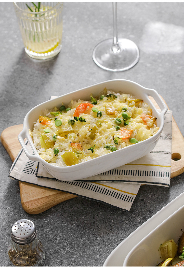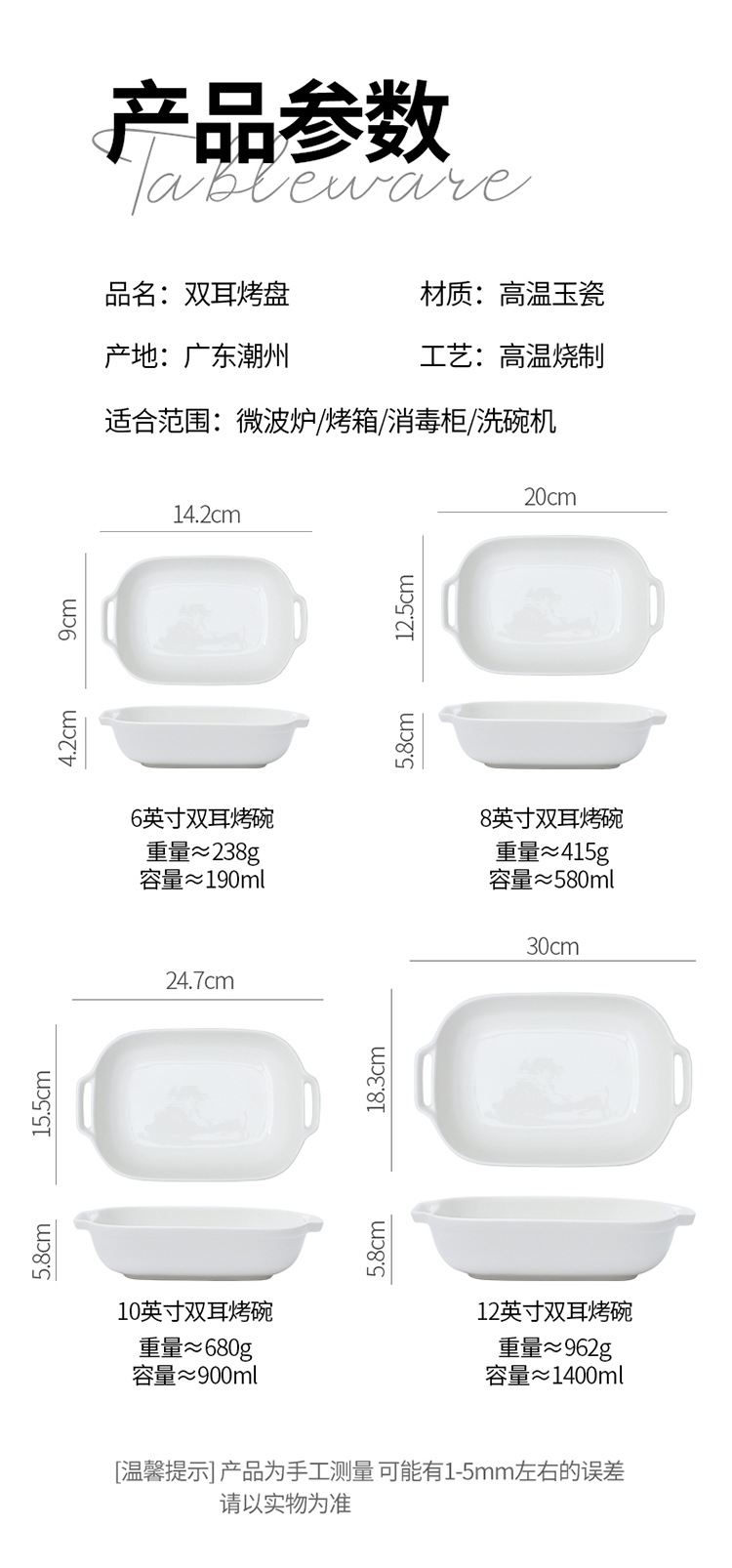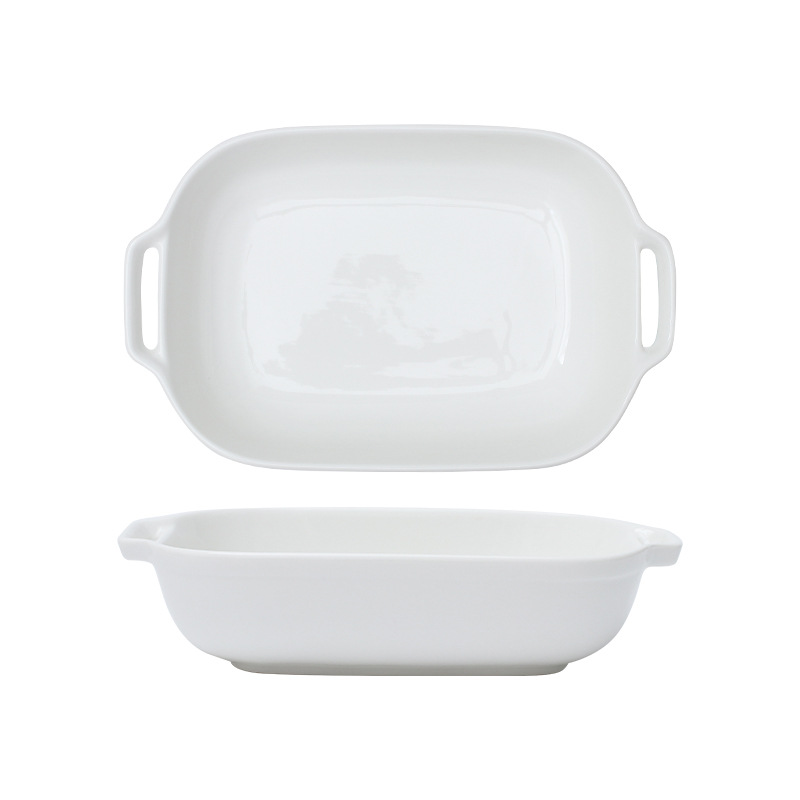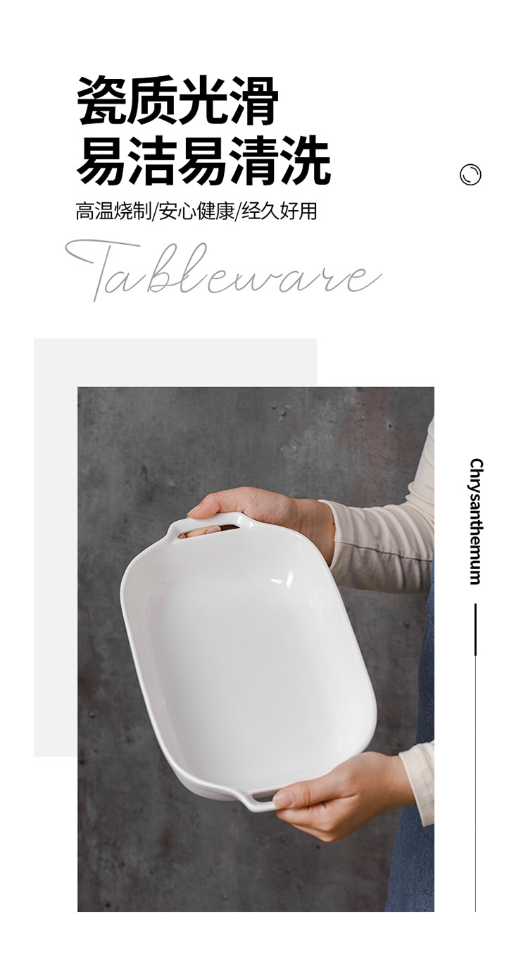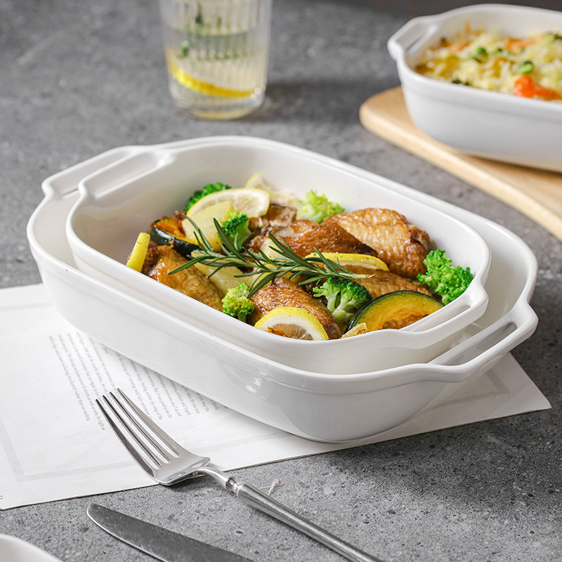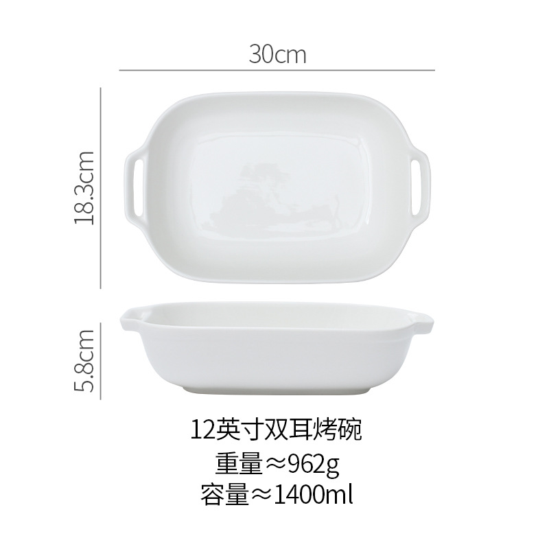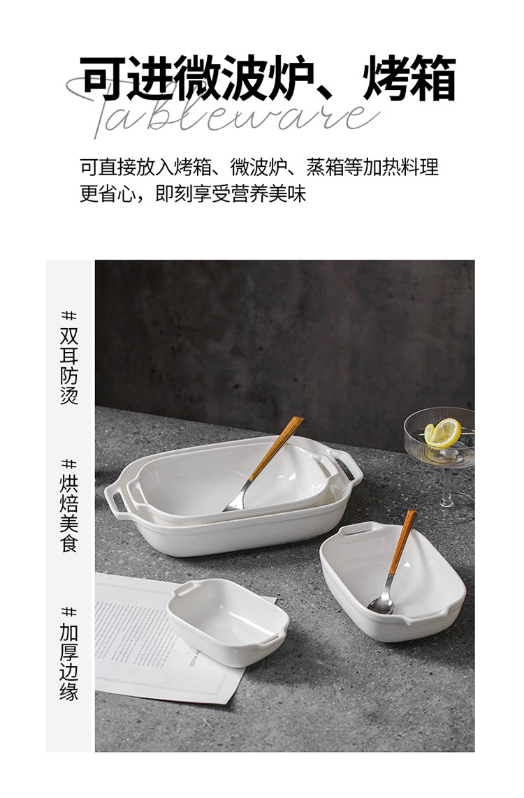 Simple pure white ceramic rectangular double ear baking tray, cheese baked rice bowl, heat-resistant household baking bowl, snack bowl, steamed fish dish
