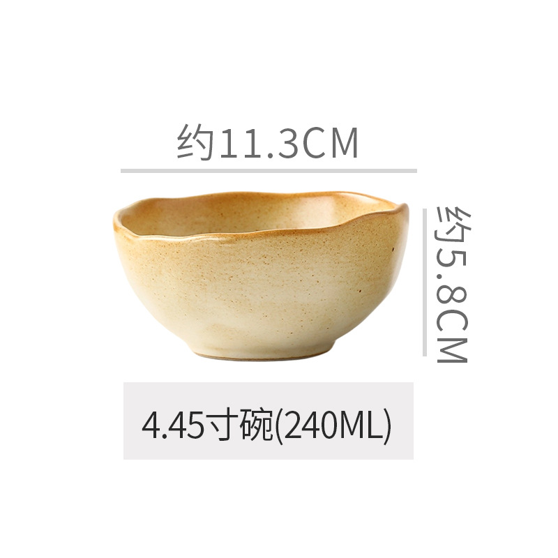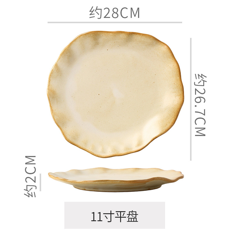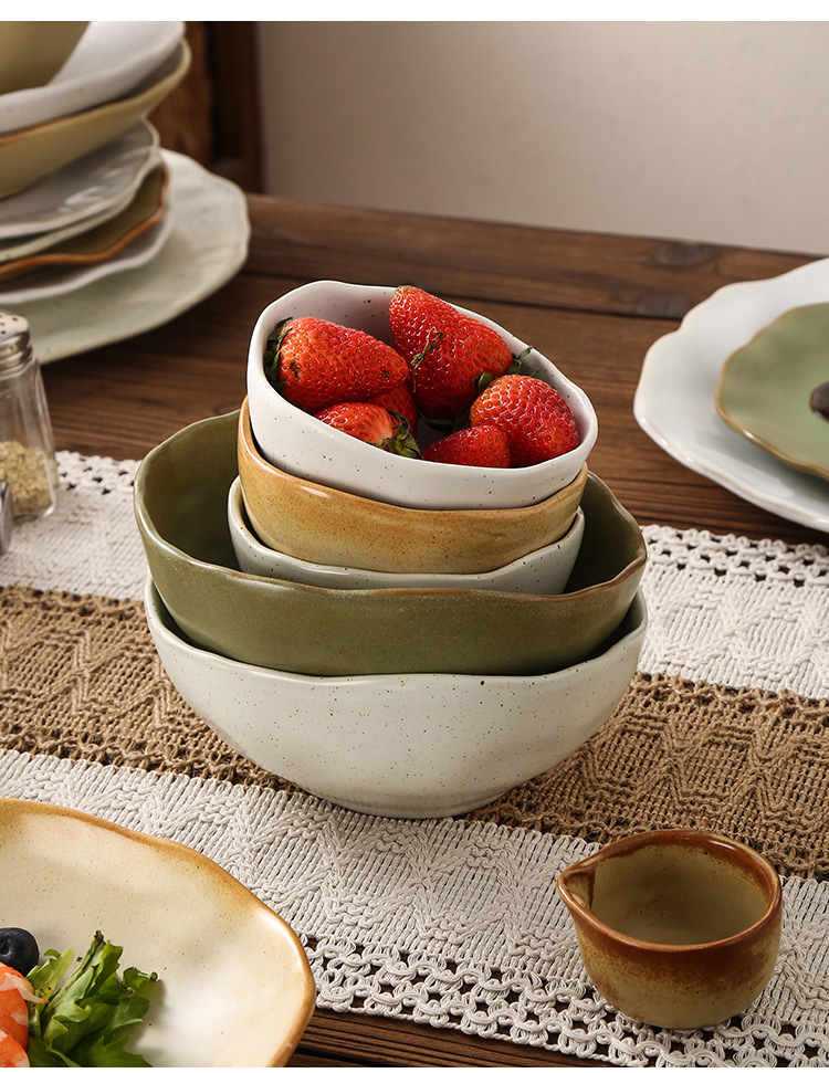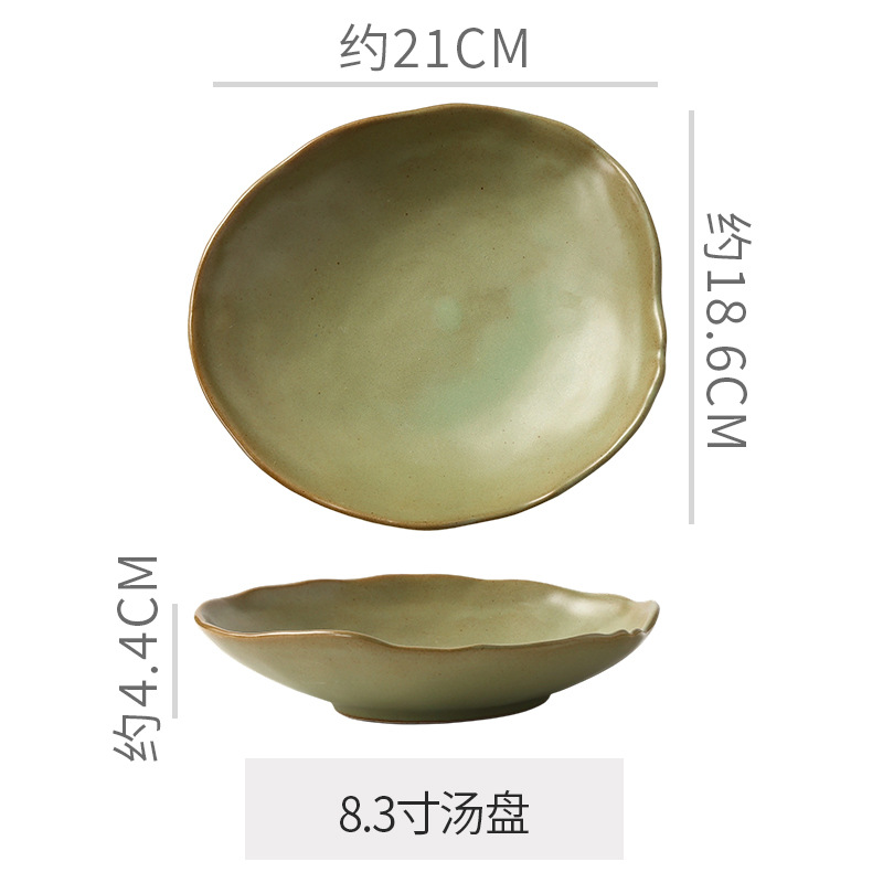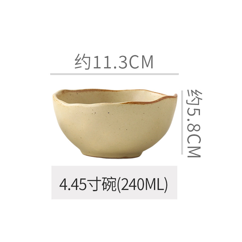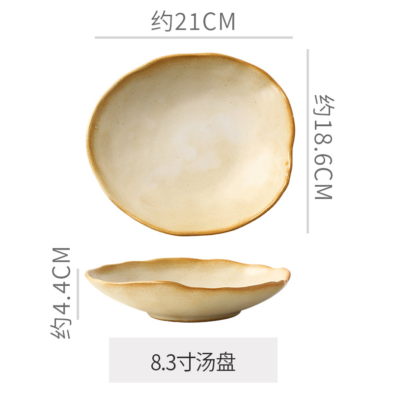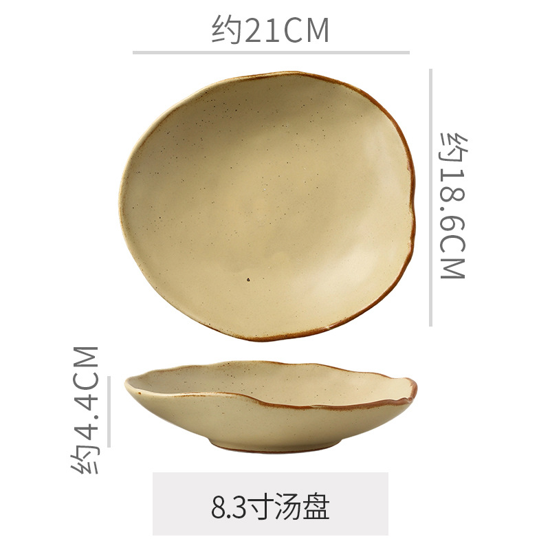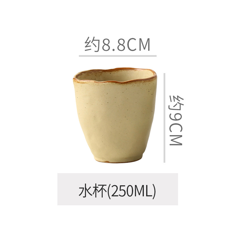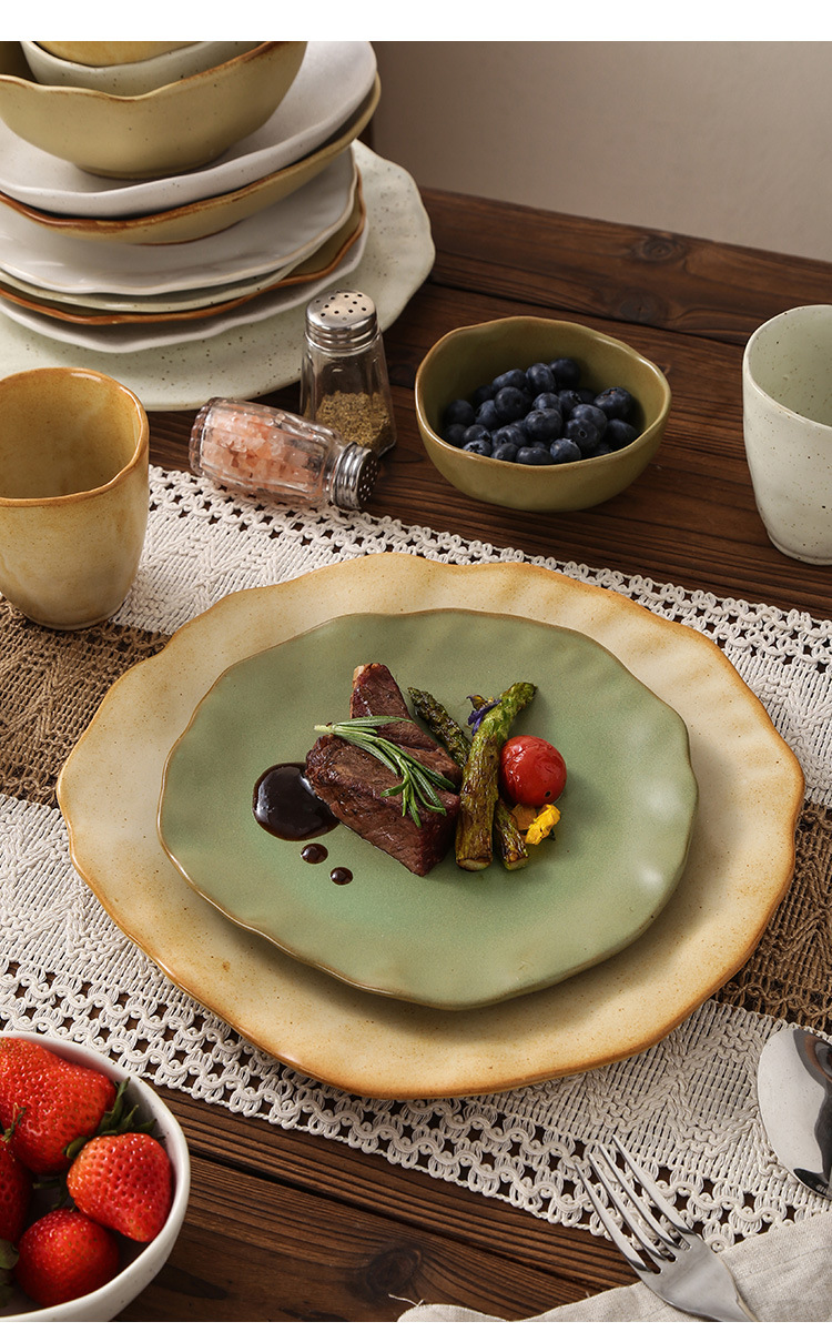 Retro style coarse pottery heat-resistant tableware for household use, including vegetable dishes, rice bowls, soup bowls, water cups, and shaped kiln style dining plates. Creative arrangement of plates