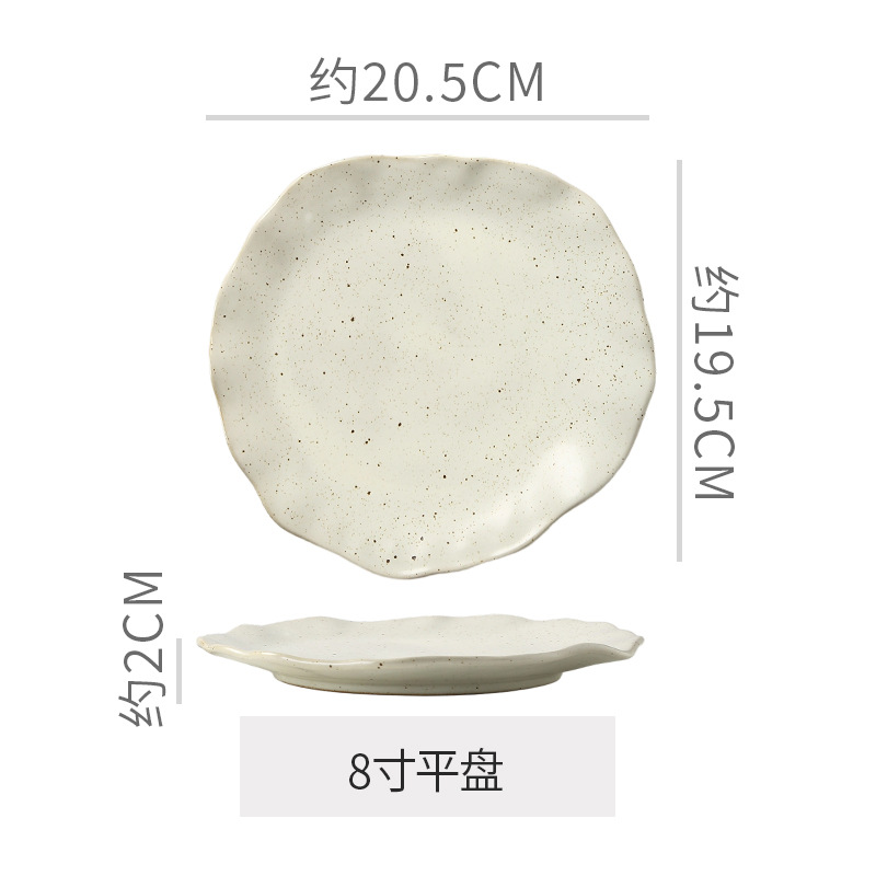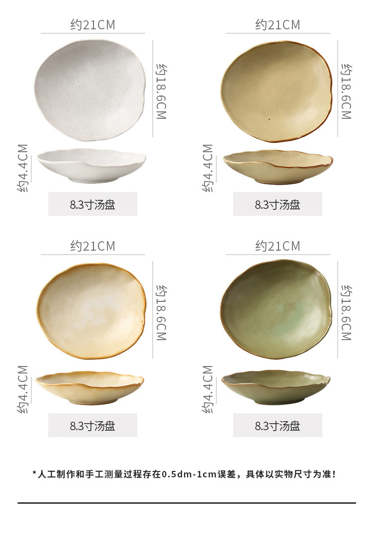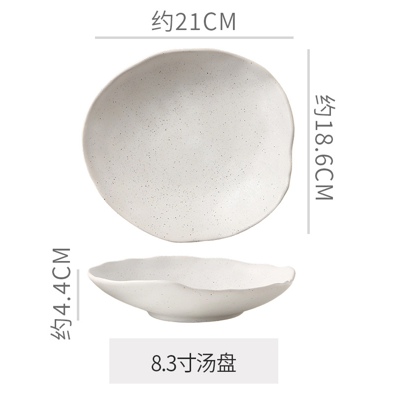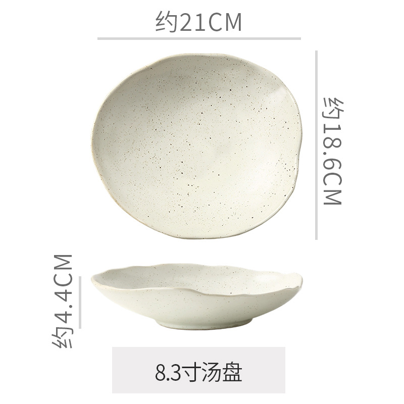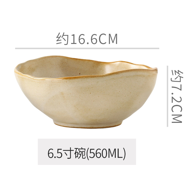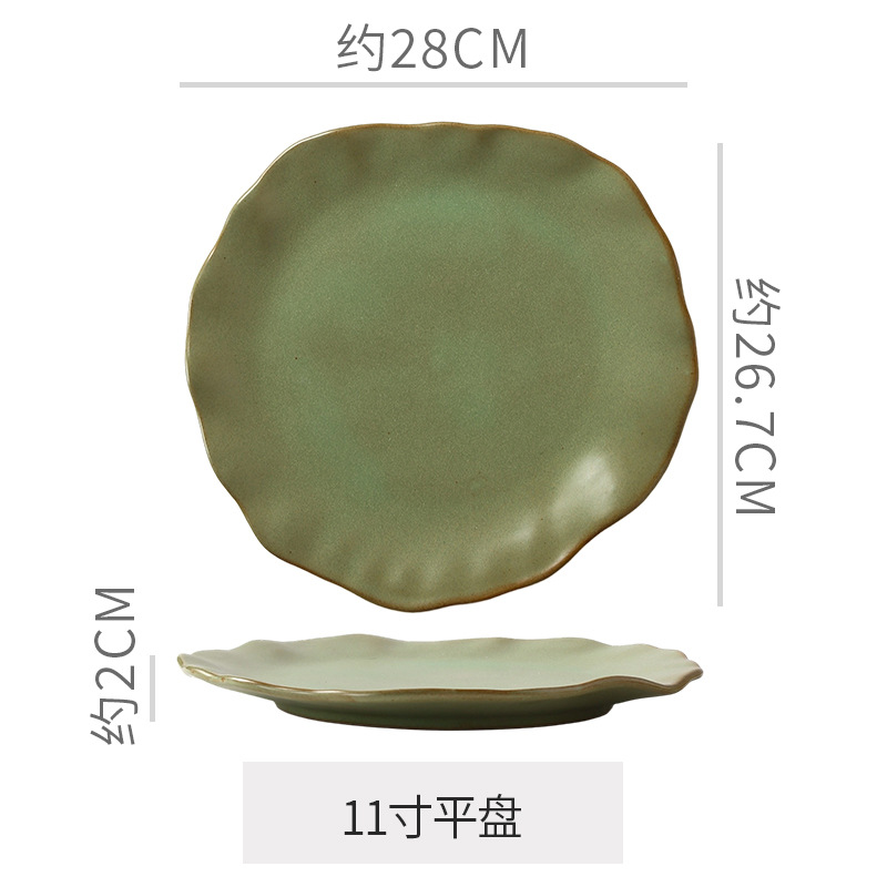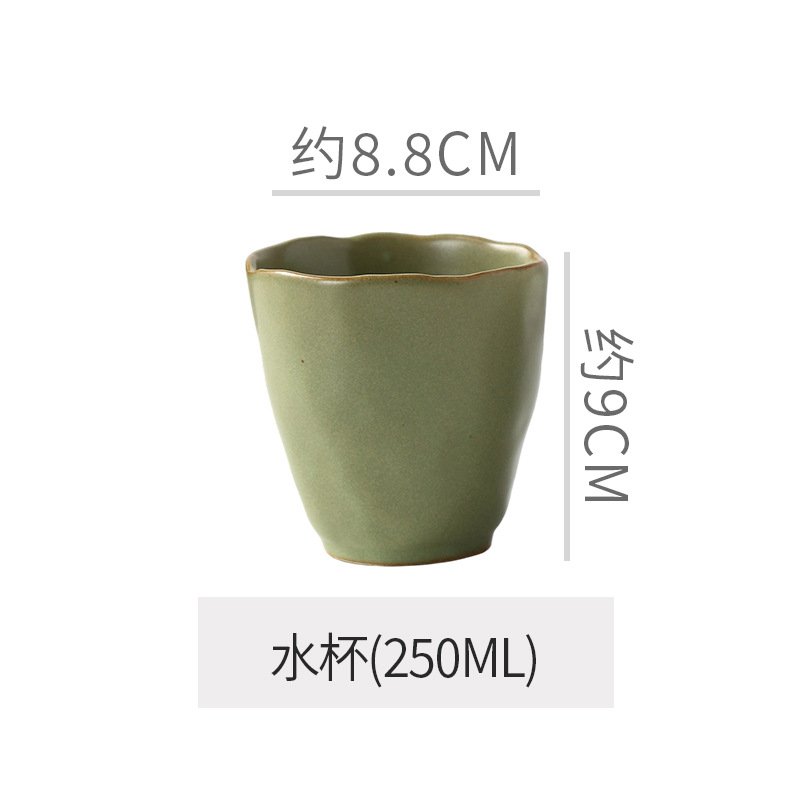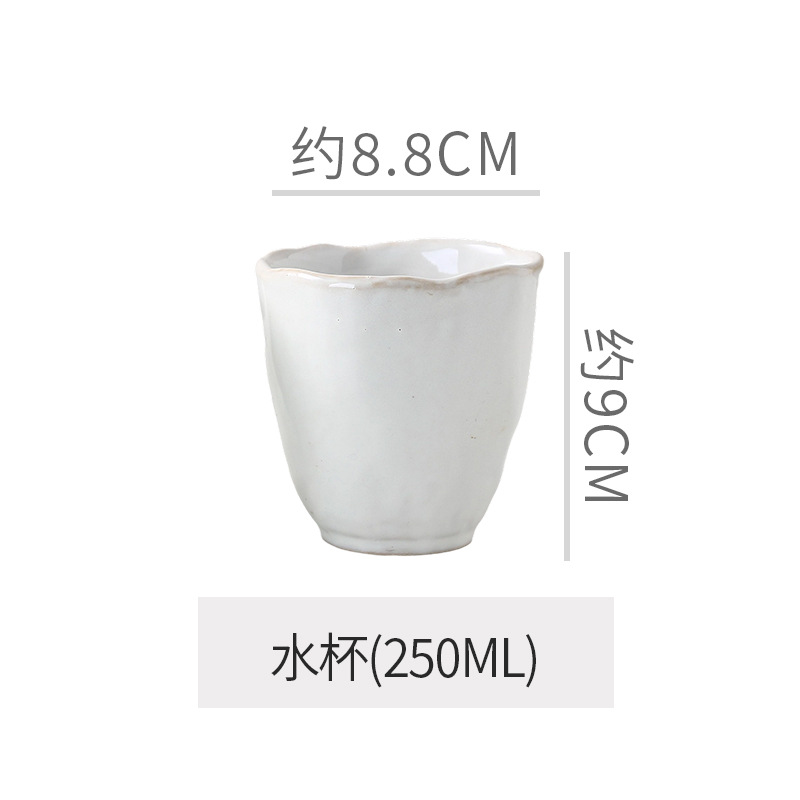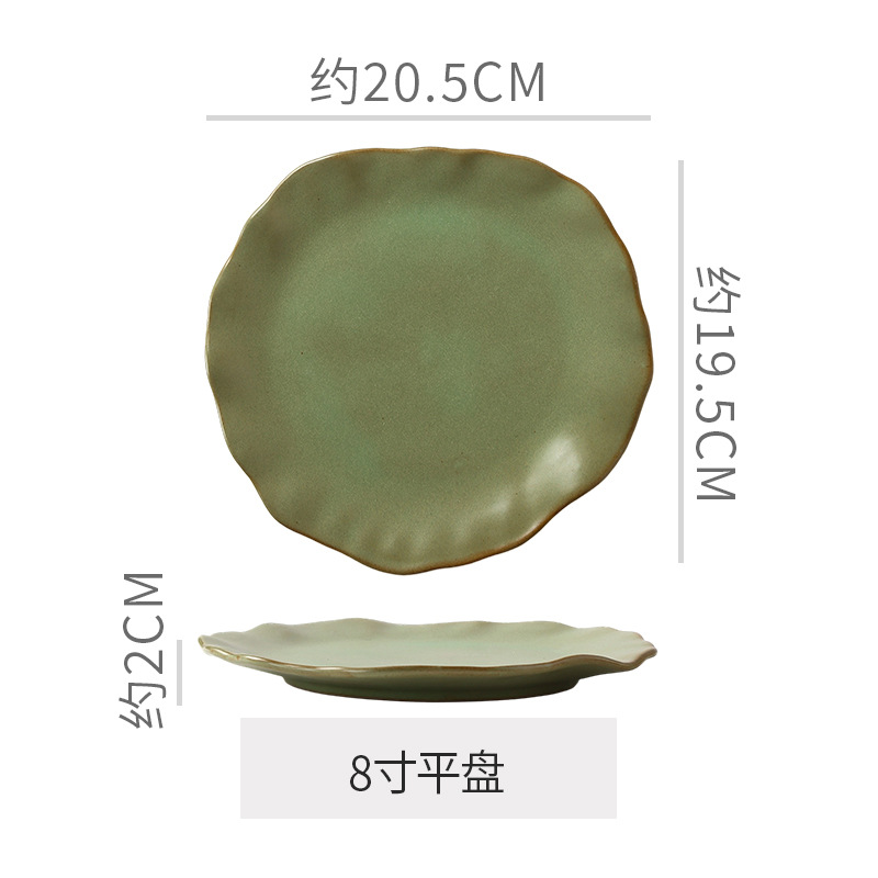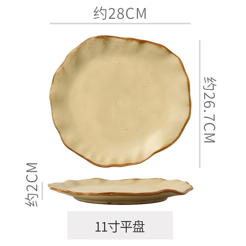 Retro style coarse pottery heat-resistant tableware for household use, including vegetable dishes, rice bowls, soup bowls, water cups, and shaped kiln style dining plates. Creative arrangement of plates