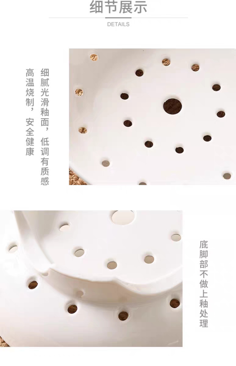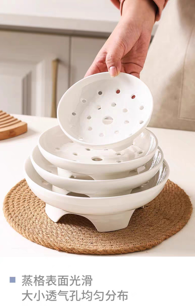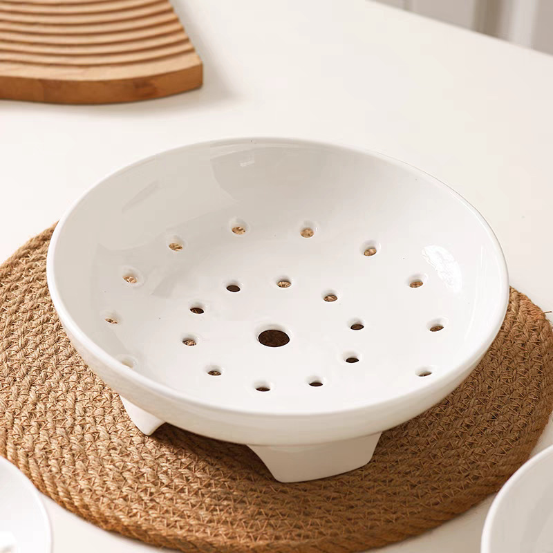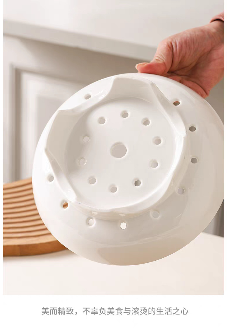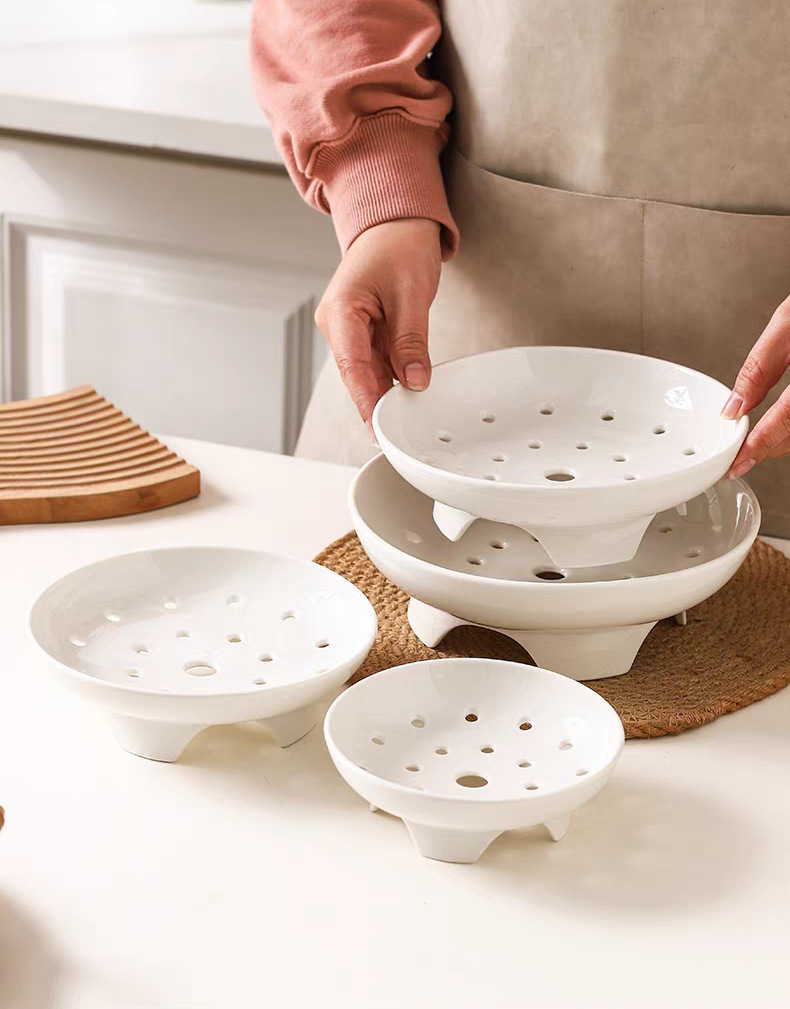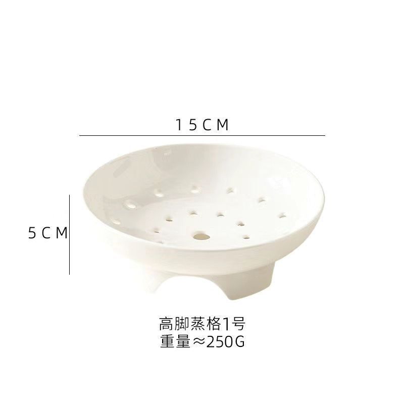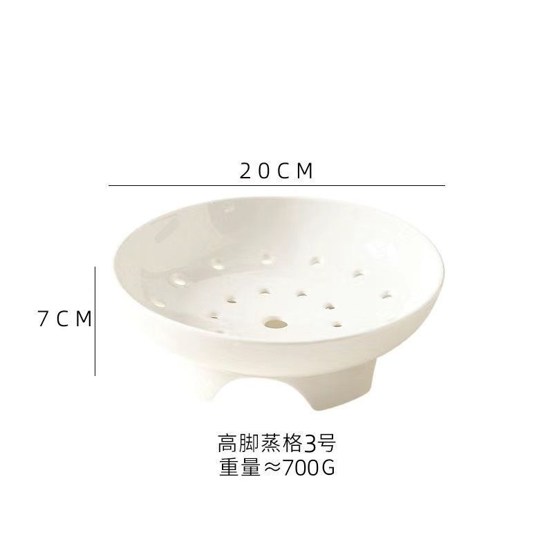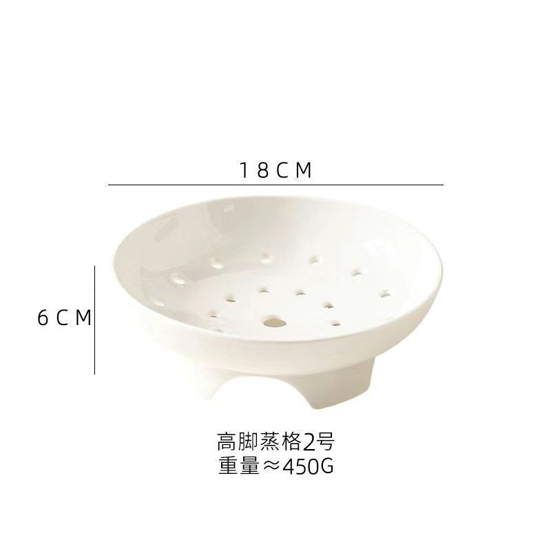 High footed steaming tray, ceramic tableware, creative tray, pure white household oil control bowl, large vegetable dish, fruit double-layer drainage plate