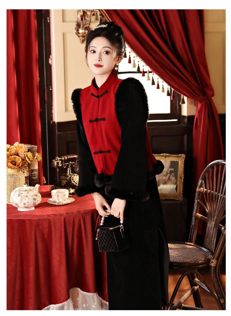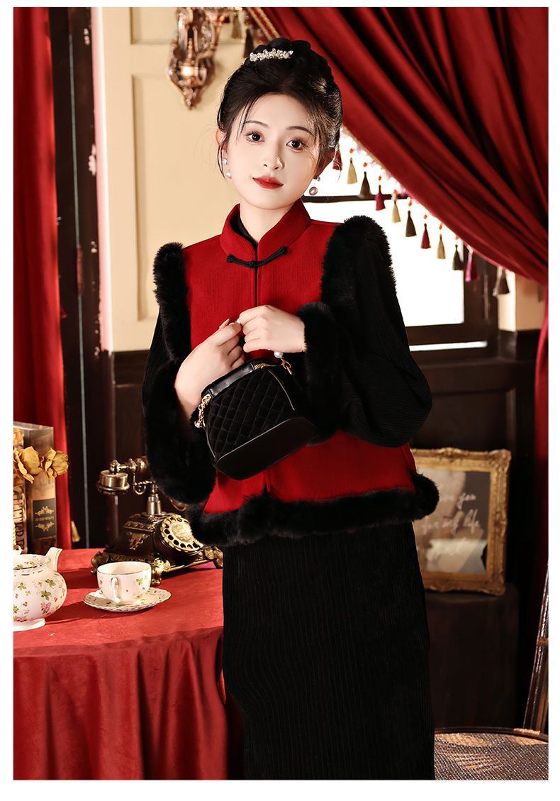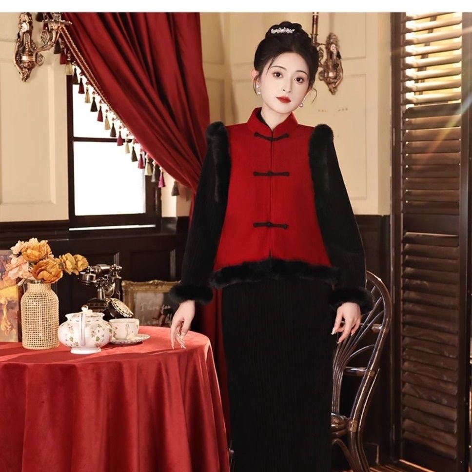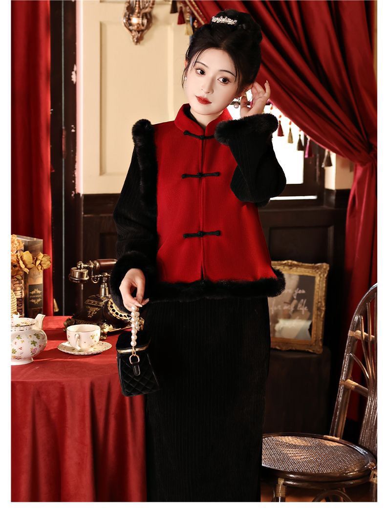 Black cheongsam set with thick velvet for autumn and winter Chinese New Year, women's adult New Year's greetings, Hanfu, Tang style, national style vest jacket