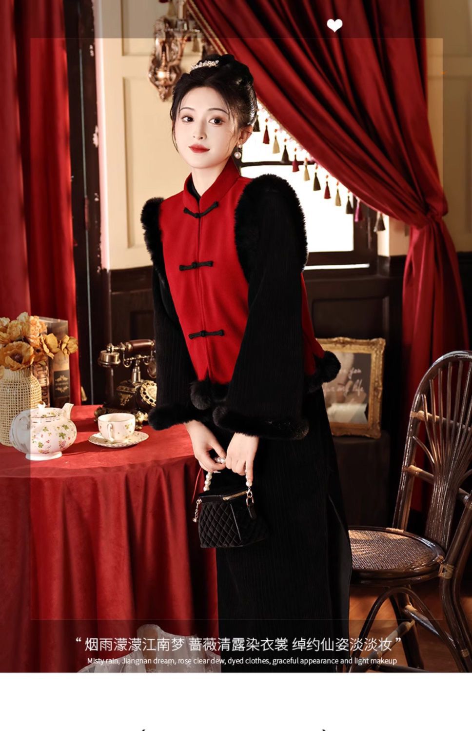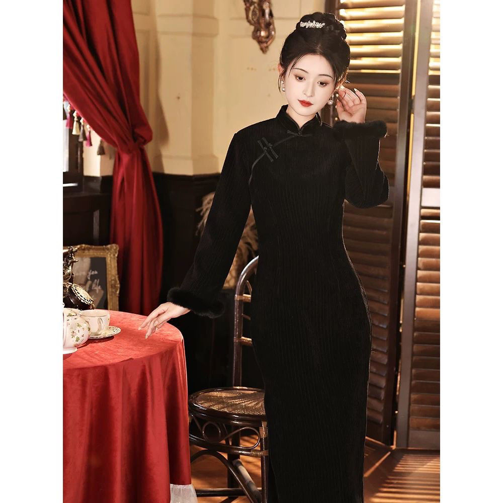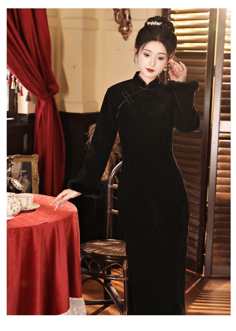 Black cheongsam set with thick velvet for autumn and winter Chinese New Year, women's adult New Year's greetings, Hanfu, Tang style, national style vest jacket