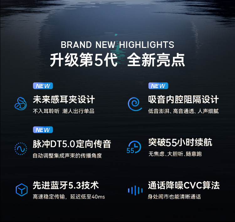 | функция | водонепроницаемый;шумоподавление;Костная проводимость;Дыхающий свет;сверхдлительная автономная работа;Функция разговора;Поддержка музыки;Режим сна;Электроспорт с низкой задержкой |