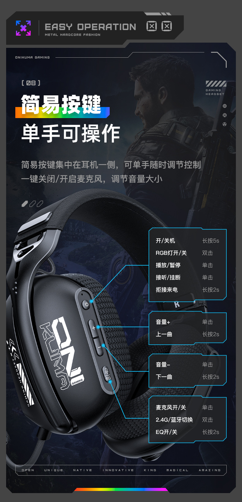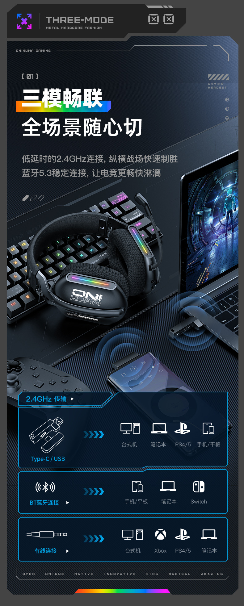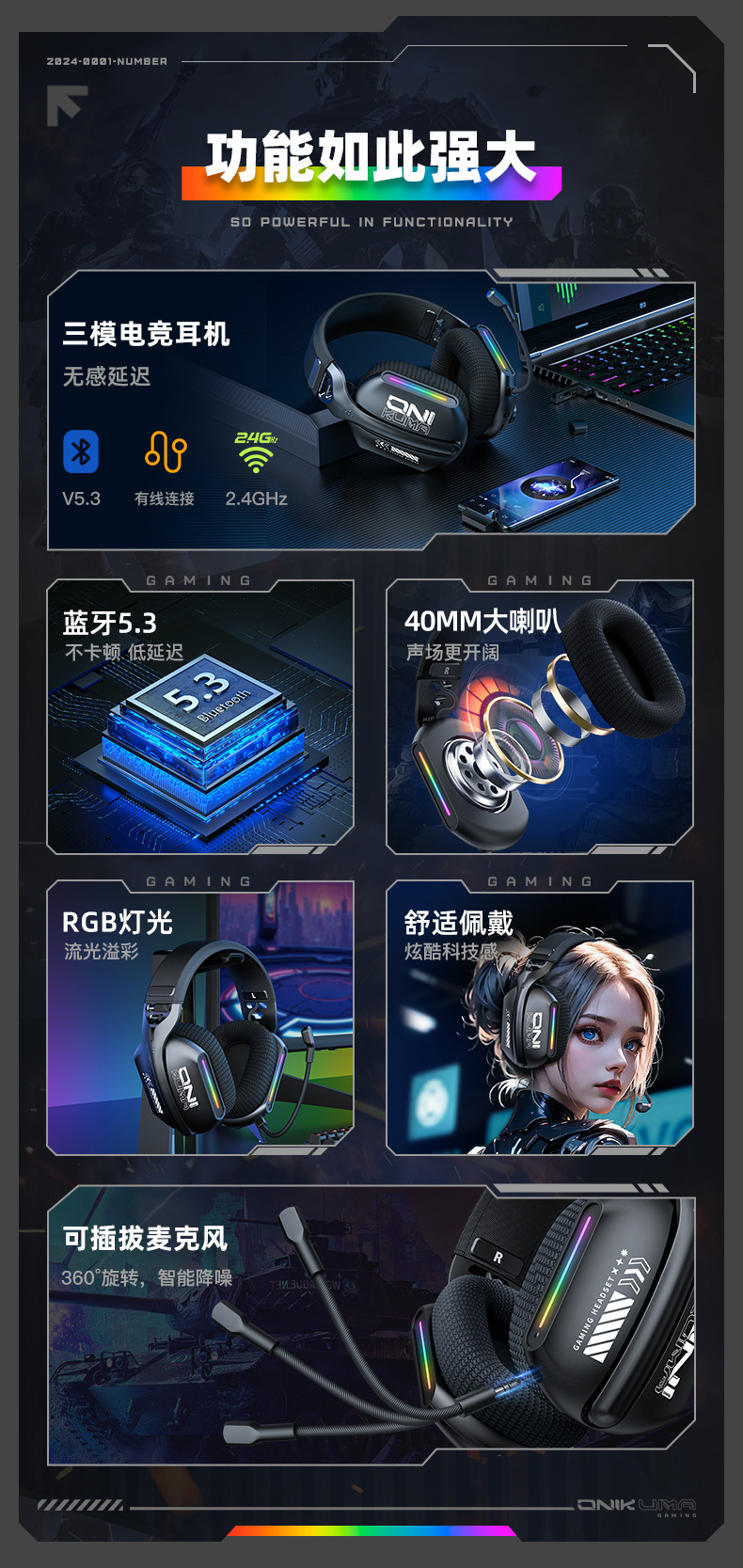 | 包装清单 | 耳机,充电线,耳机连接线,麦克风,USB dongle, 8国语言说明书 |