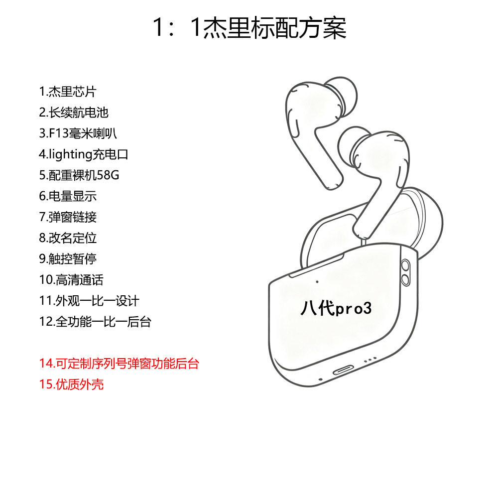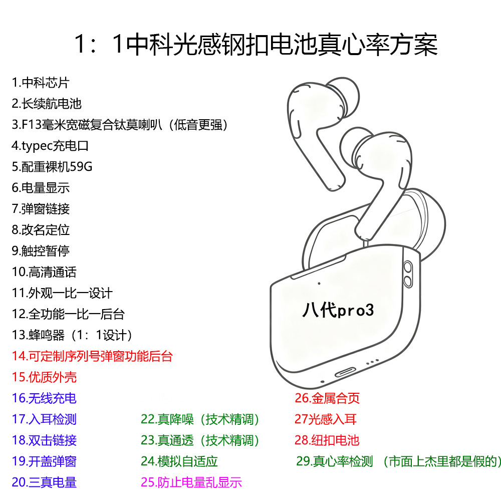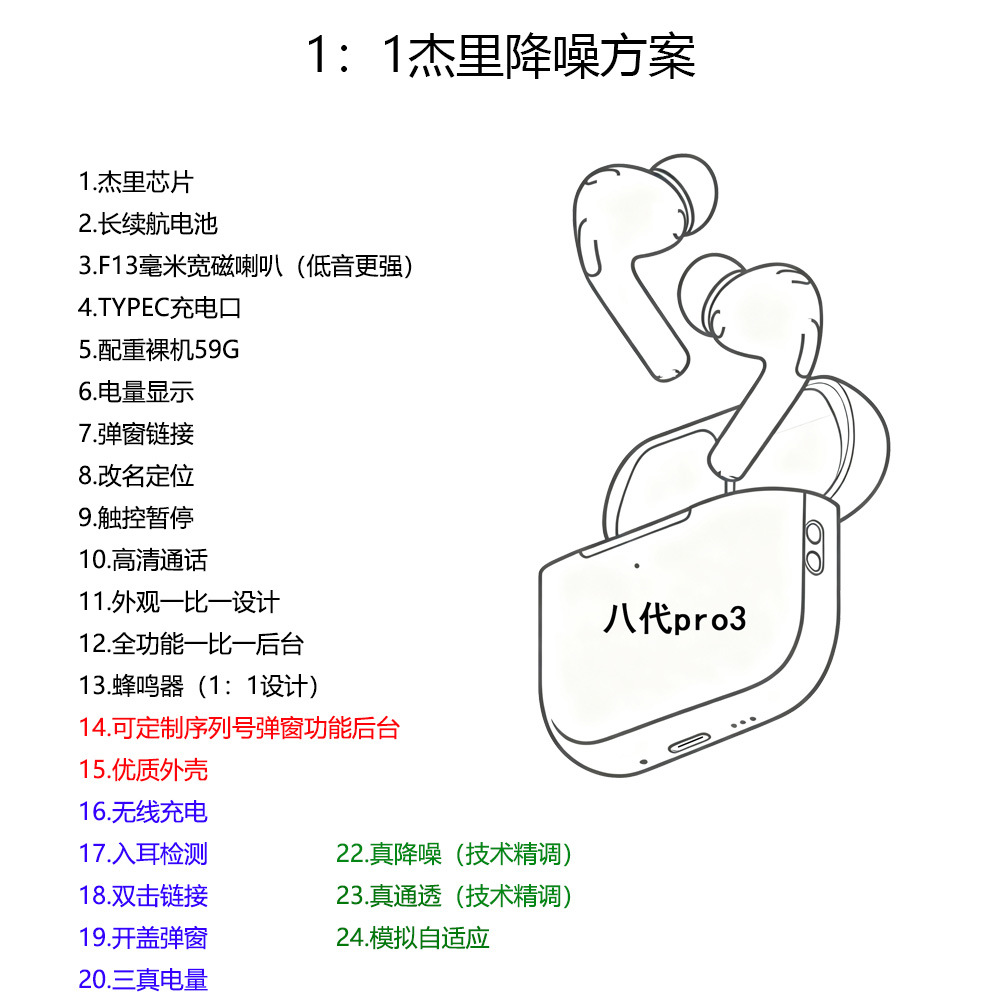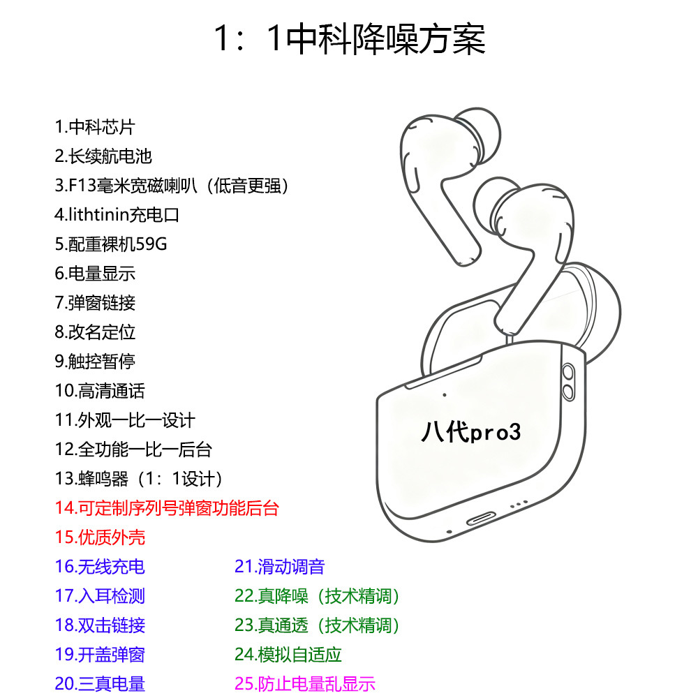 控制方式:入耳检测(体感)无线充电+开盖连接+改名定位+降噪模式+通透模式+空间音频+蜂鸣器全套+滑动音量调节窗