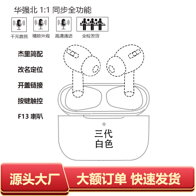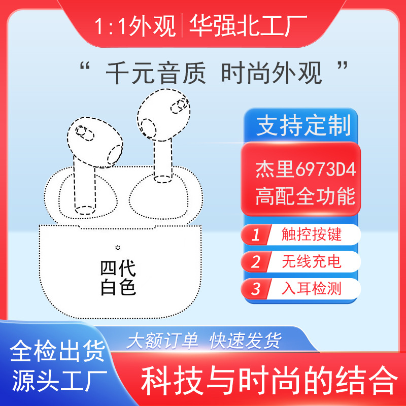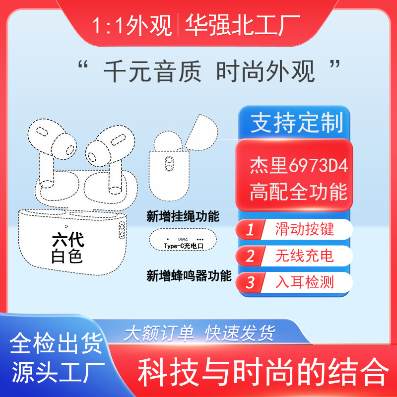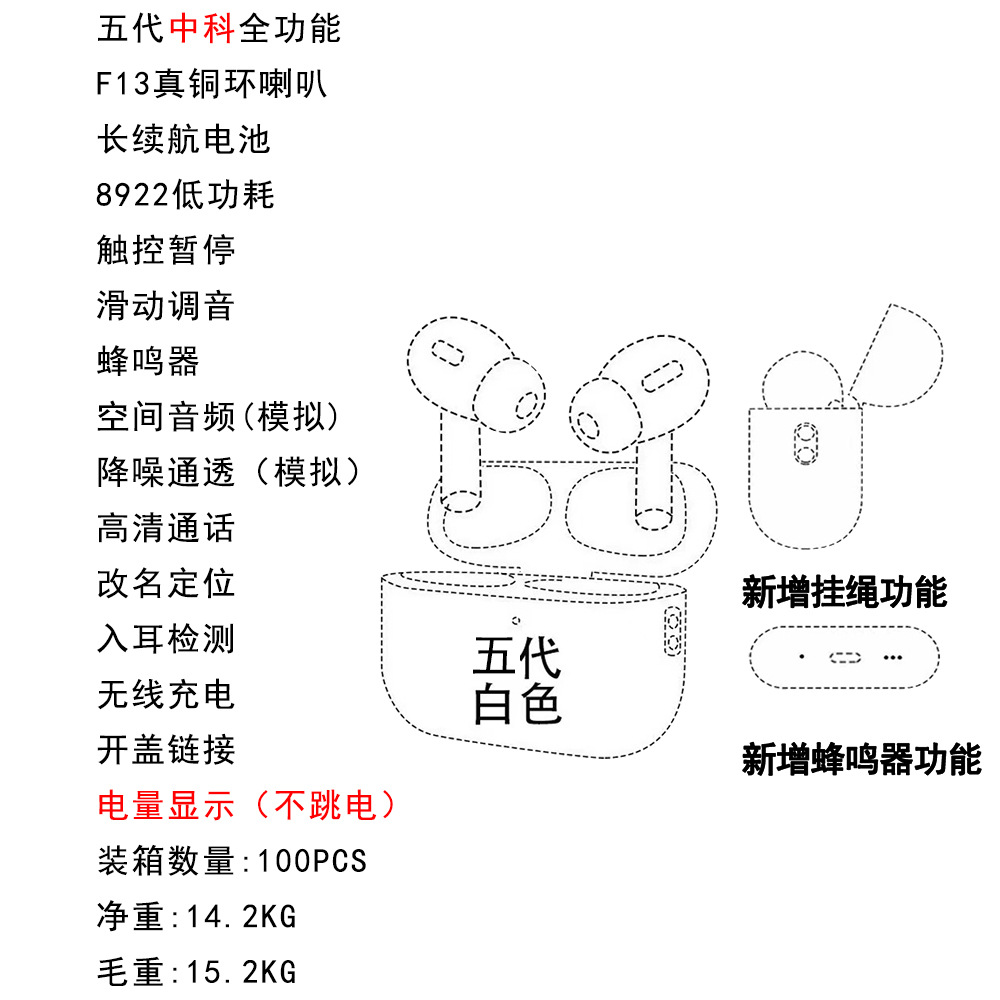 控制方式:入耳检测(光感) +降噪模式(真实)+通透模式(真实)+蜂鸣器+滑动音量调节+无线充电+开盖连接+改名定位+空间音频