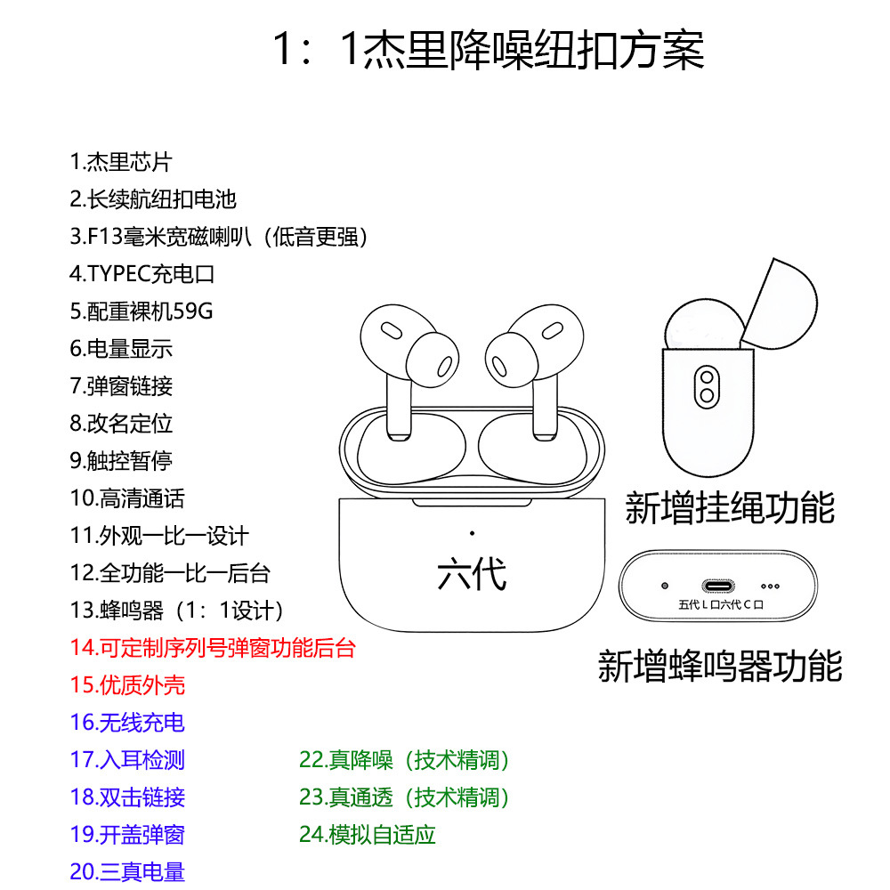 控制方式:入耳检测(体感)无线充电+开盖连接+改名定位+降噪模式(真降噪)+通透模式(真降噪)+空间音频+蜂鸣器全套+滑动音量调节窗