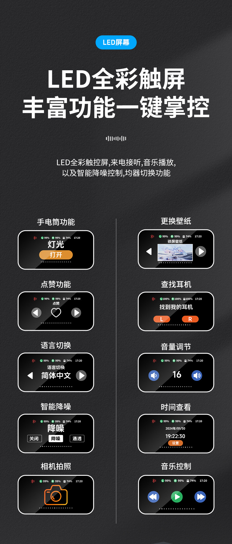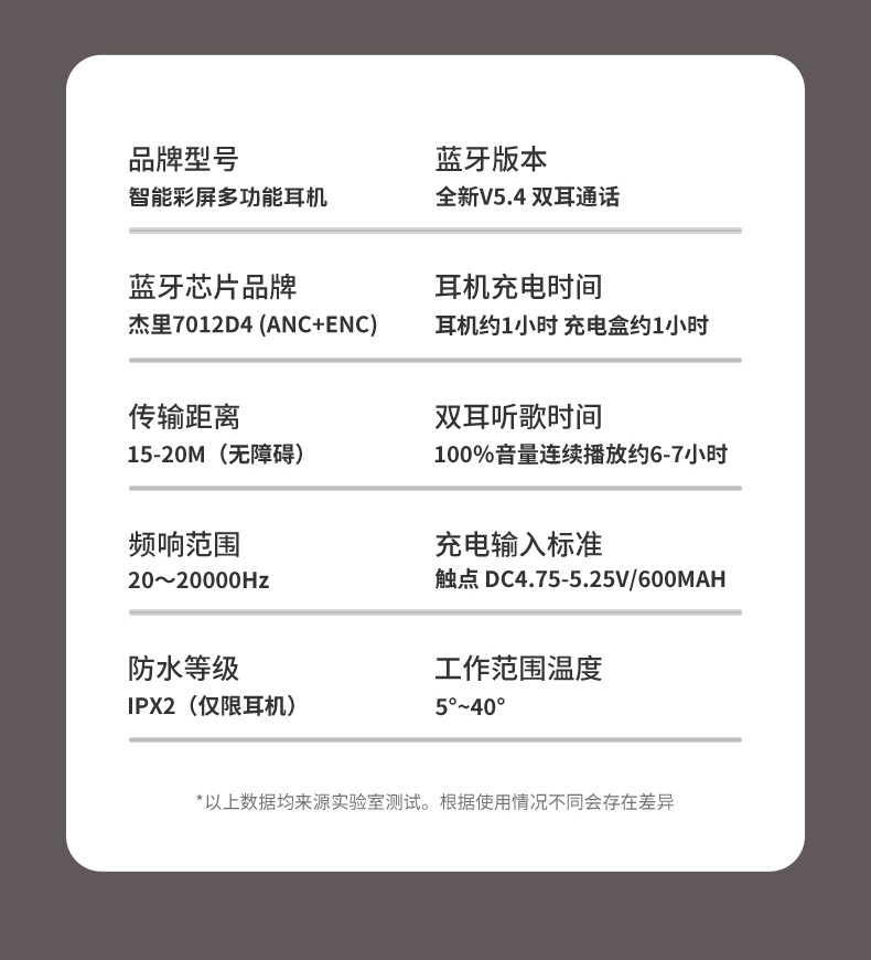 | 功能 | 防水;降噪;超长续航;通话功能;语音控制;支持音乐;数显屏幕;电竞低延迟;其他 |