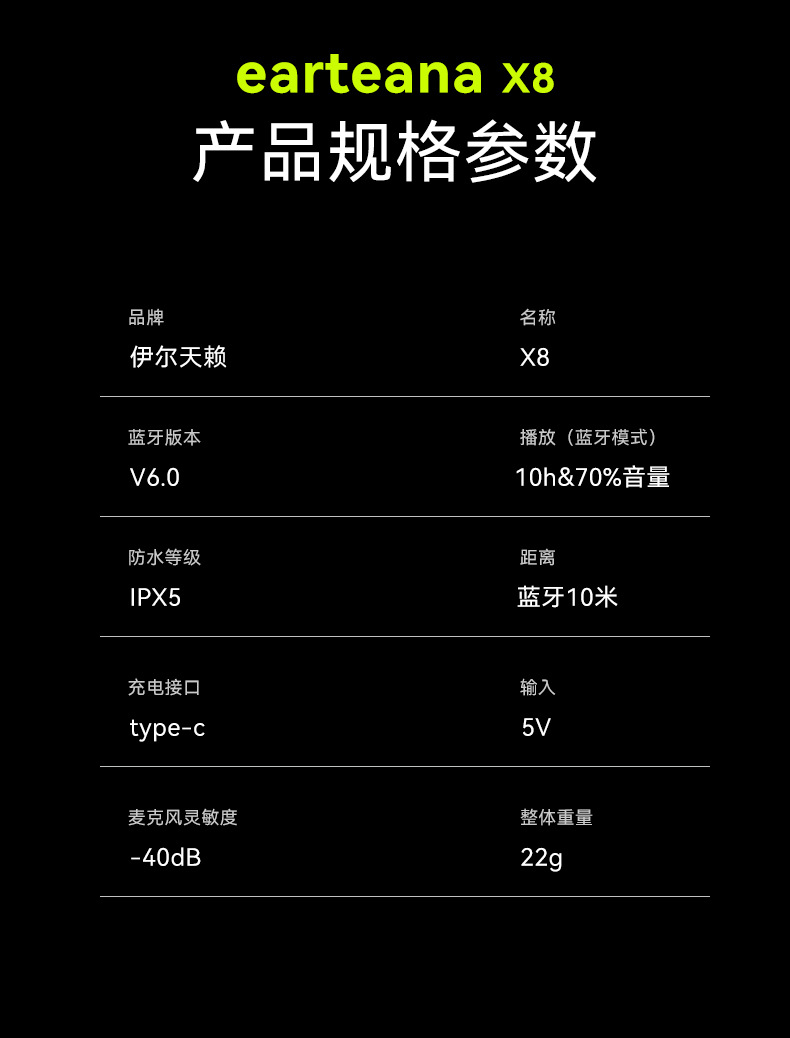 | функция | Тяжелый бас стерео Bluetooth Соединение Функция звонка Нет ощущения Ношение автономного микрофона Длинная продолжительность полета Поддержка музыки Водонепроницаемость |