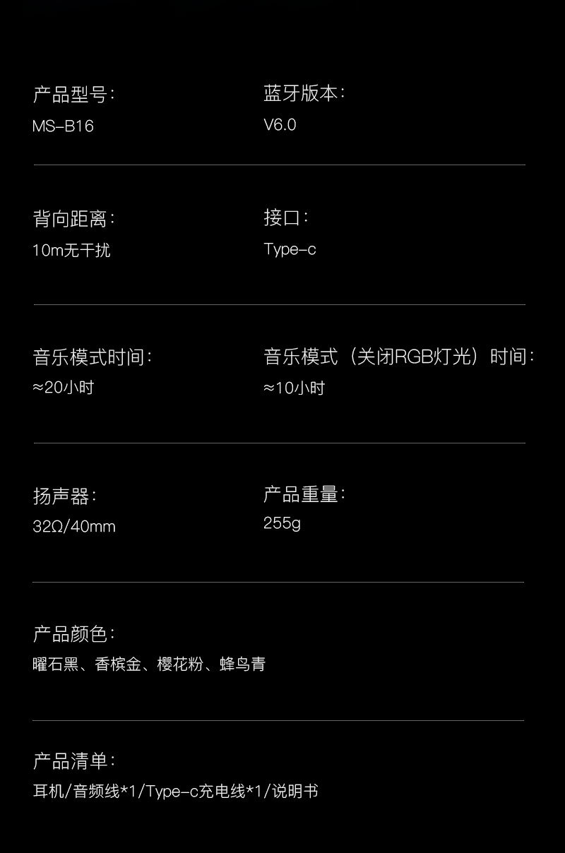| Packing List | Headphones+charging cable+audio cable+instruction manual |