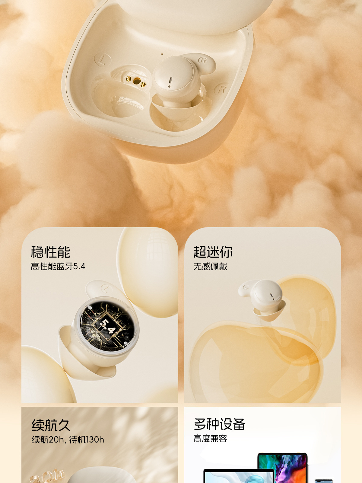 | 睡眠耳机运动耳机 | 软鲨鱼鳍设计,多点动态咬合,牢固,运动狂甩不掉;蓝牙5.4+陶瓷天线+智能防风噪,不卡顿、通话稳定 |