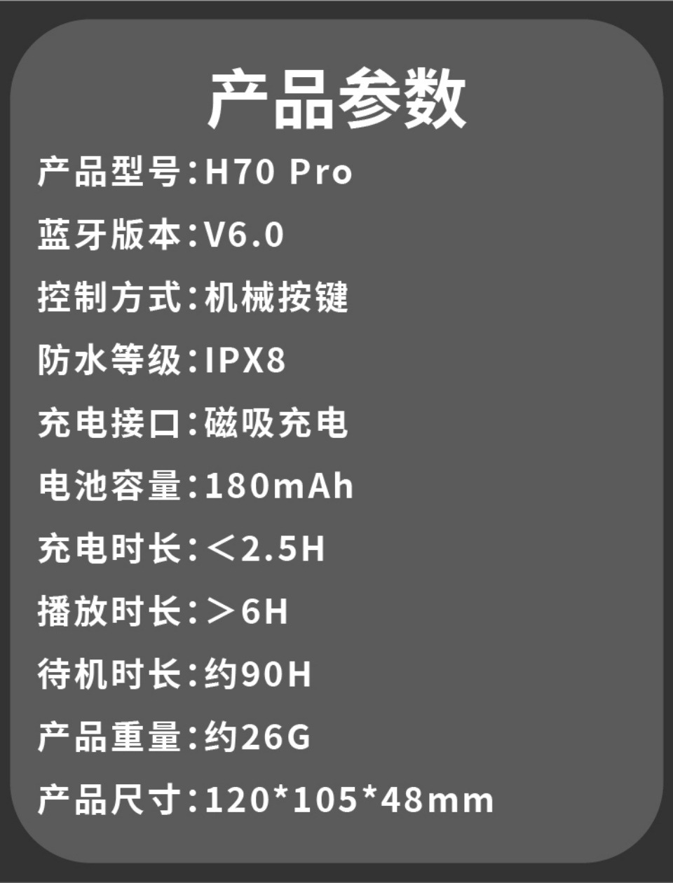 | 功能 | 防水;立体声;降噪;骨传导;呼吸灯;超长续航;通话功能;支持音乐;睡眠模式 |
