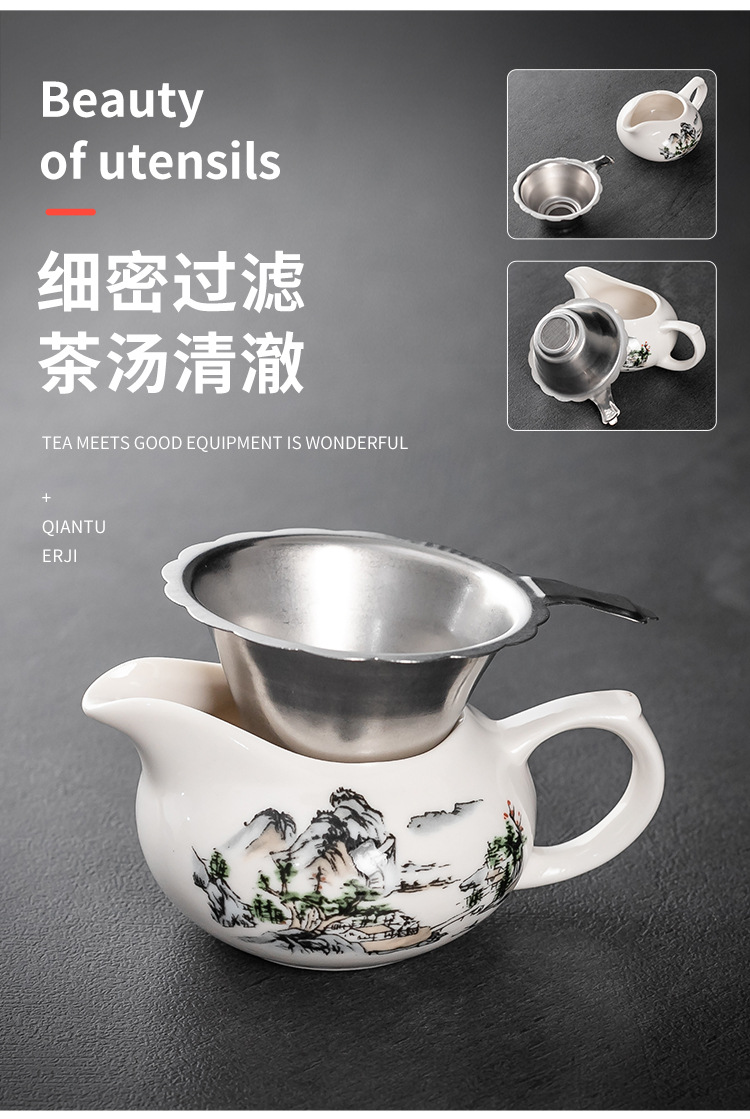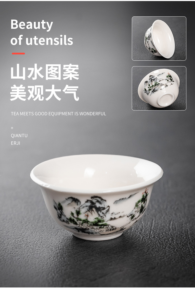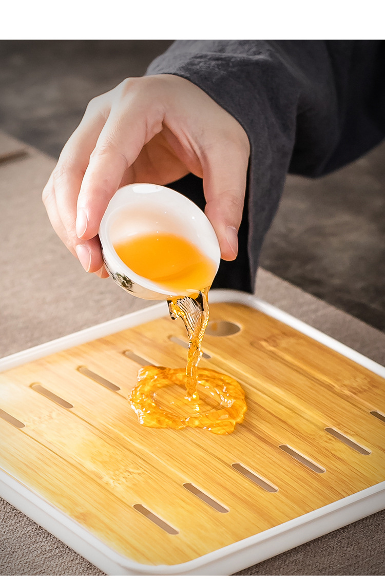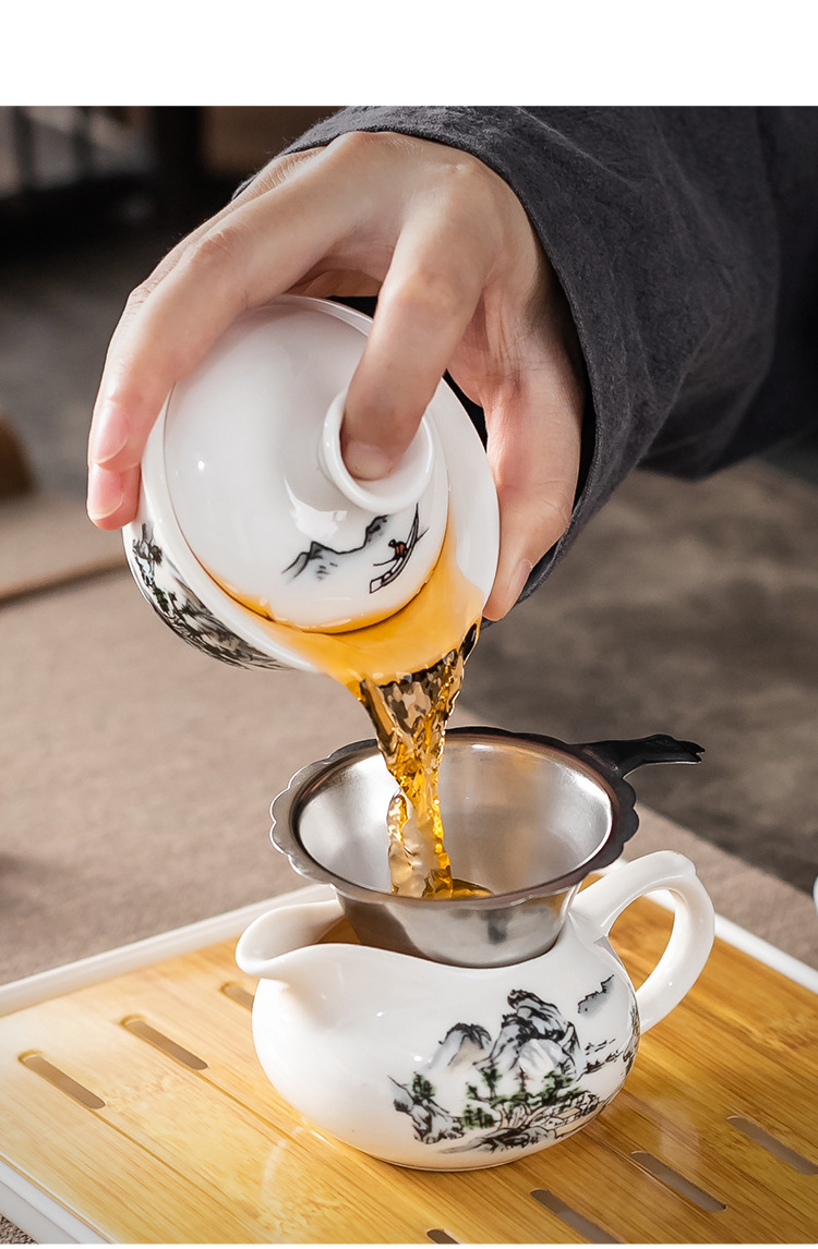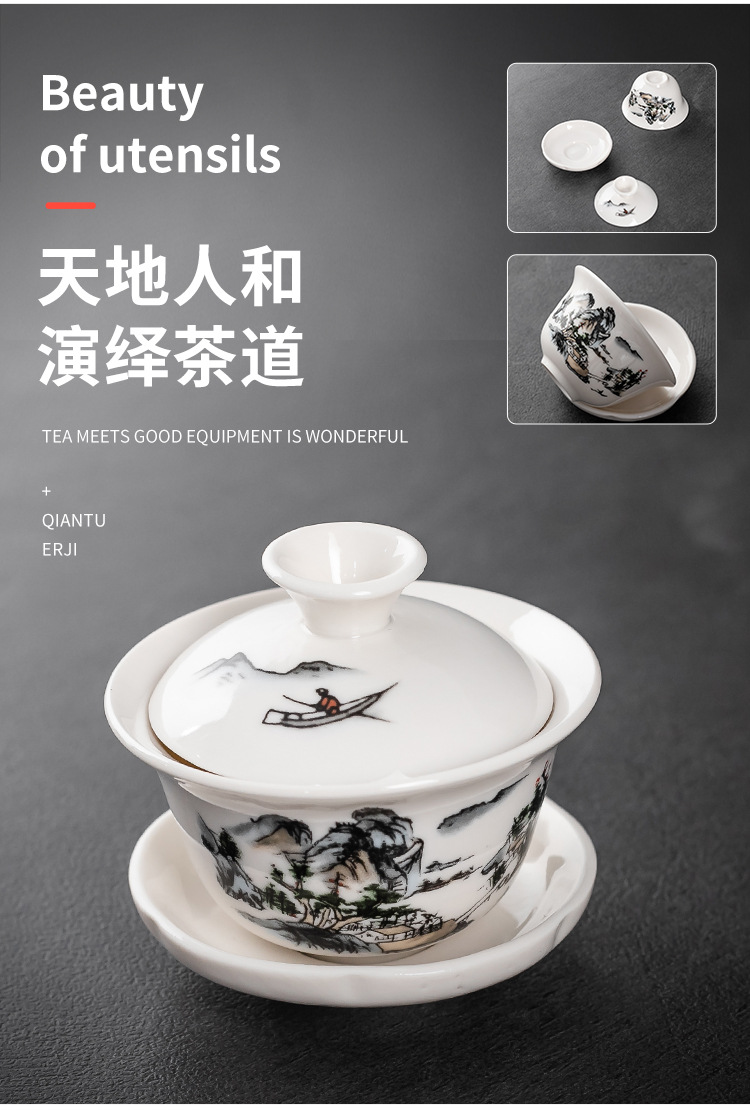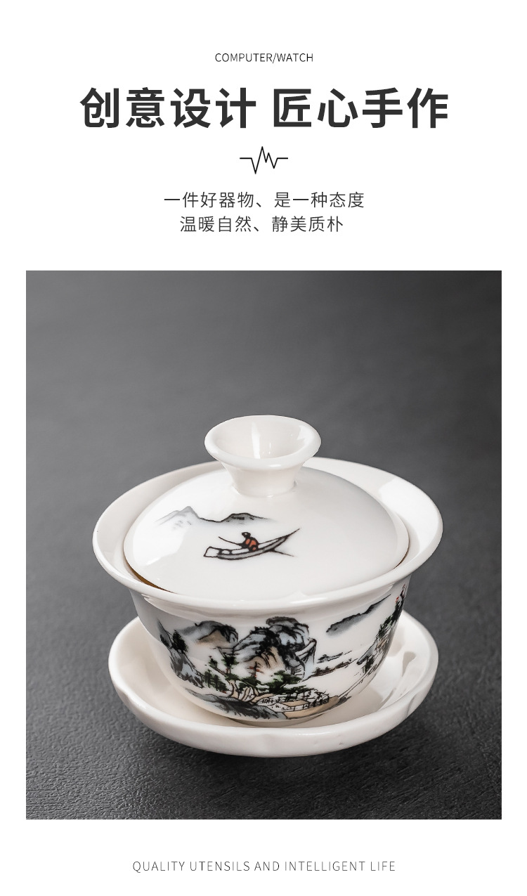 Home Kung Fu tea set with one lid bowl and three simple cups for brewing tea and entertaining guests. Ceramic tea cups for drinking tea and dry tea trays