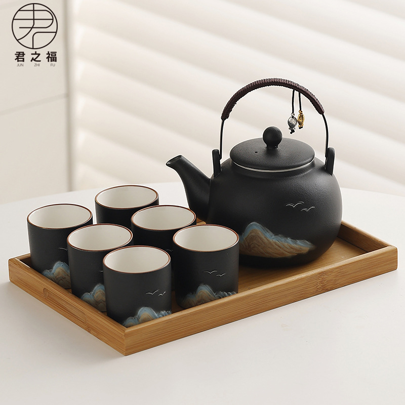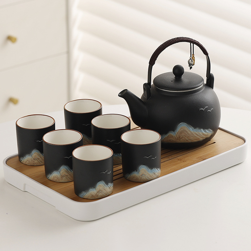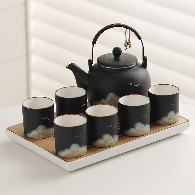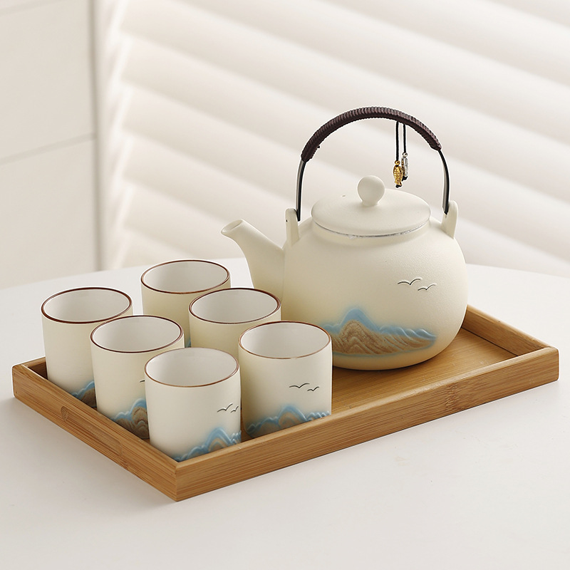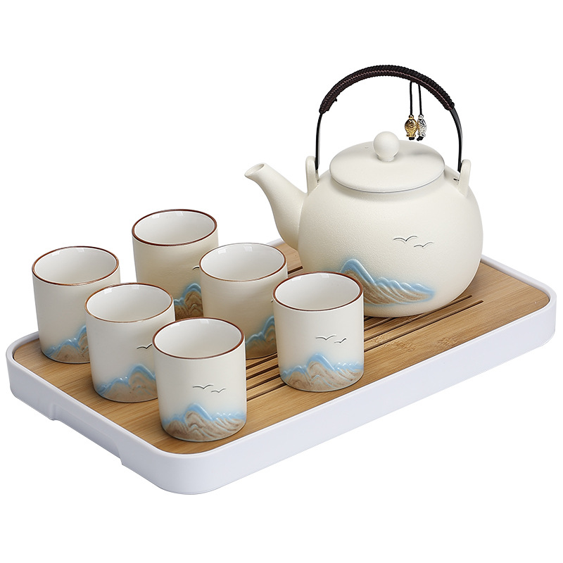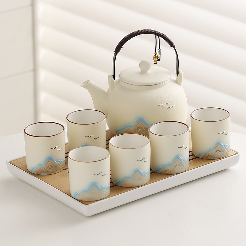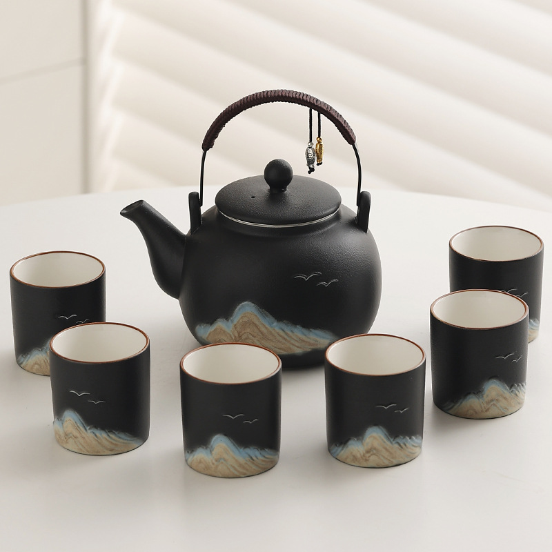 Cross border ceramic frosted glaze large capacity lifting beam teapot tea set, Japanese style simple relief distant mountain teapot cup set