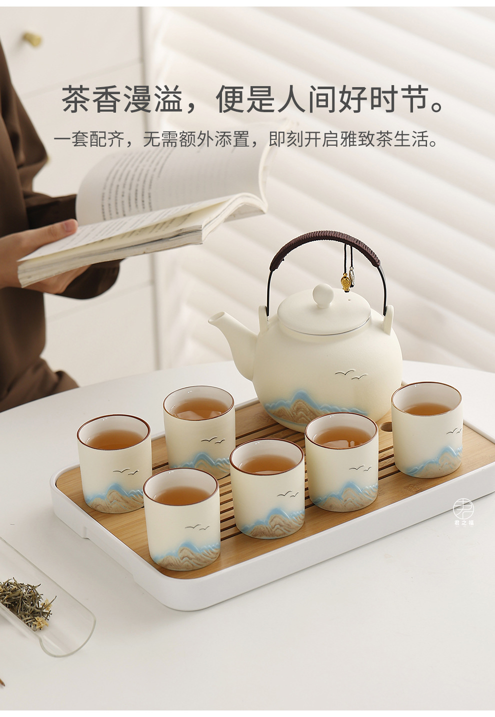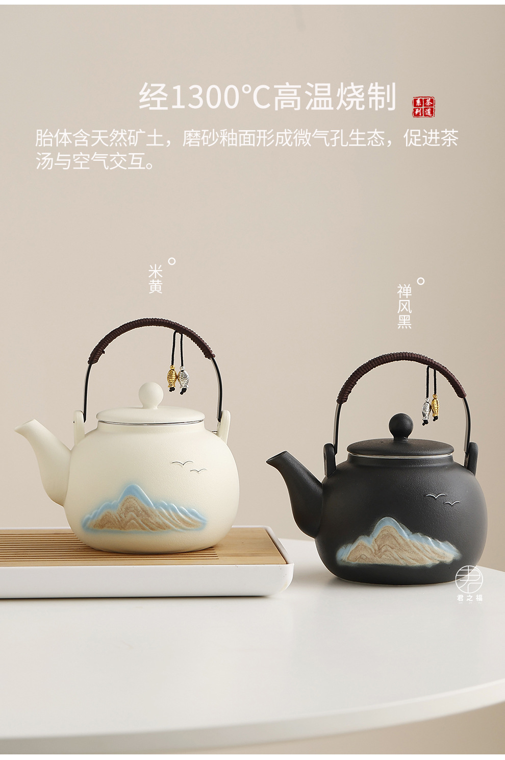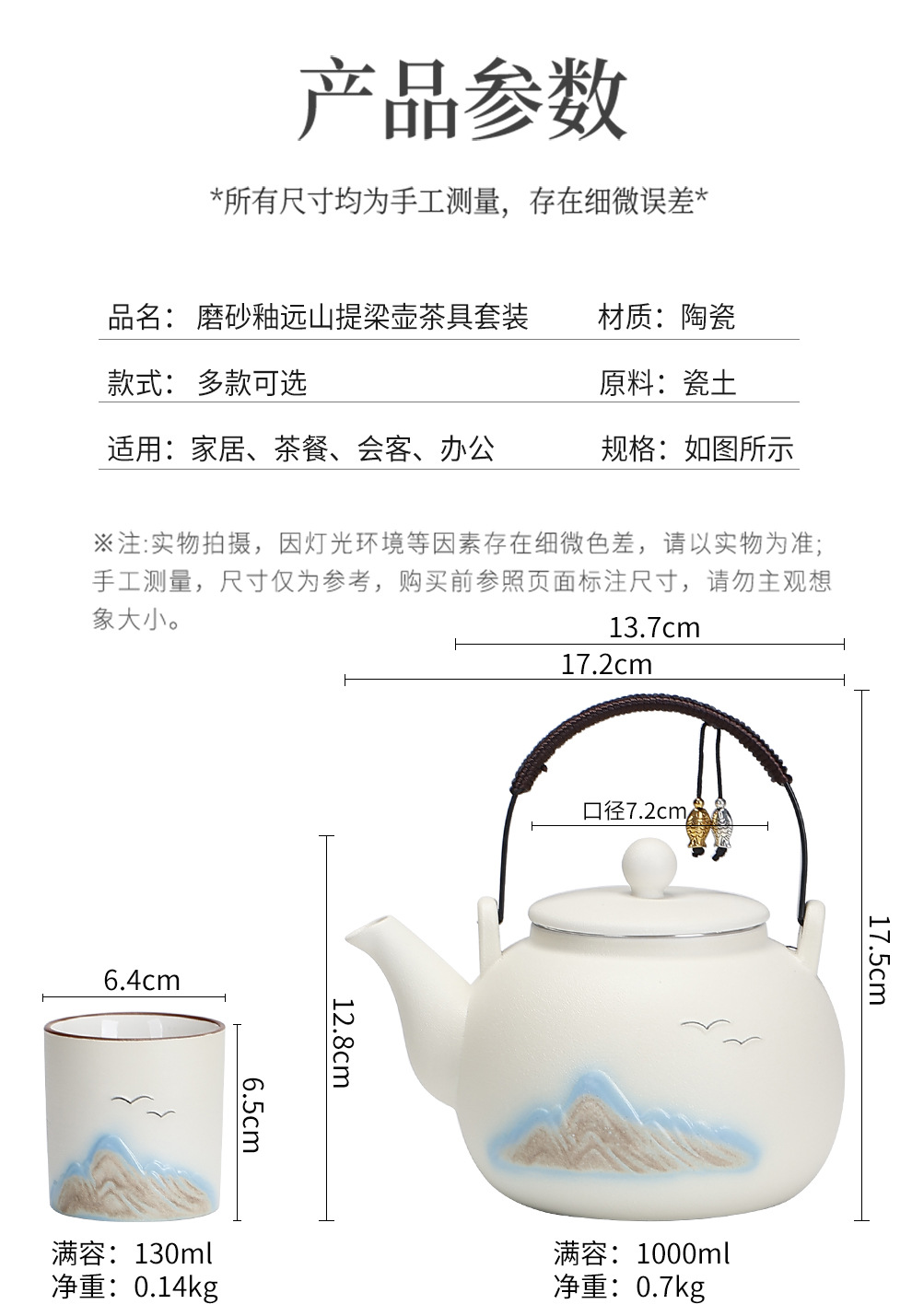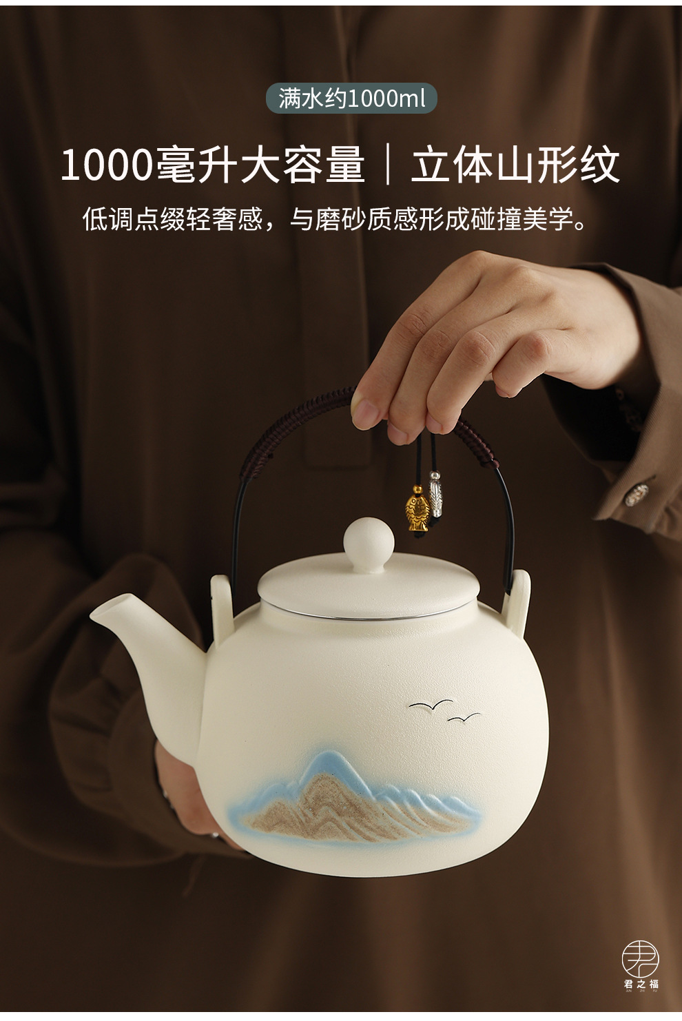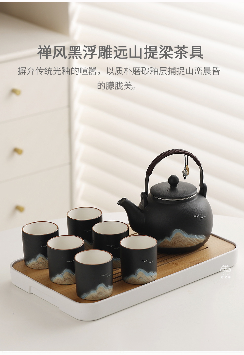 Cross border ceramic frosted glaze large capacity lifting beam teapot tea set, Japanese style simple relief distant mountain teapot cup set