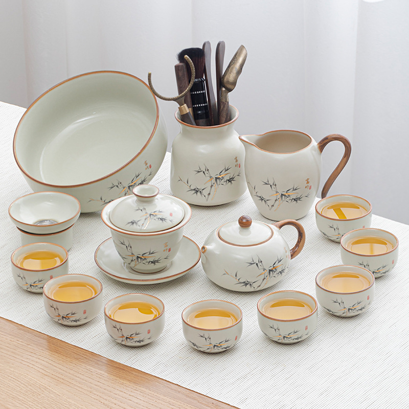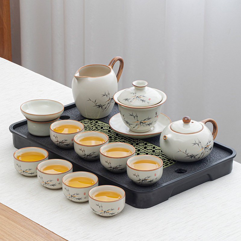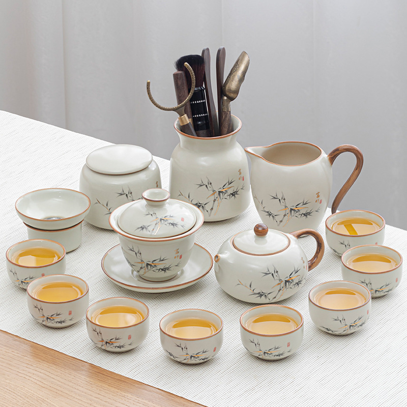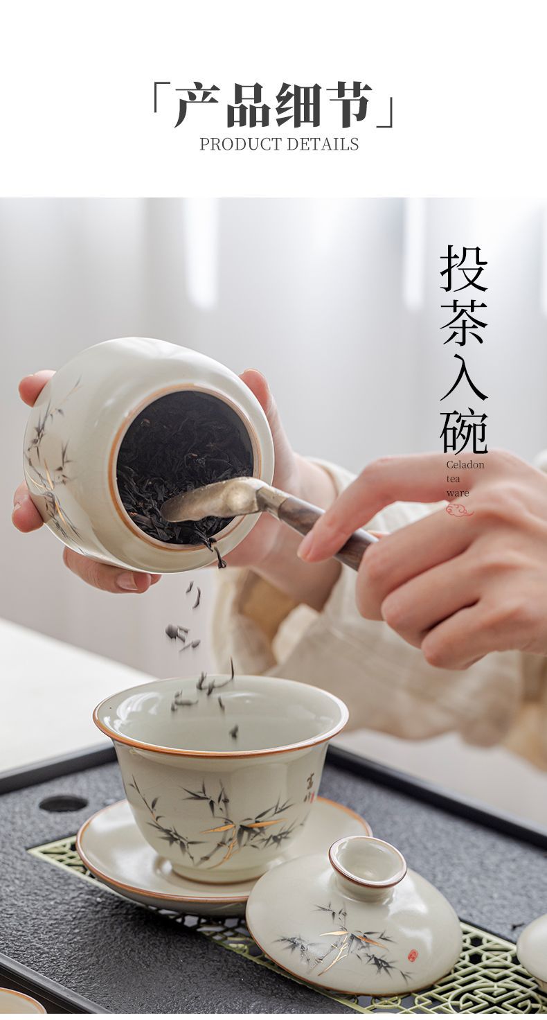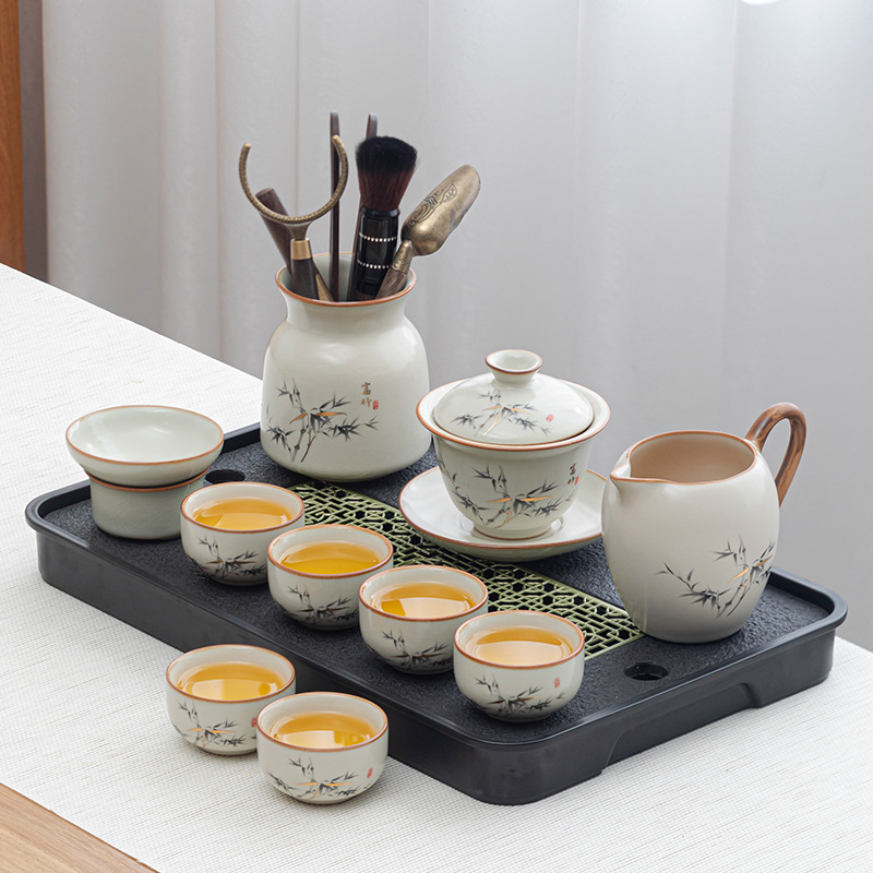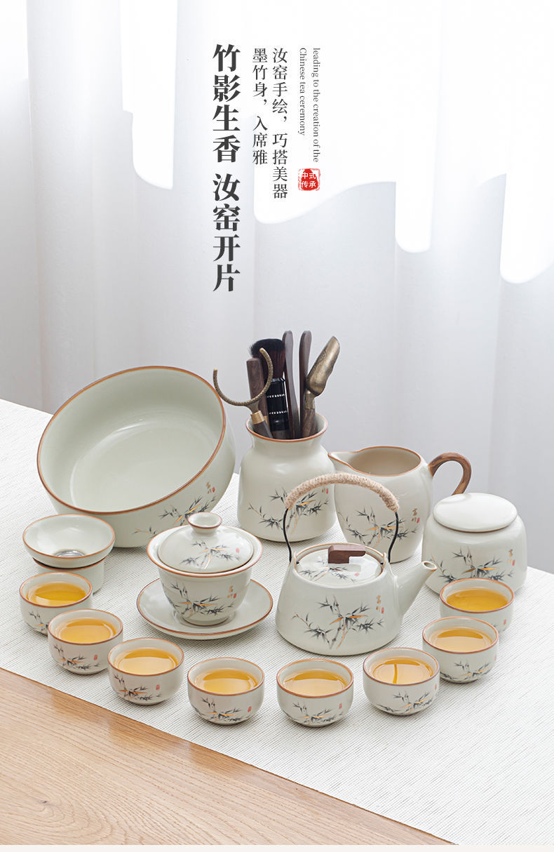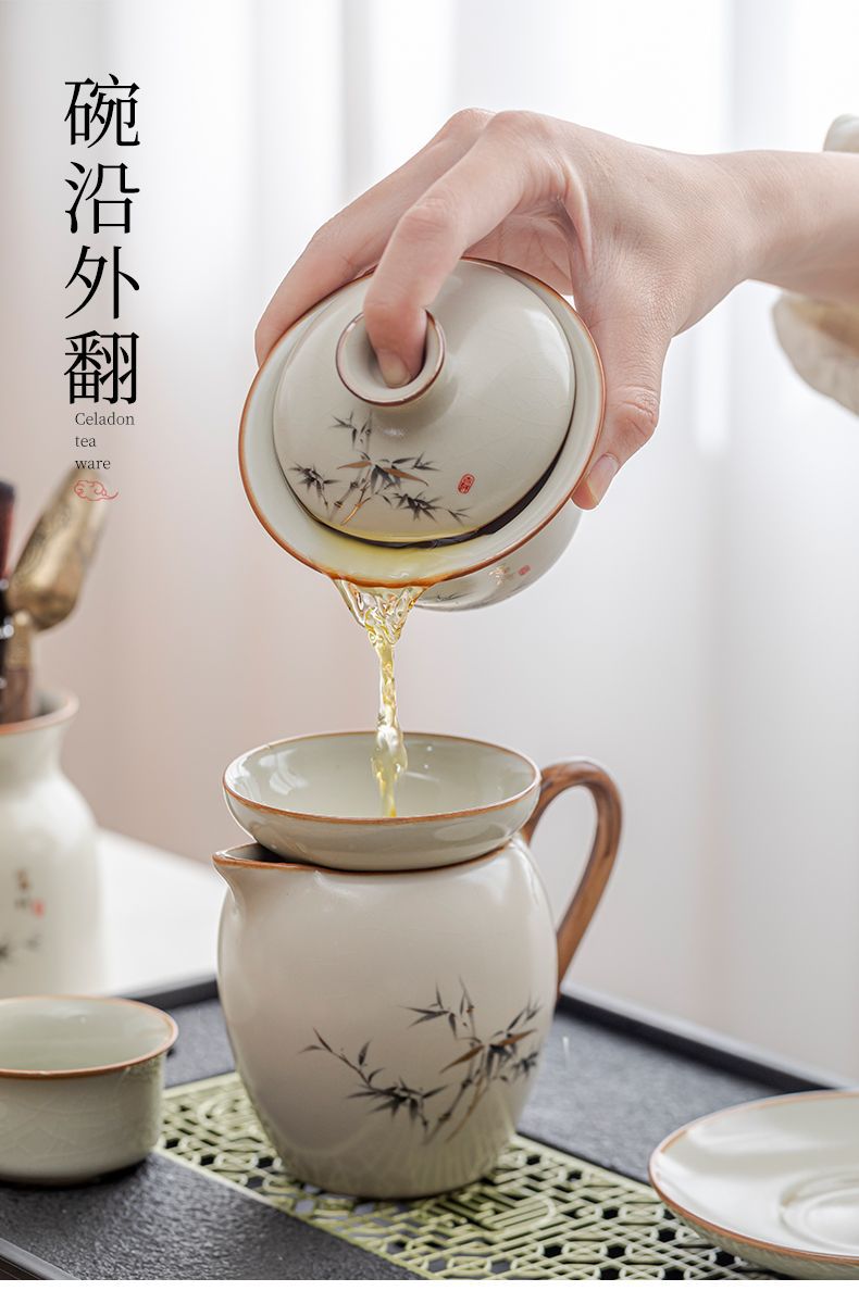 High end Ru kiln Kung Fu tea set, household ceramic opening, bamboo cover bowl, tea cup set, living room tea ceremony set