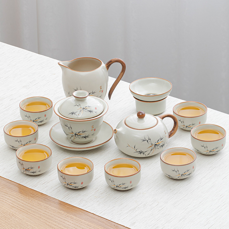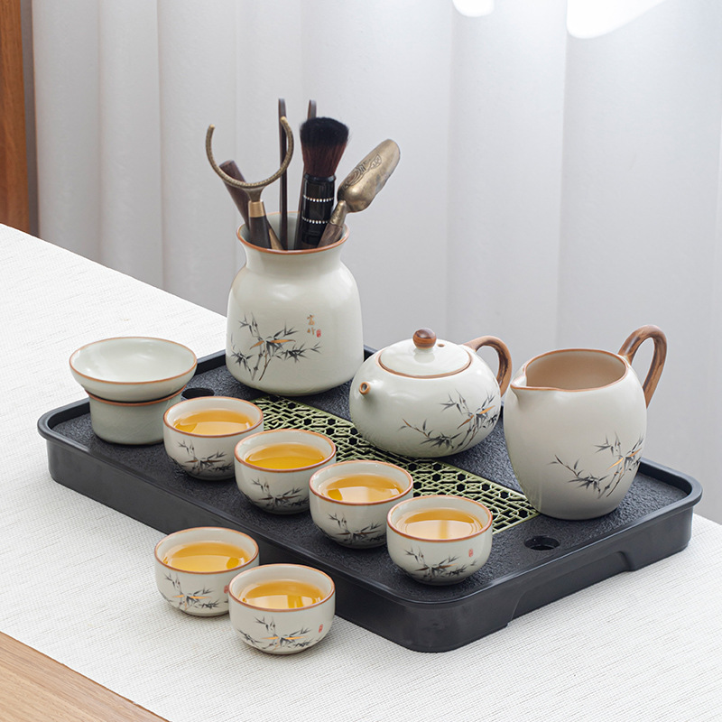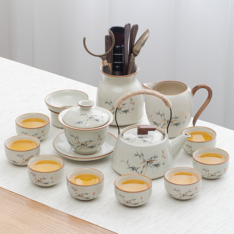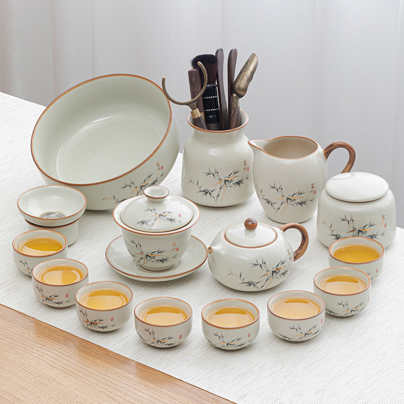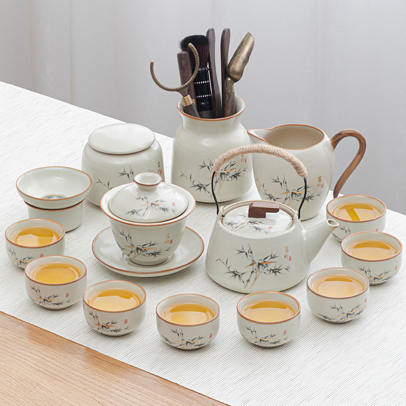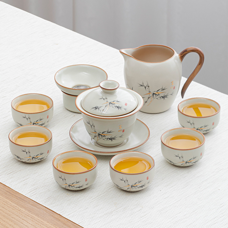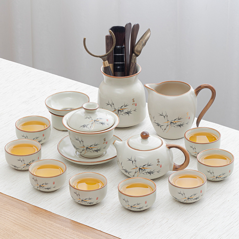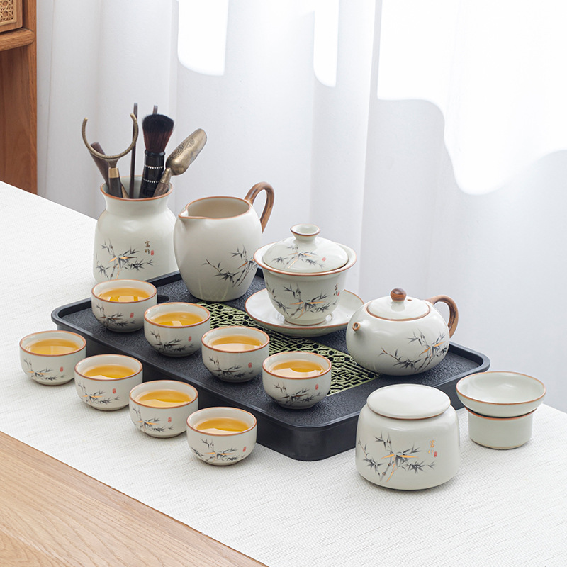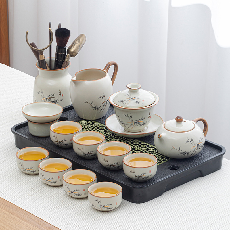 High end Ru kiln Kung Fu tea set, household ceramic opening, bamboo cover bowl, tea cup set, living room tea ceremony set