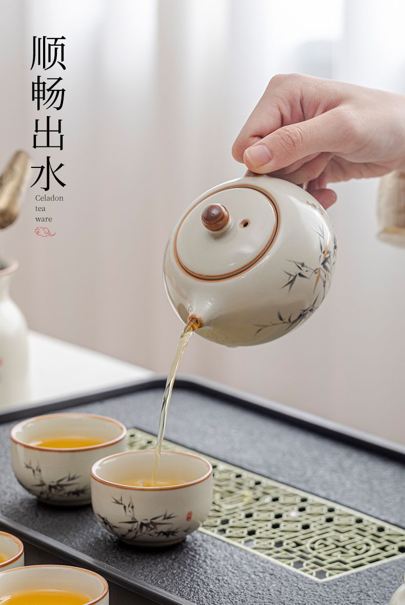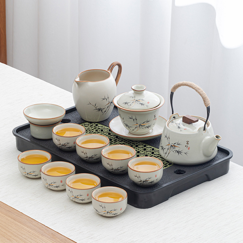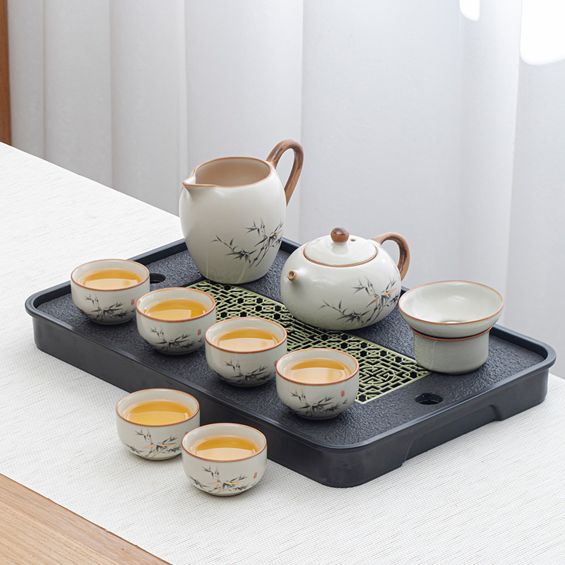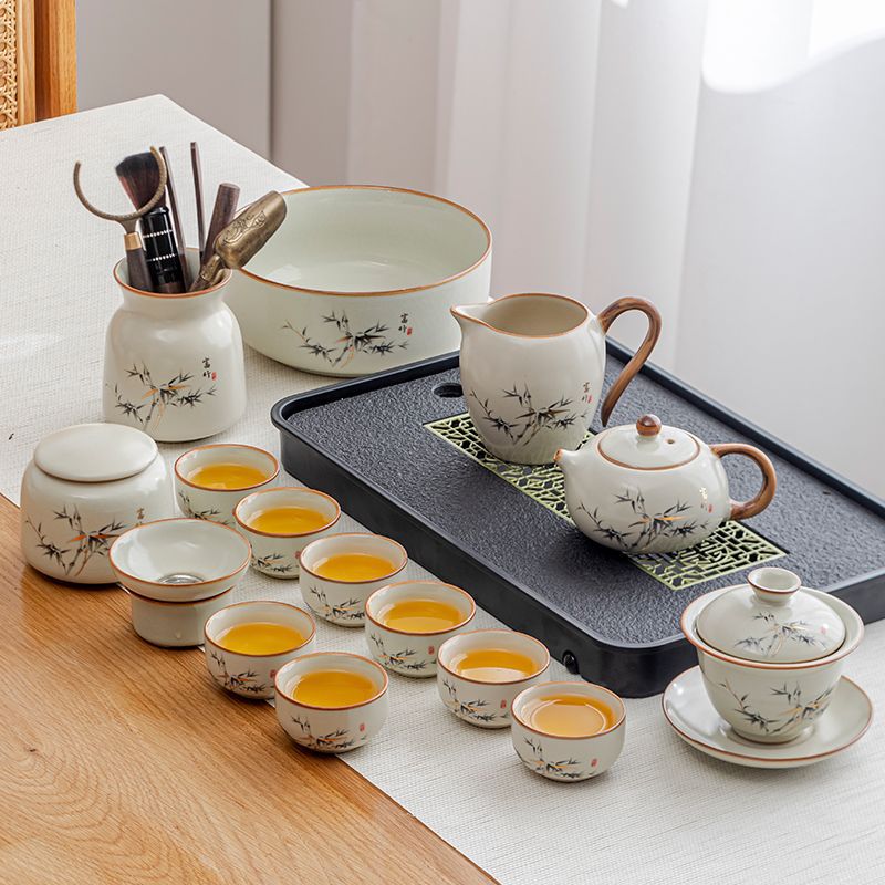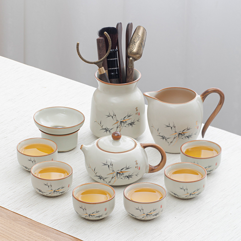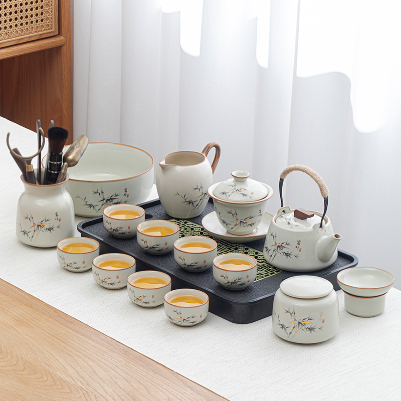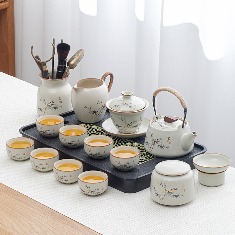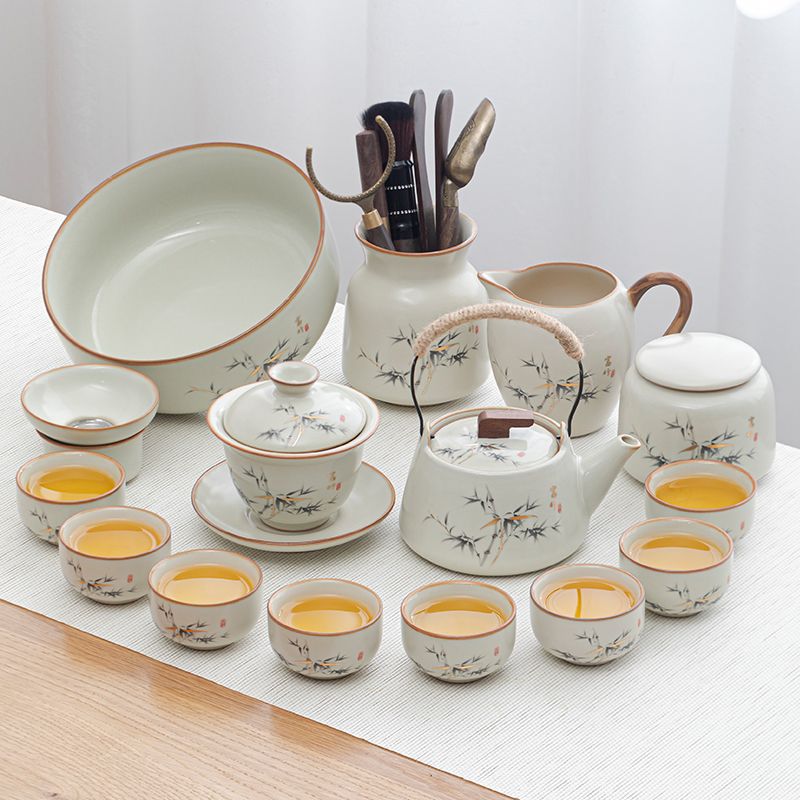 High end Ru kiln Kung Fu tea set, household ceramic opening, bamboo cover bowl, tea cup set, living room tea ceremony set
