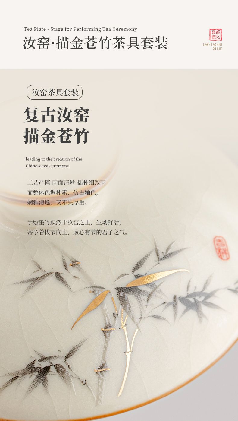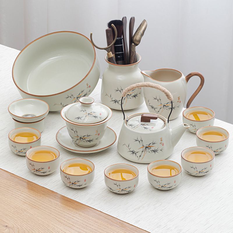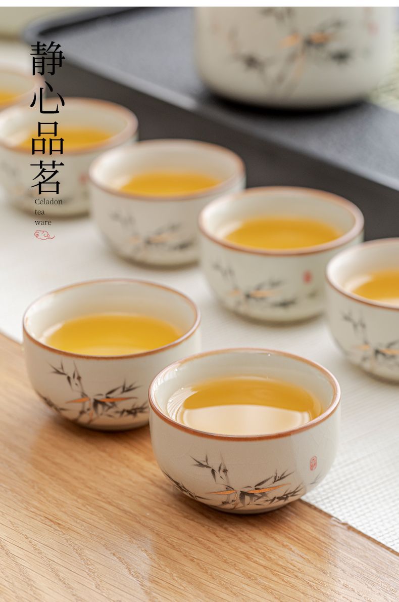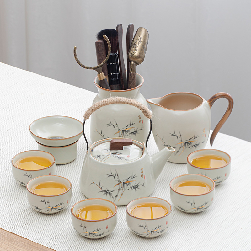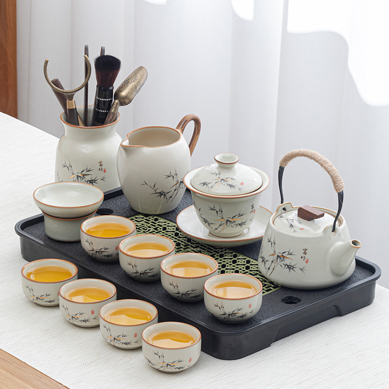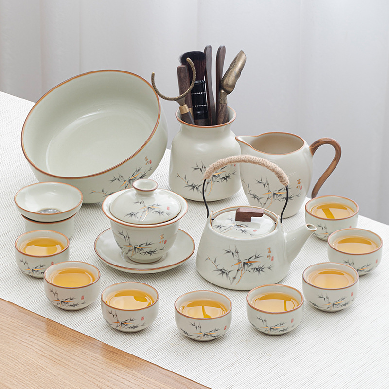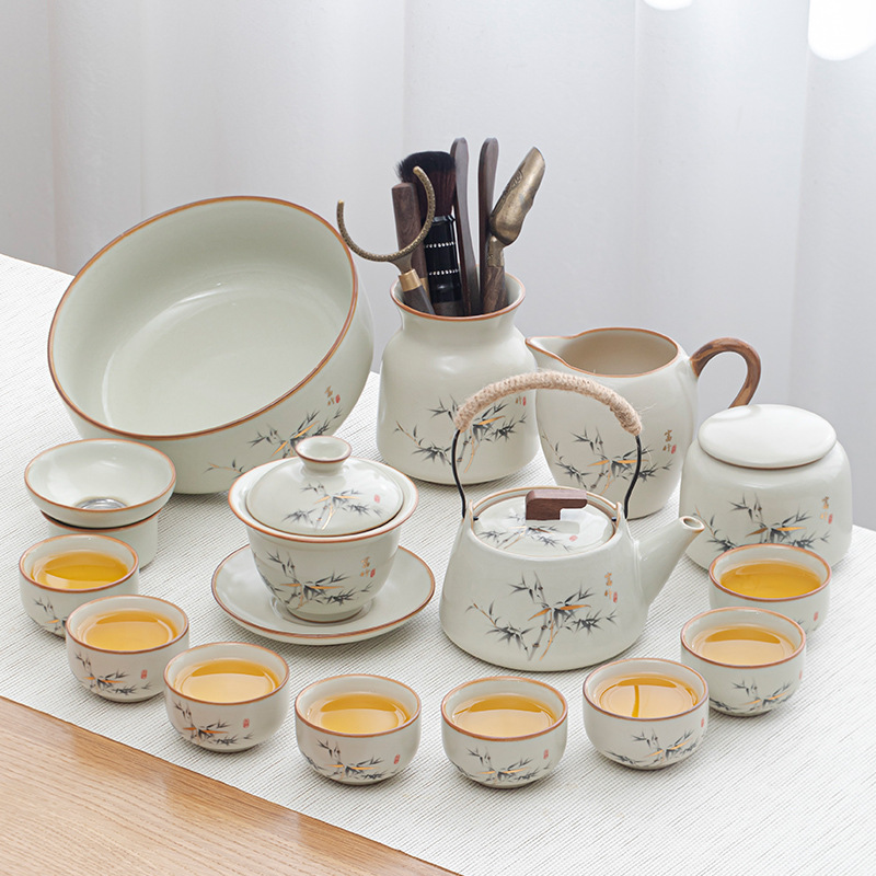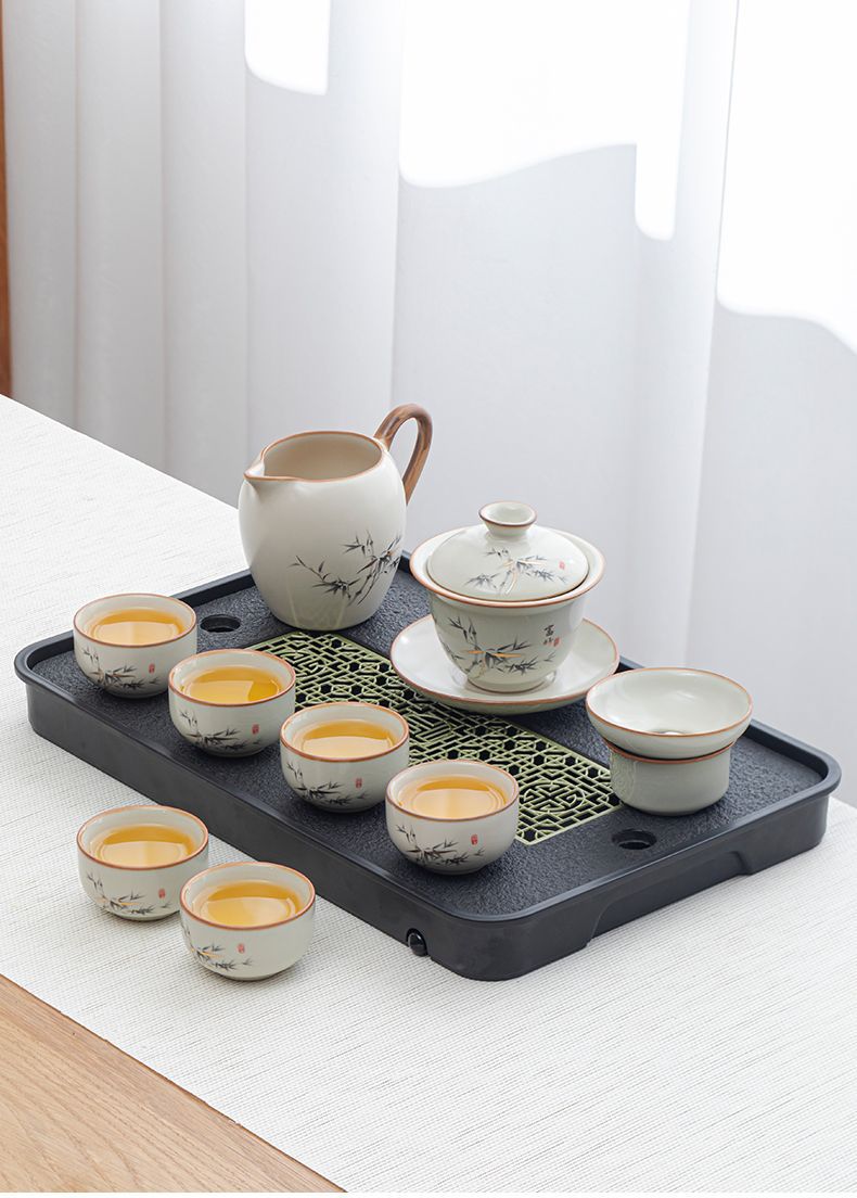 High end Ru kiln Kung Fu tea set, household ceramic opening, bamboo cover bowl, tea cup set, living room tea ceremony set