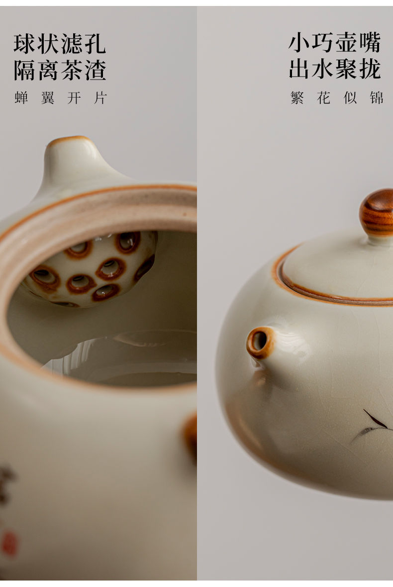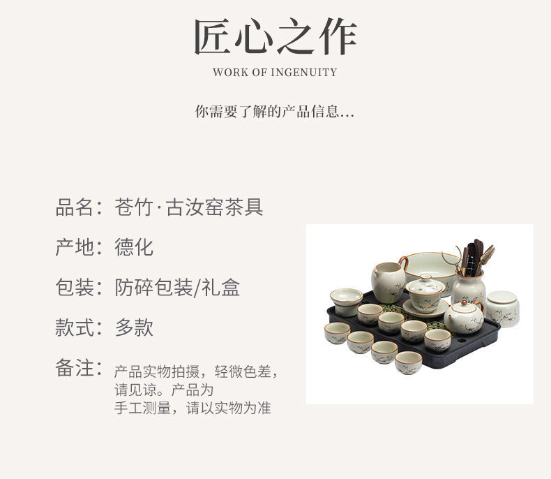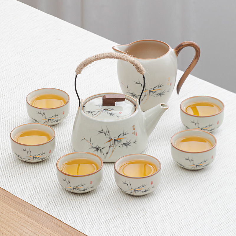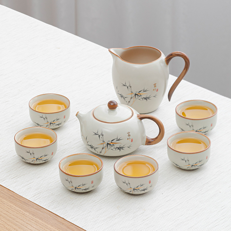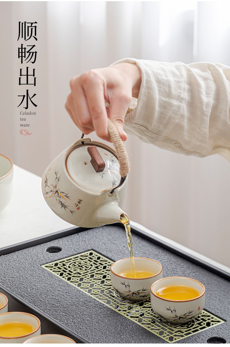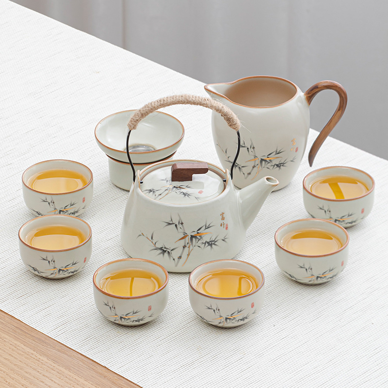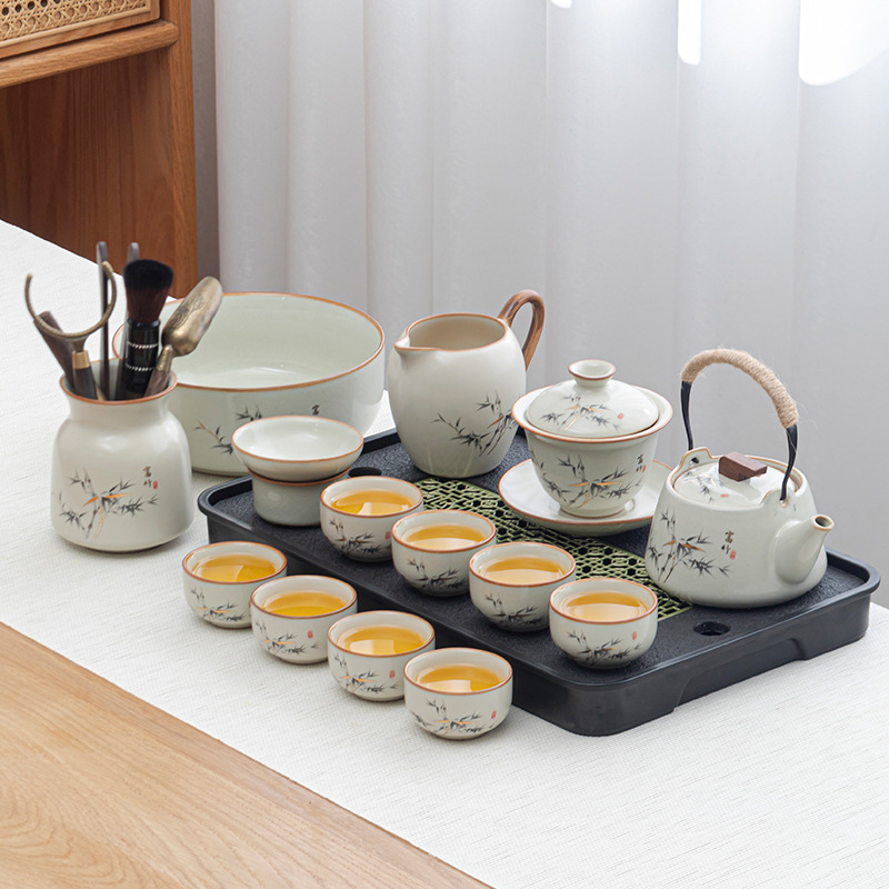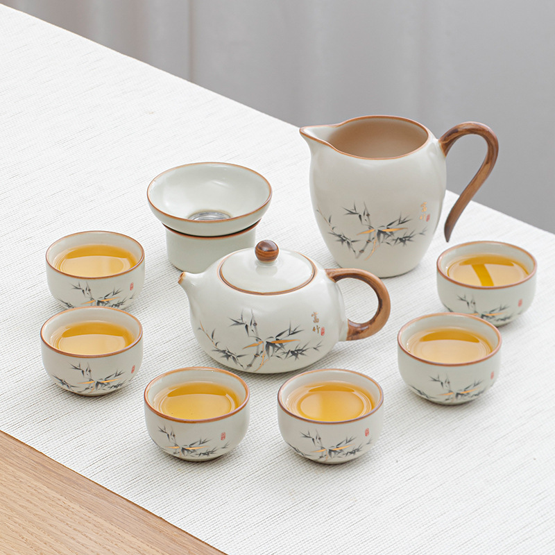 High end Ru kiln Kung Fu tea set, household ceramic opening, bamboo cover bowl, tea cup set, living room tea ceremony set