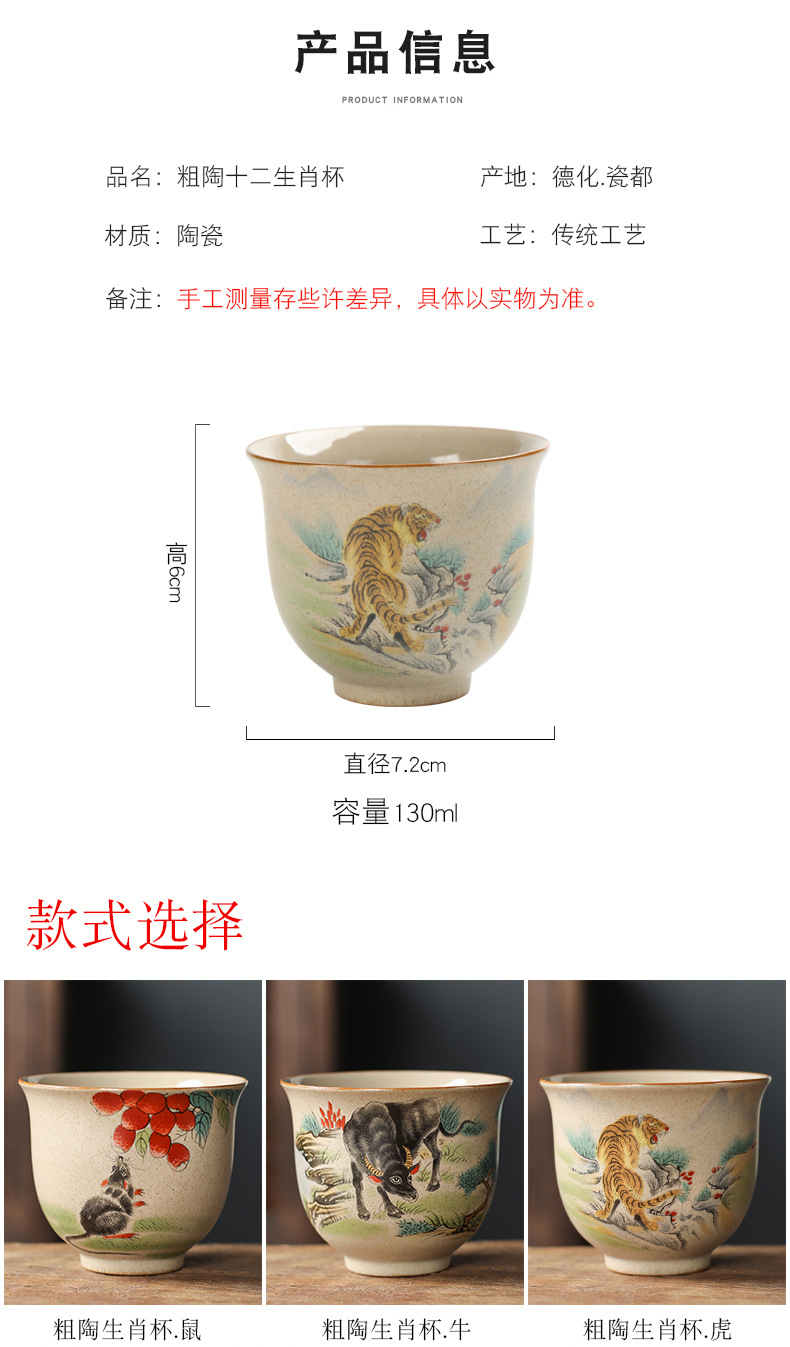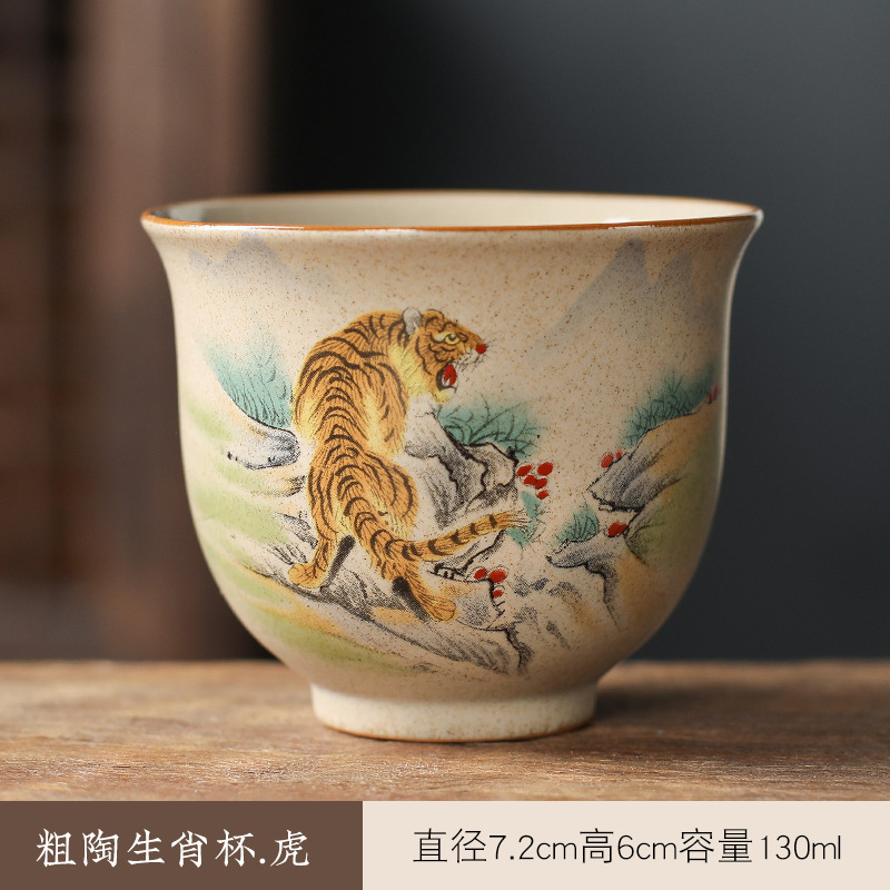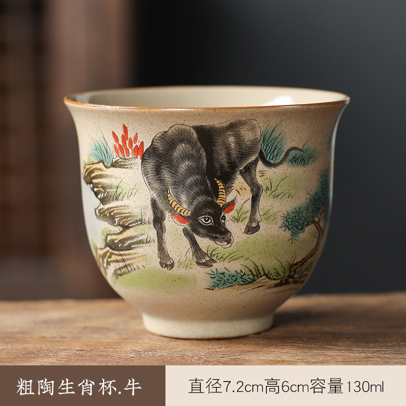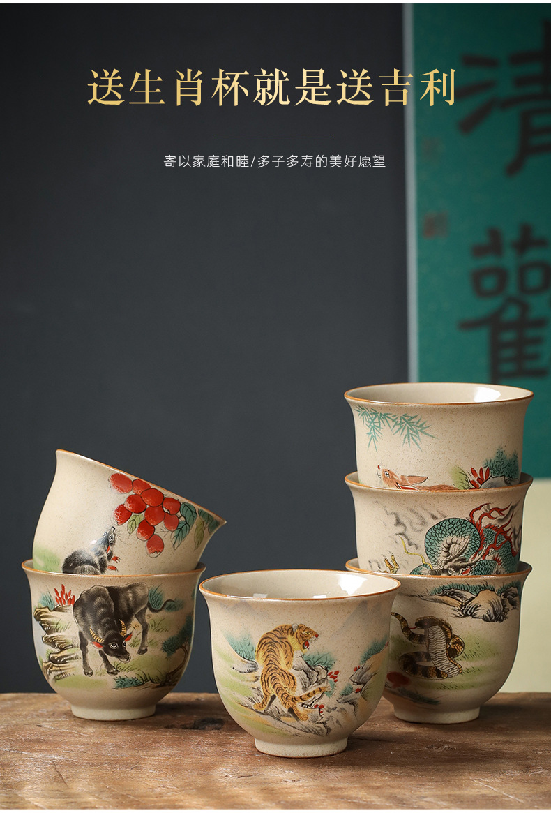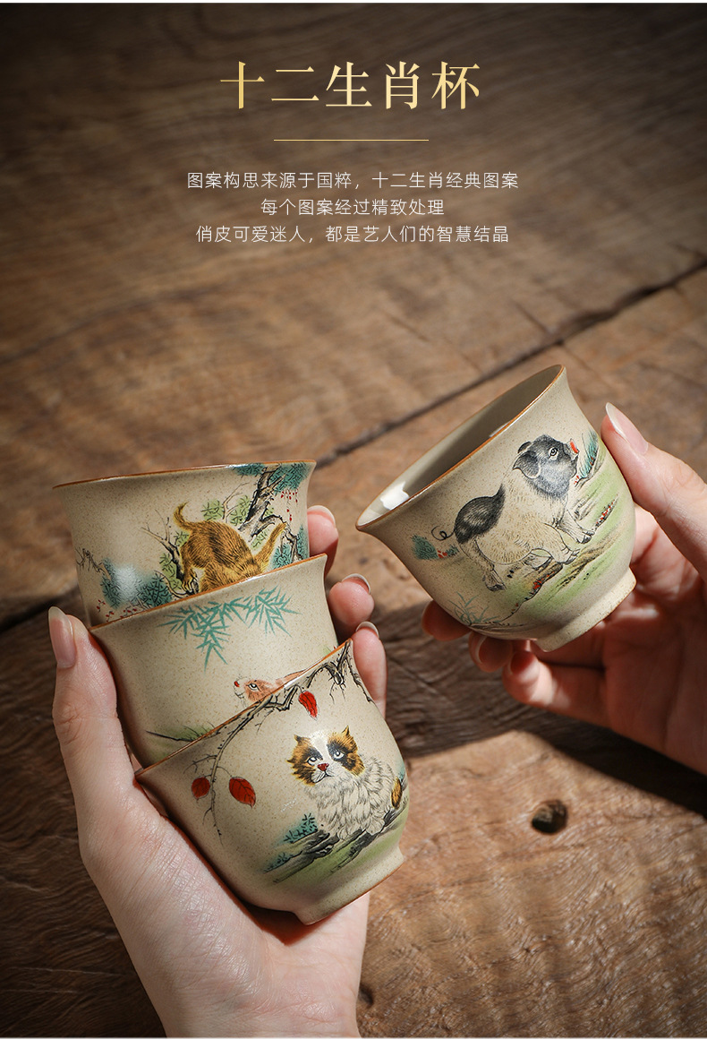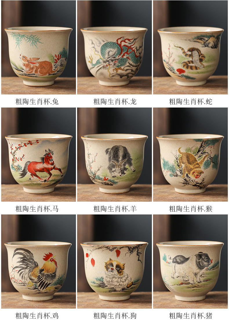 Coarse pottery tea ware, Chinese zodiac tea cup, tea set, retro style, Chinese kung fu tea cup, single cup, master cup