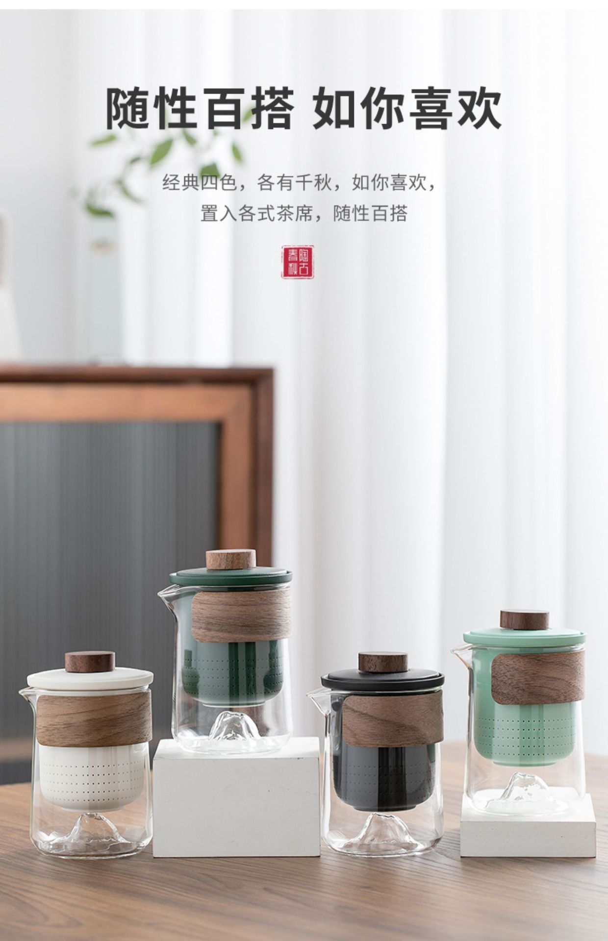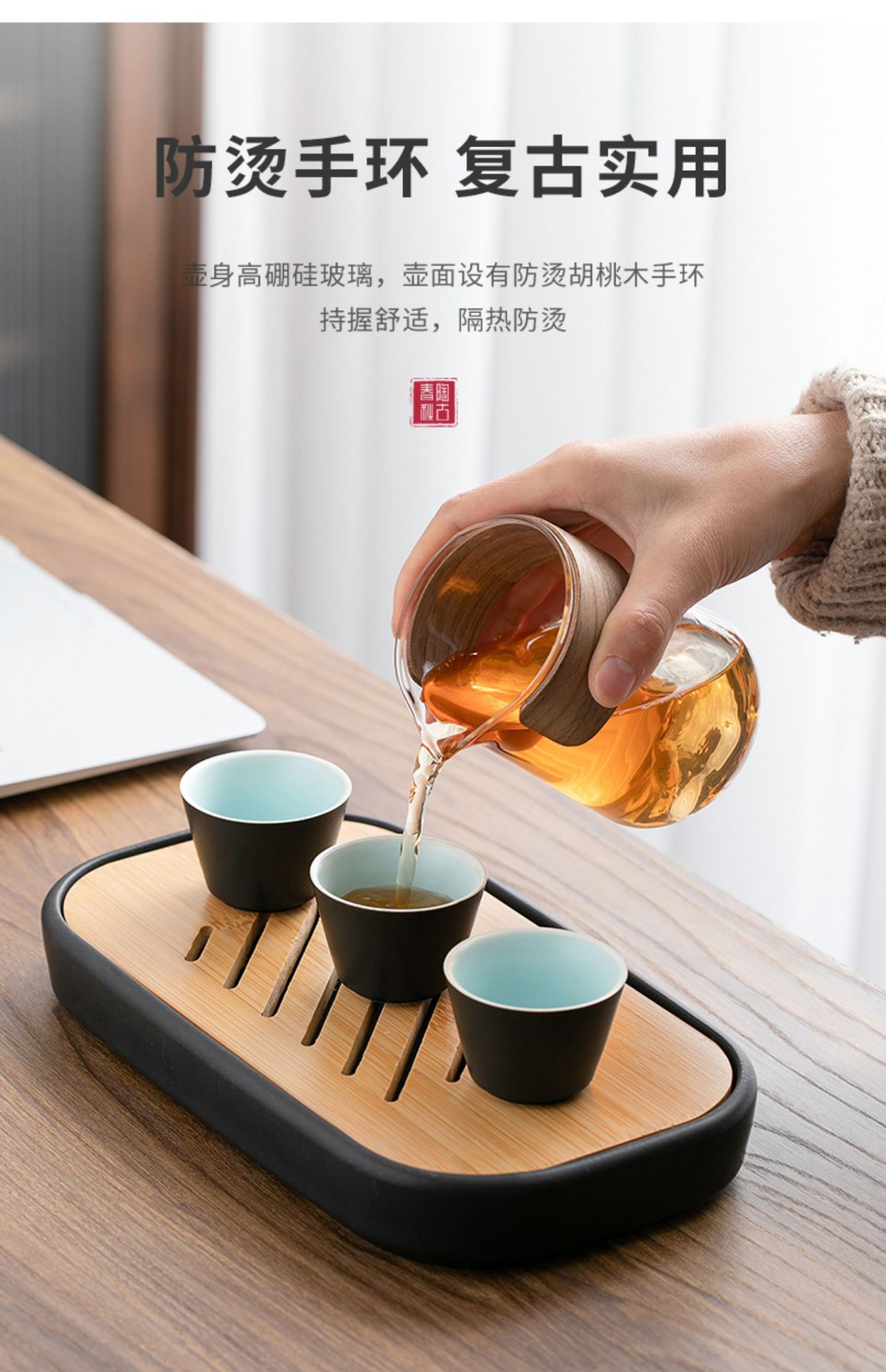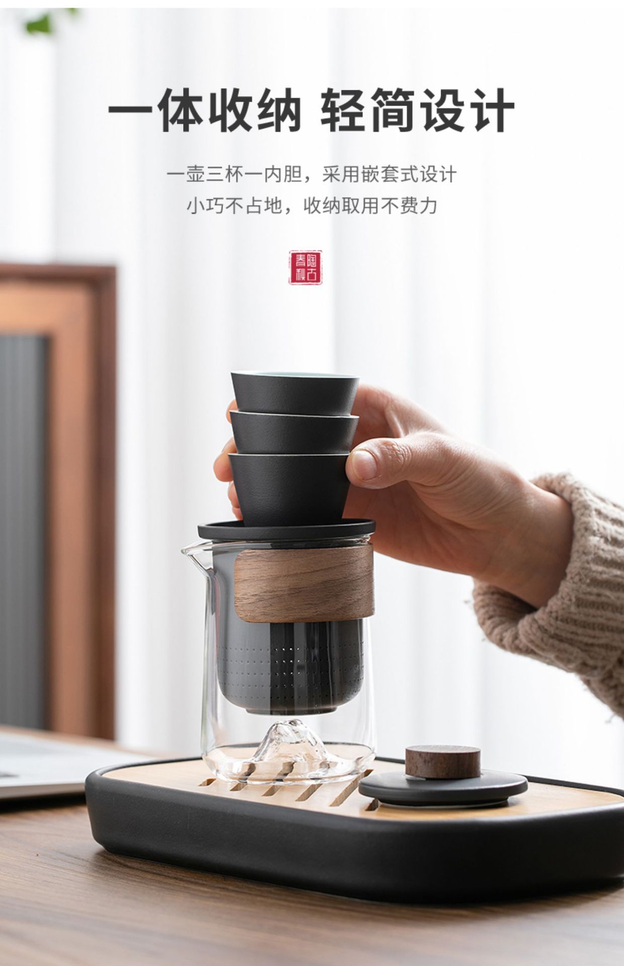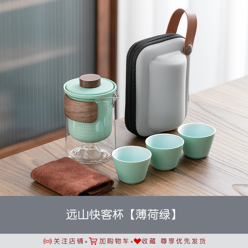 Once again, we see the mountain rain portable remote mountain travel tea set, outdoor glass quick guest cup, one pot, three cups, and teapot