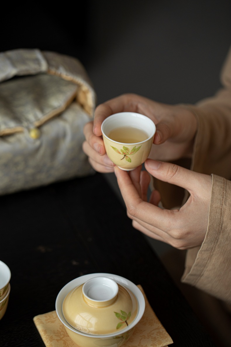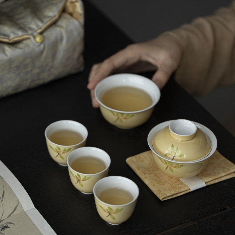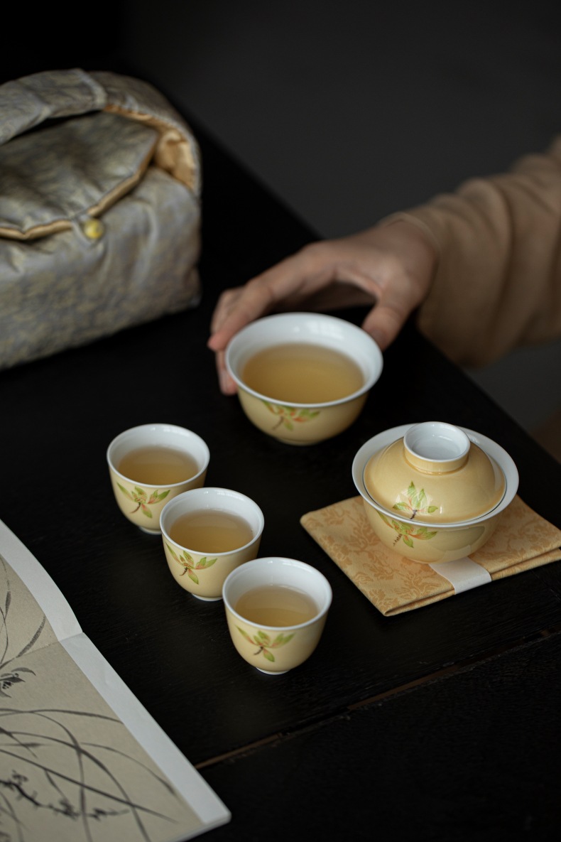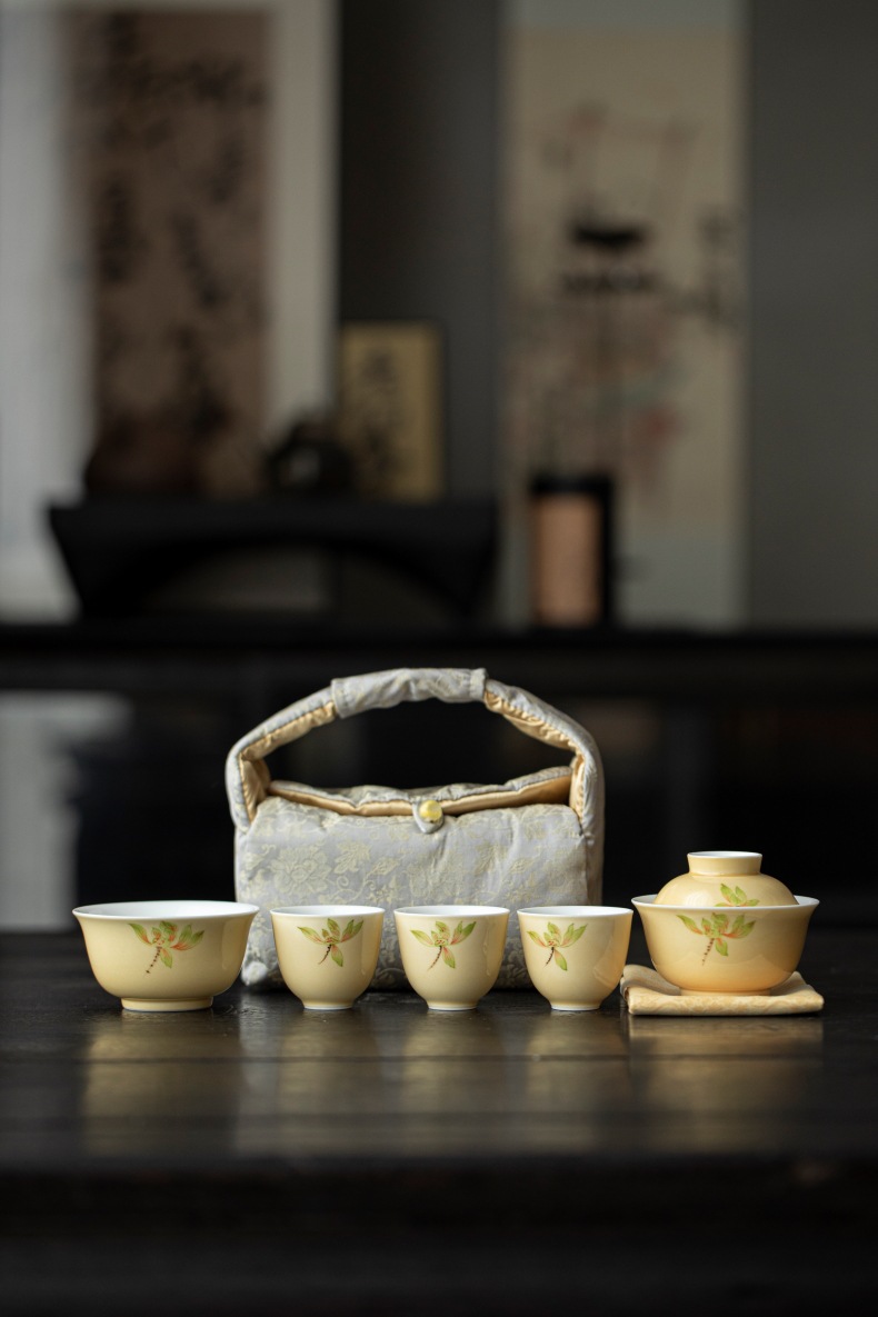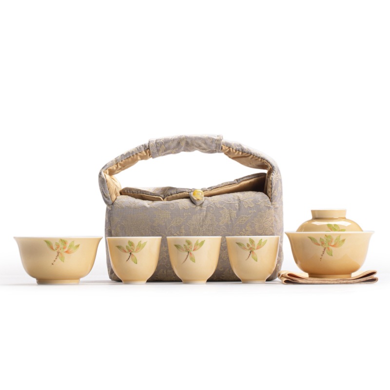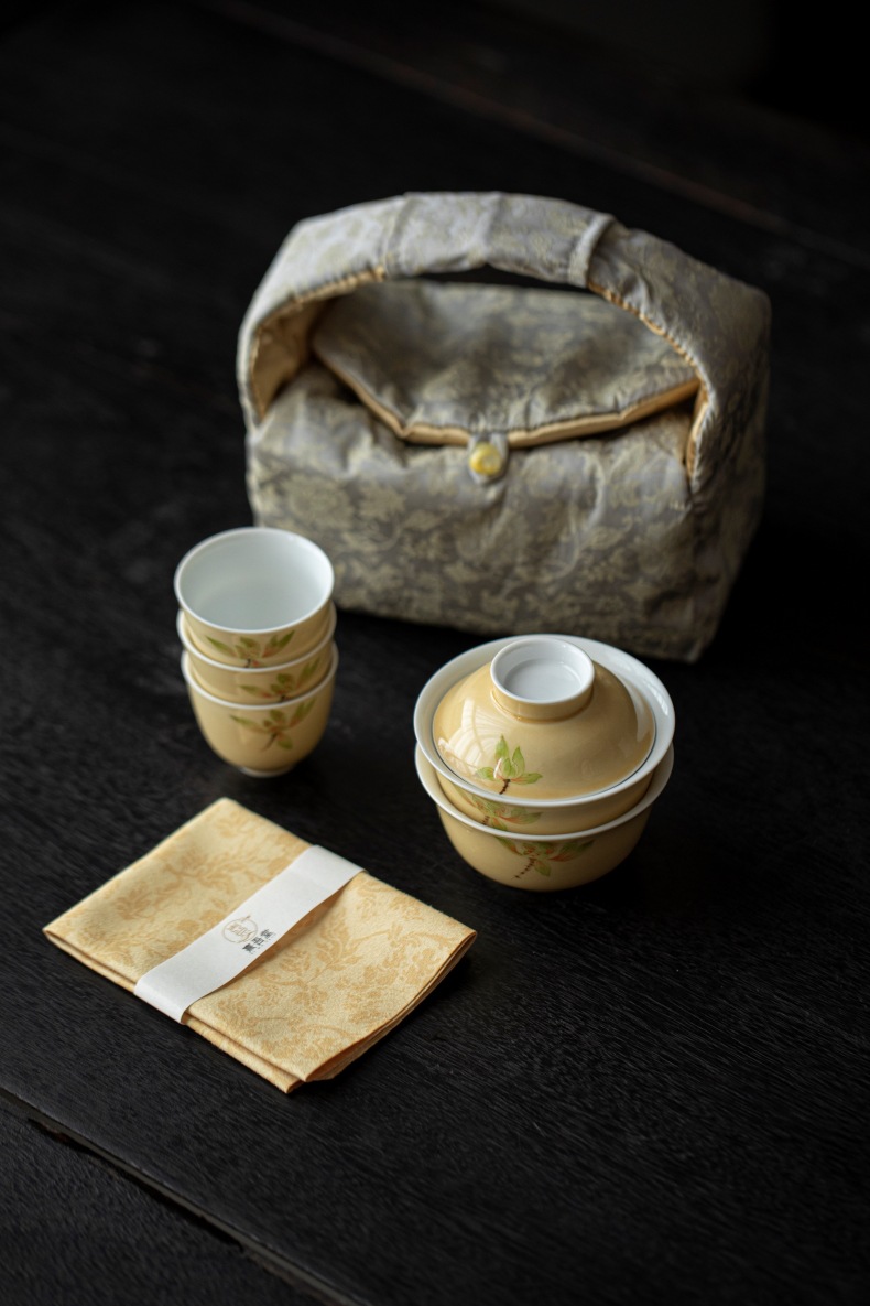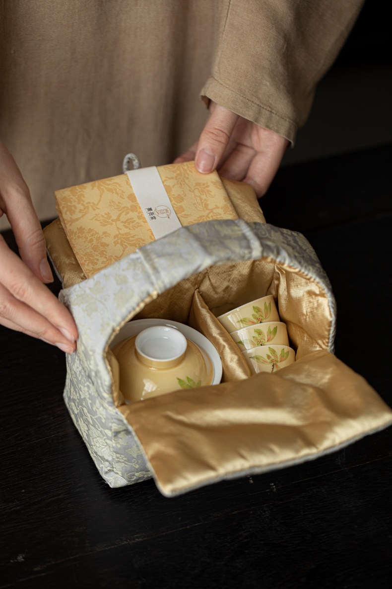 Moon yellow hand-painted magnolia flower portable travel tea set, outdoor tea making storage bag, Chinese style one lid bowl, four cups