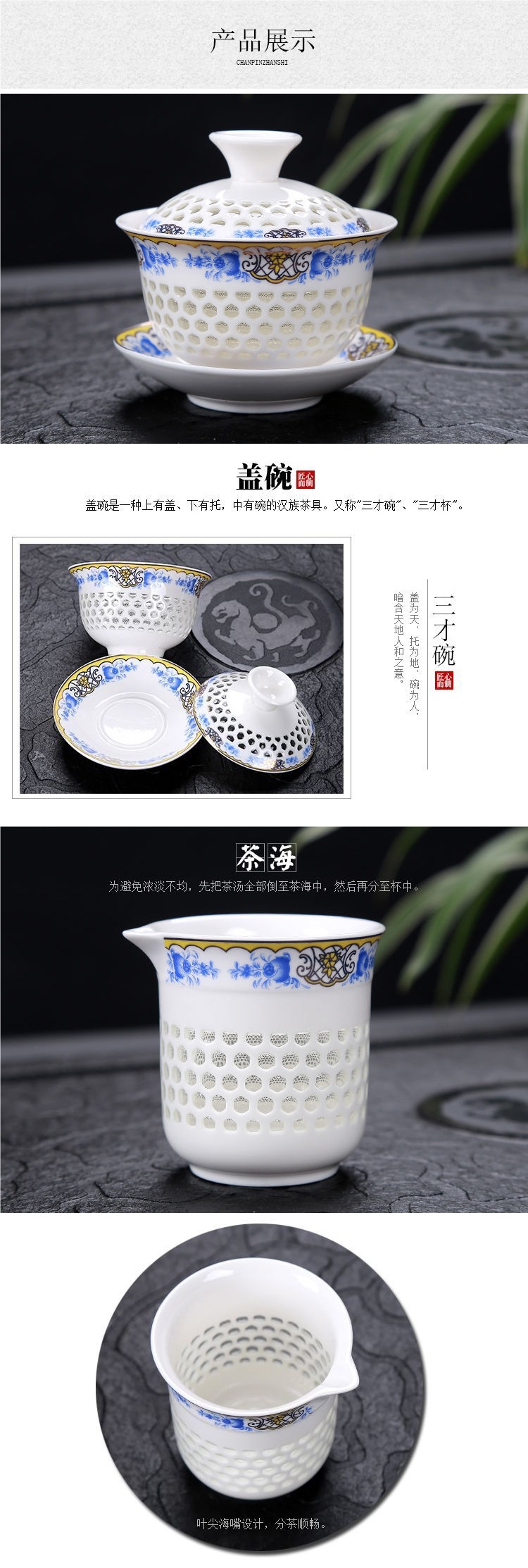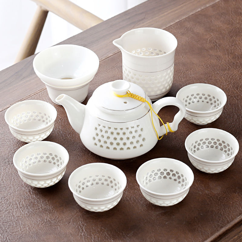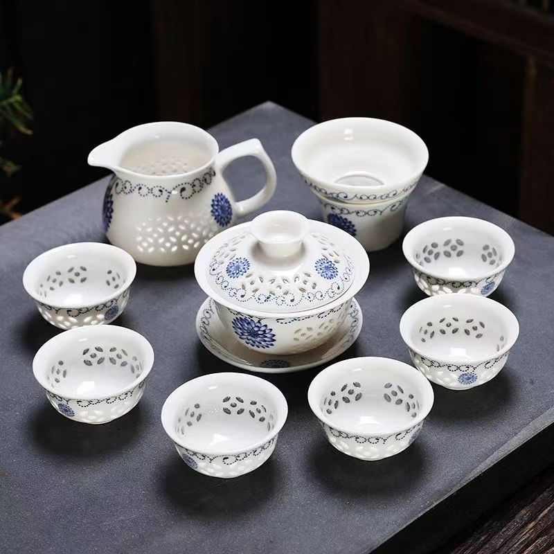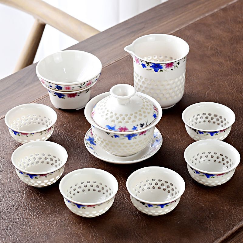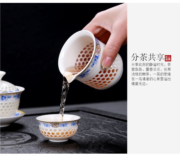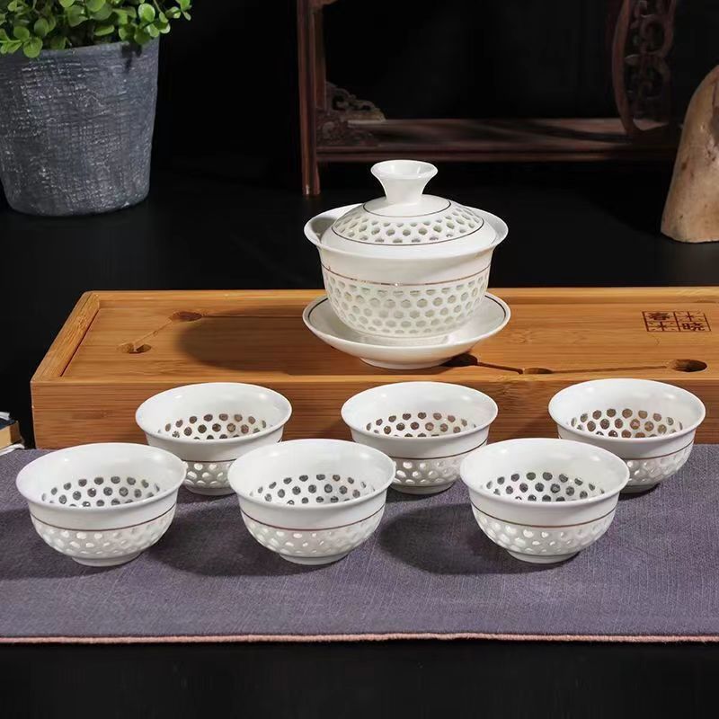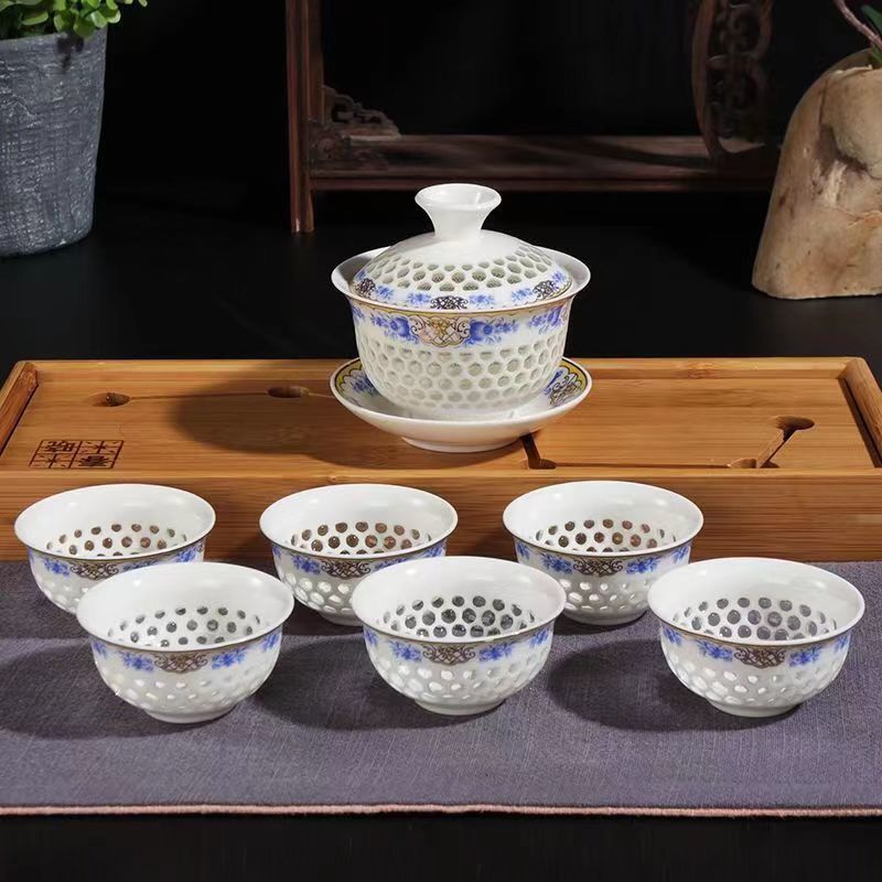 玲珑茶具套装家用客厅陶瓷蜂窝镂空盖碗泡茶杯待客办公室