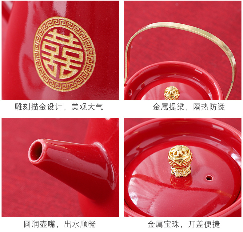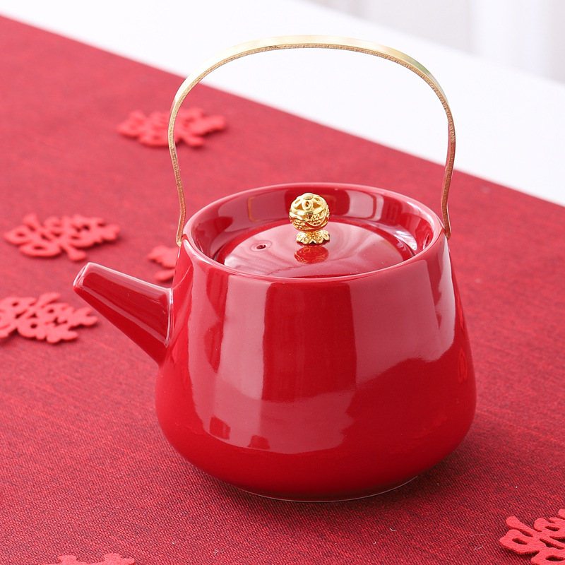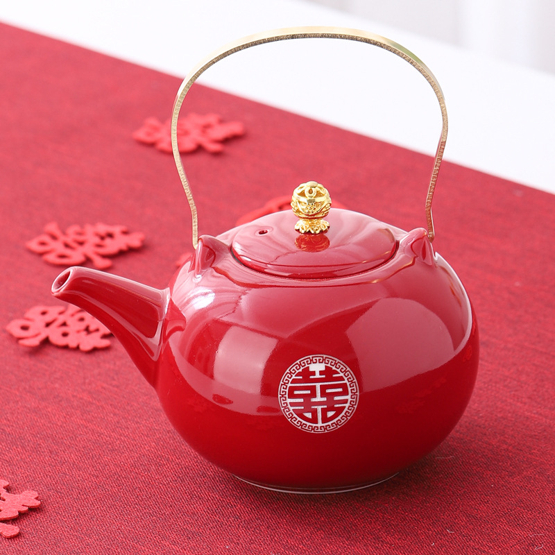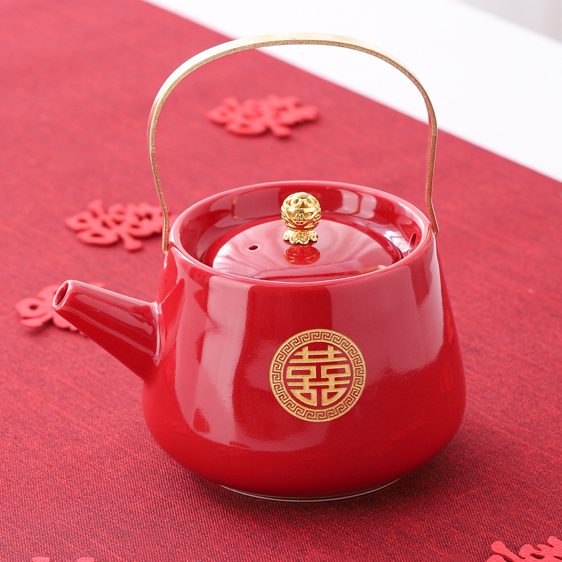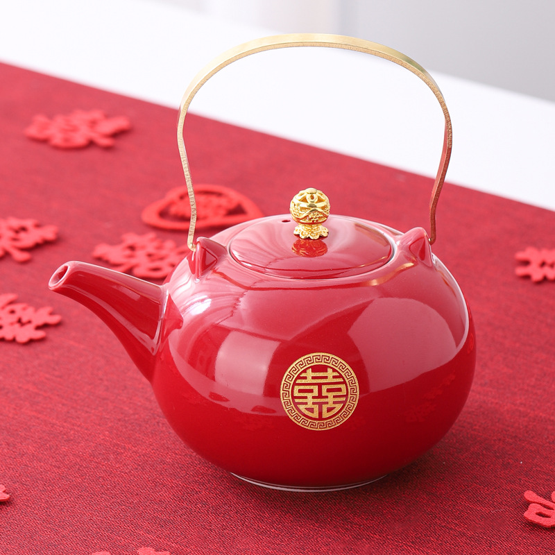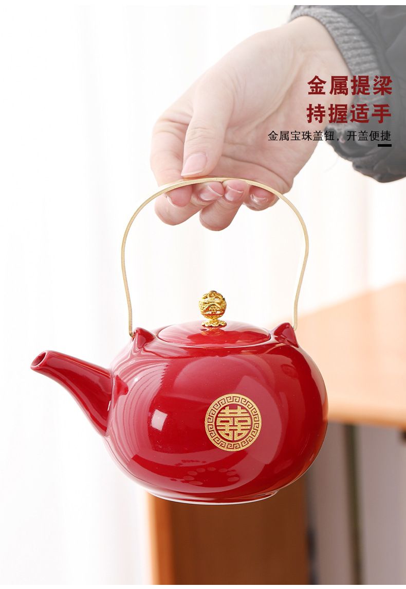 Wedding teapot, red ceramic, celebratory toast, water cup set, wedding banquet, wedding dowry supplies, large handle teapot