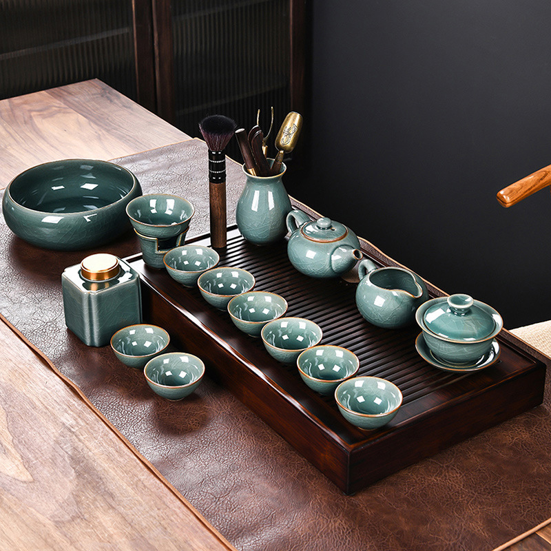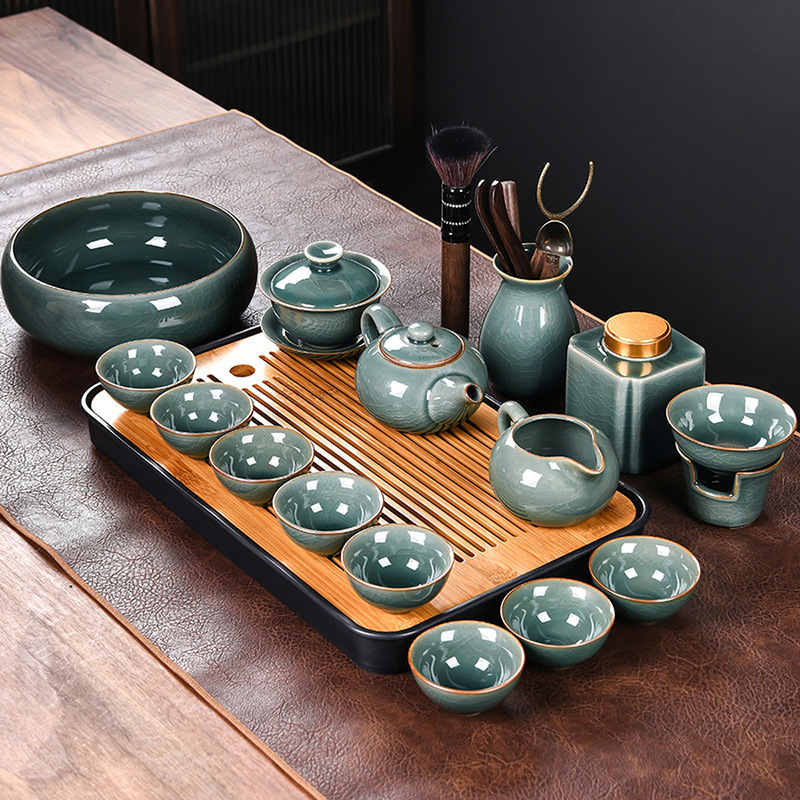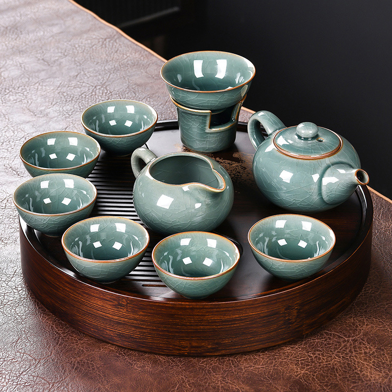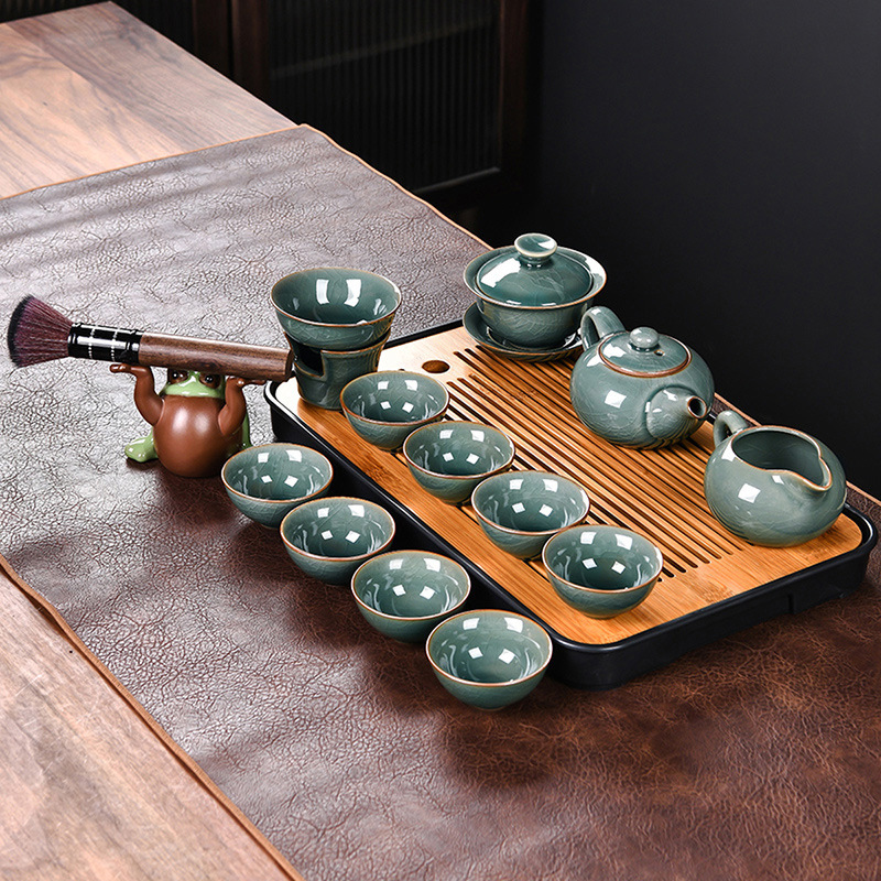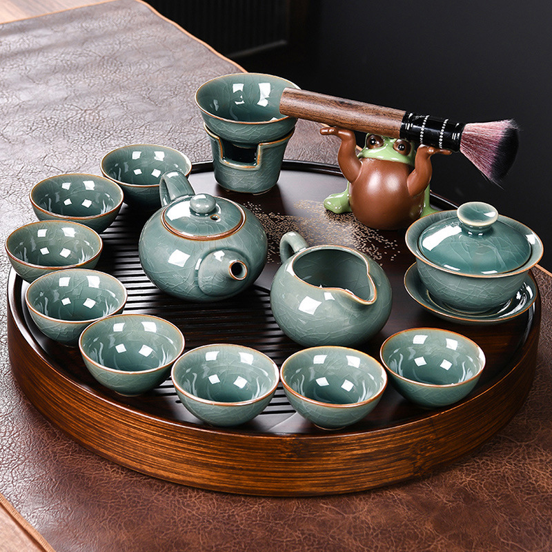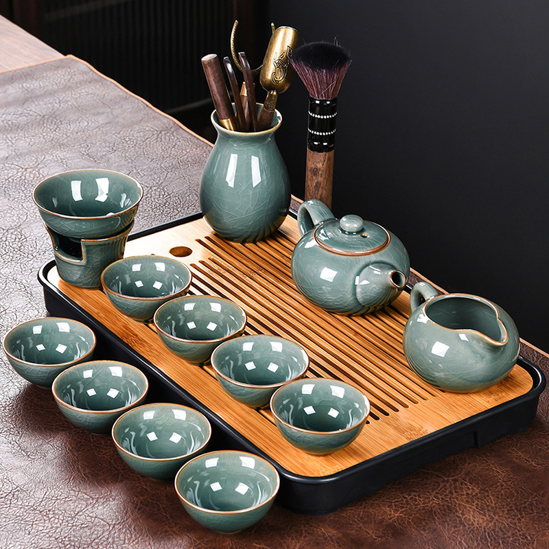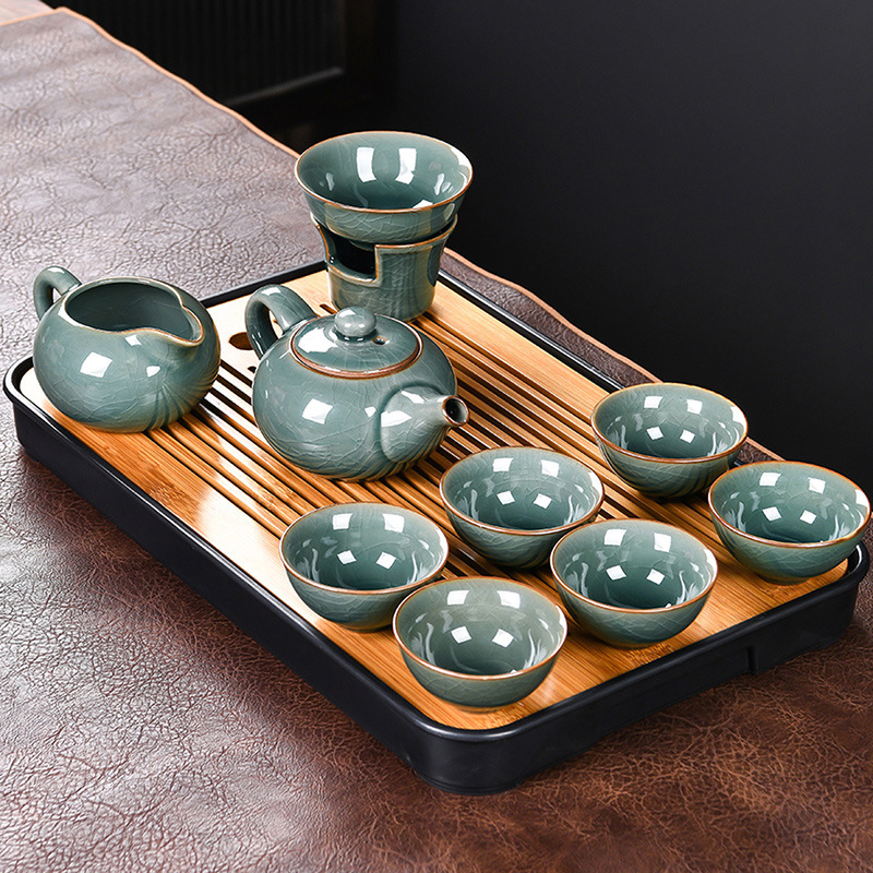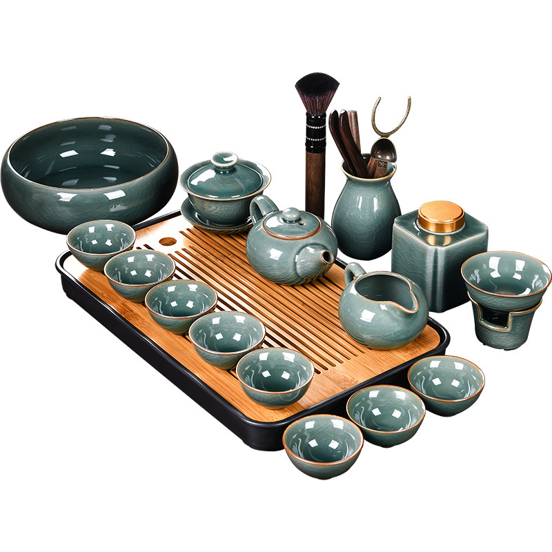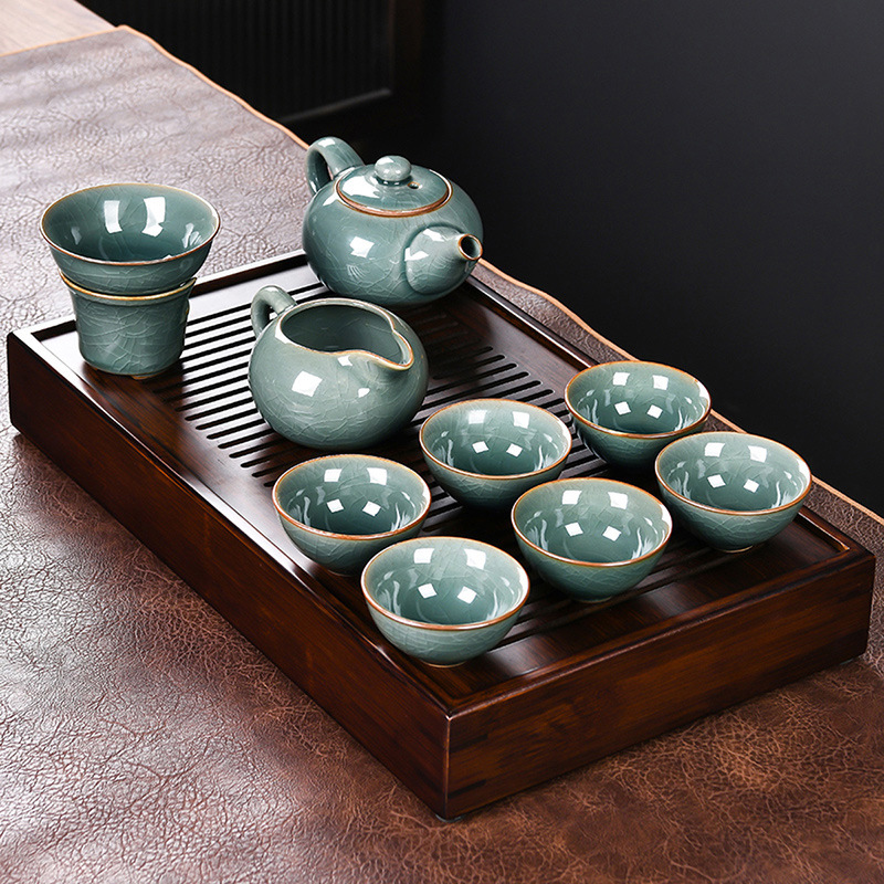 Bamboo made dry foam tray tea set, Chinese ceramic Ge kiln tea pot lid bowl, Kung Fu tea set, tea tray set, can be sent on behalf of others