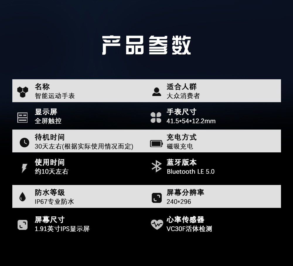 | 包装清单 | 手表+充电线+说明书+包装盒 |