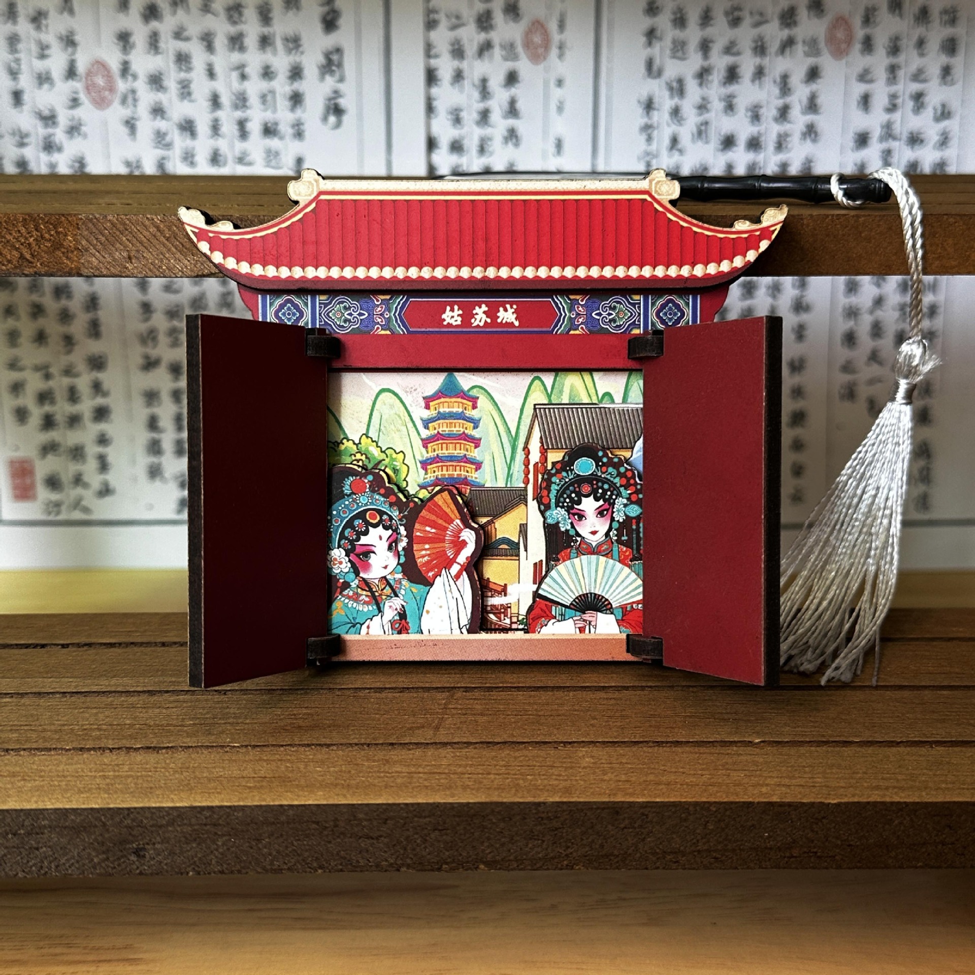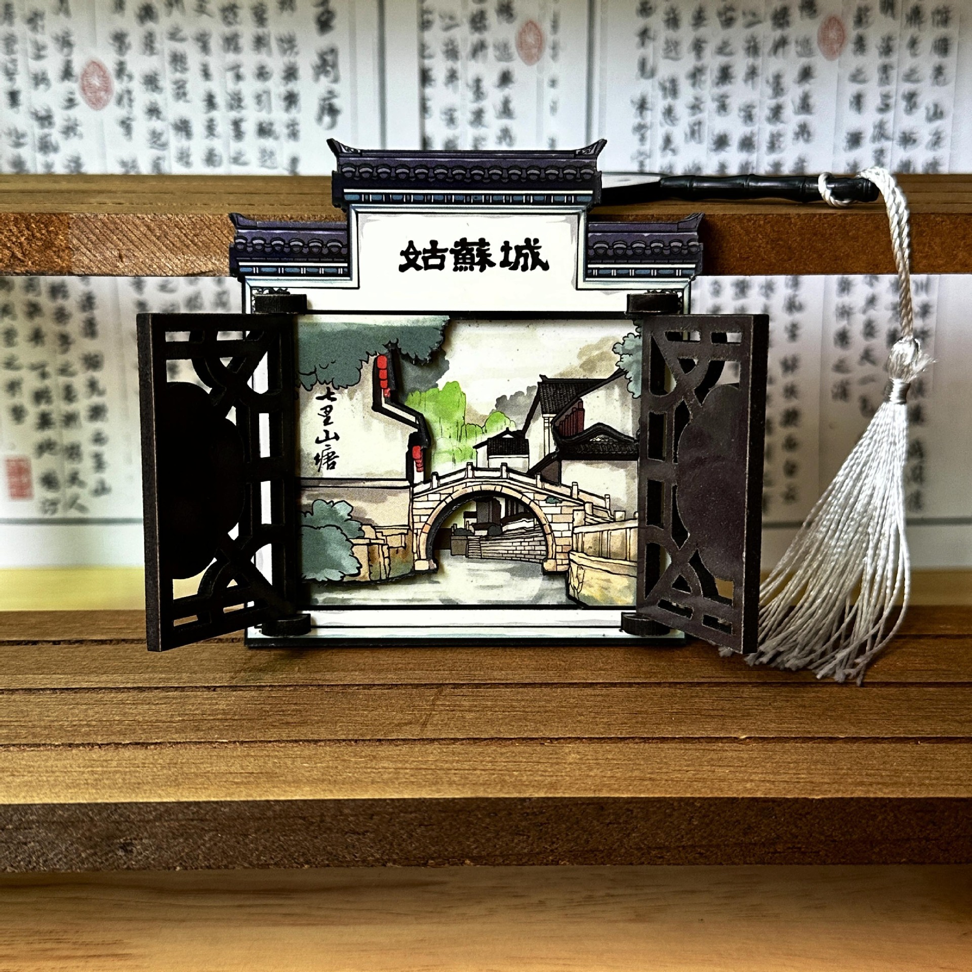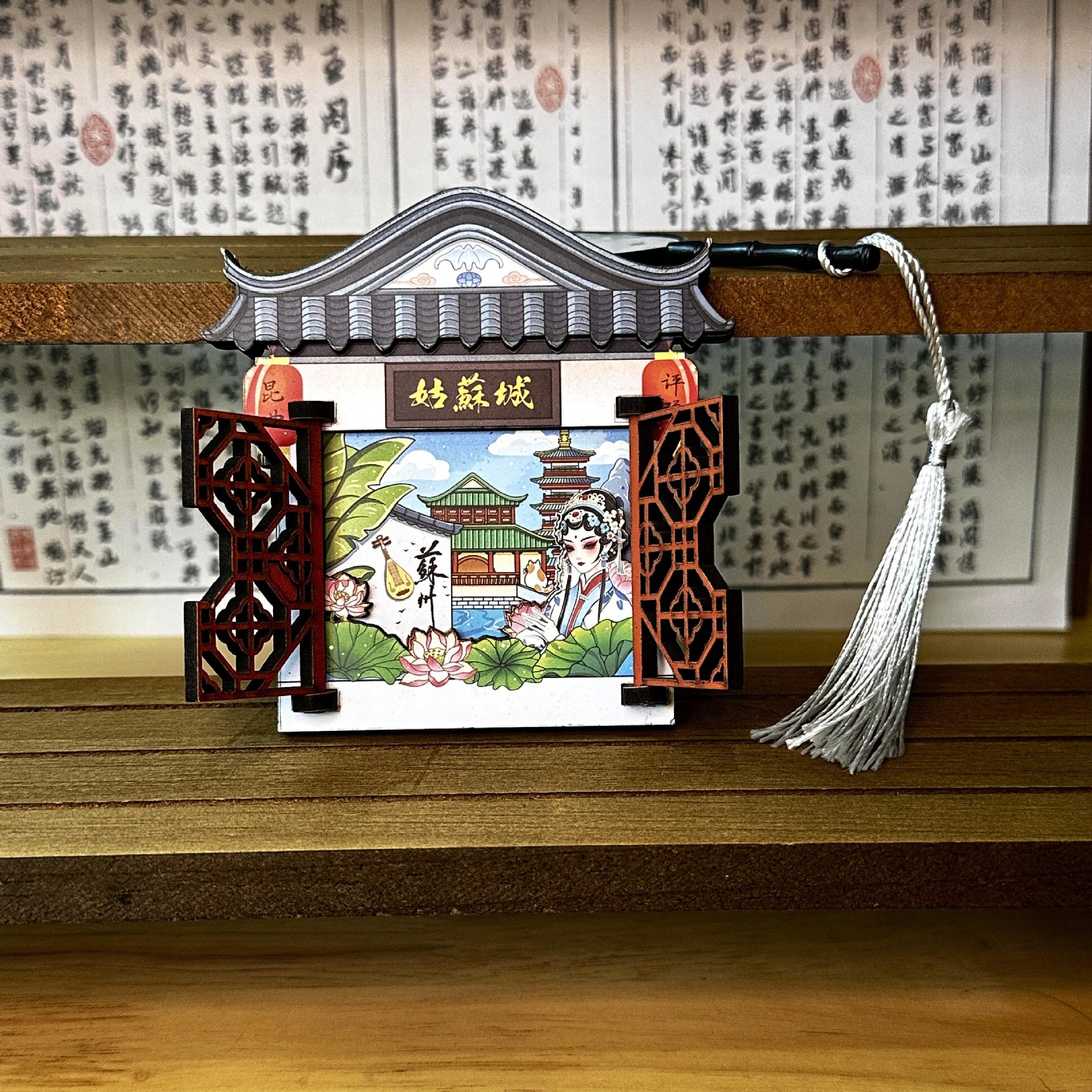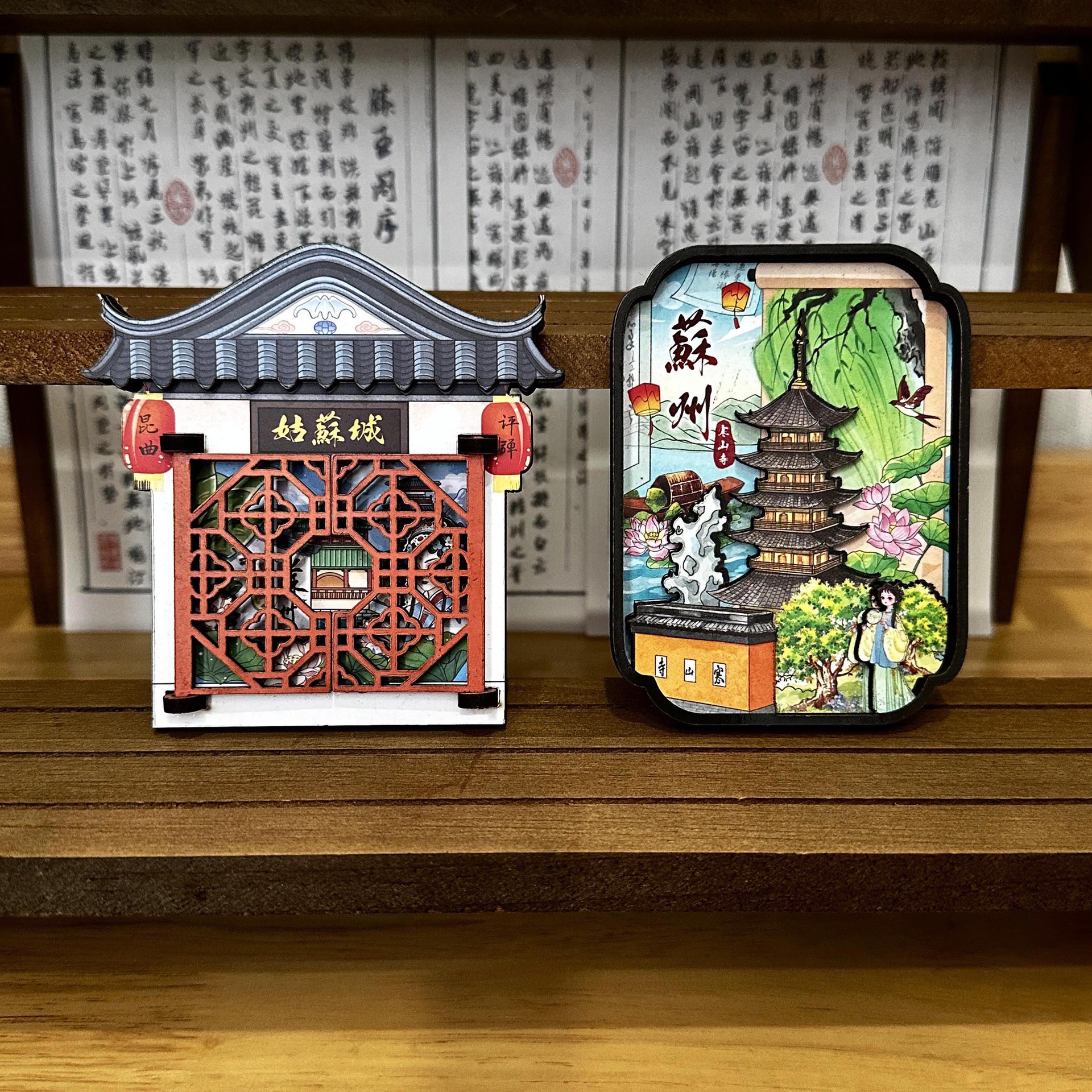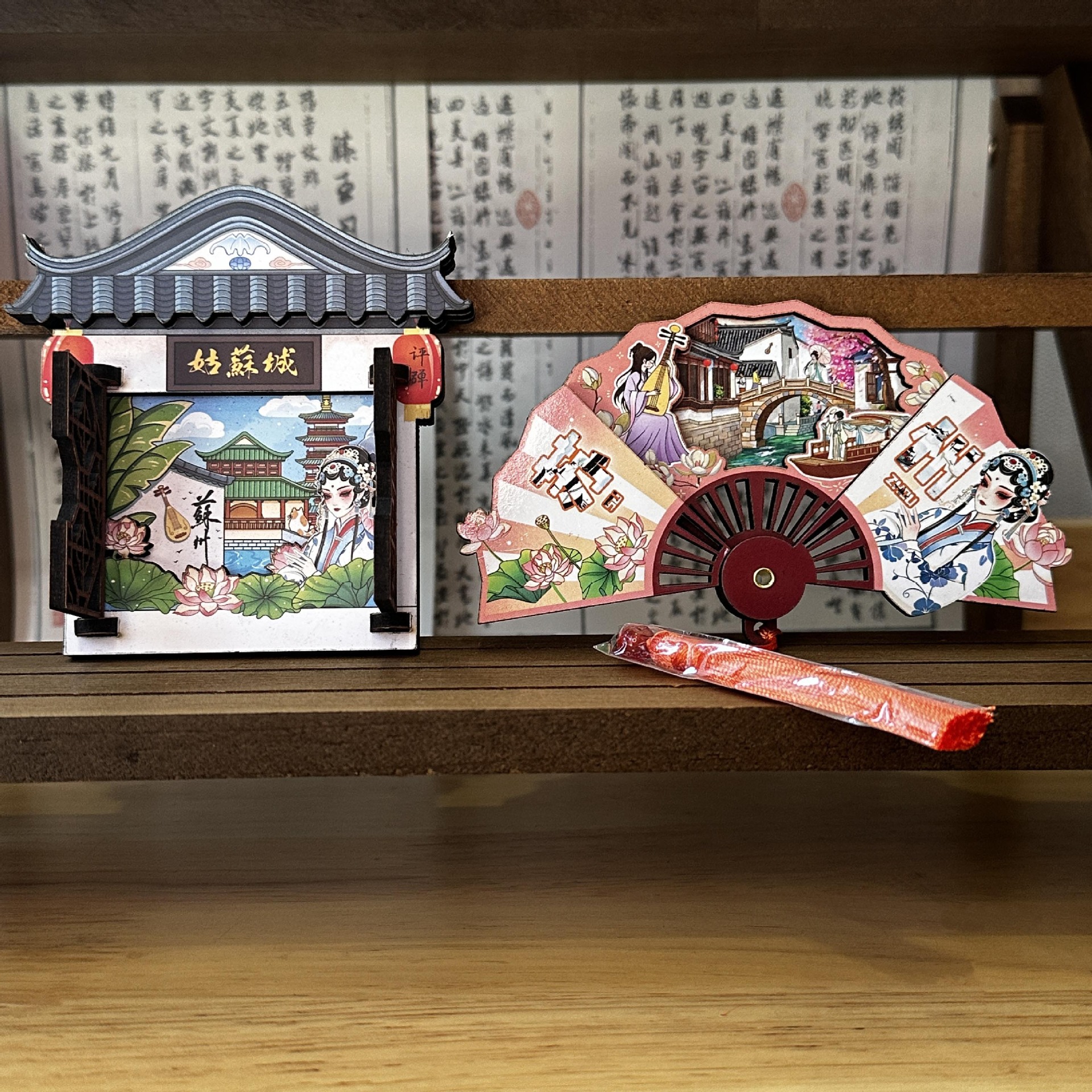 Suzhou wooden China-Chic window opening refrigerator with tassel fan, cultural and creative tourist city landmark, creative souvenir gift