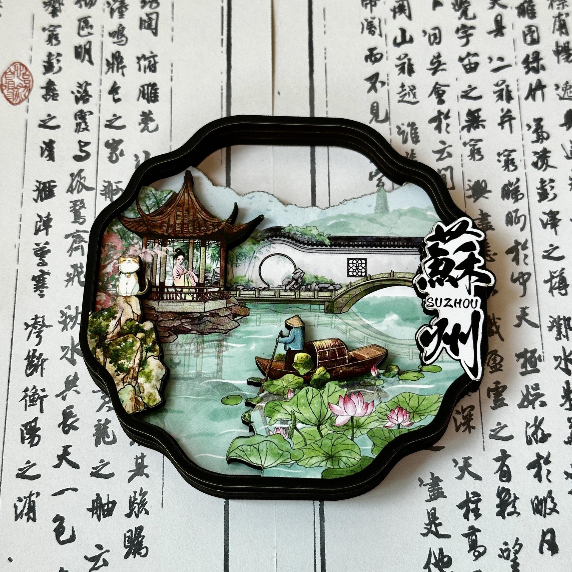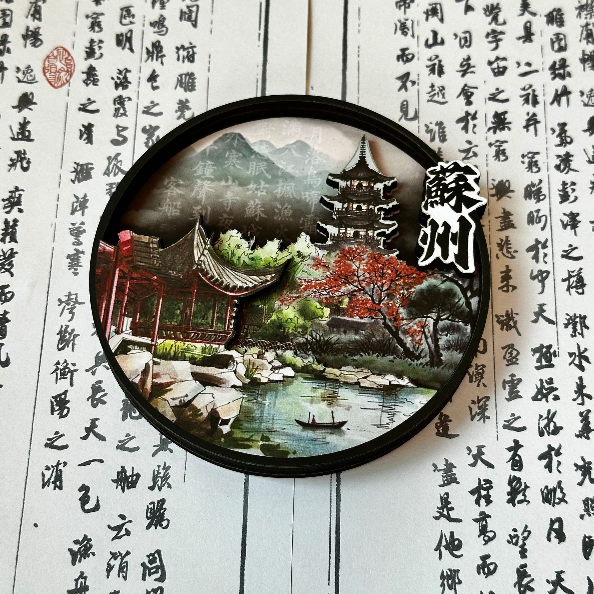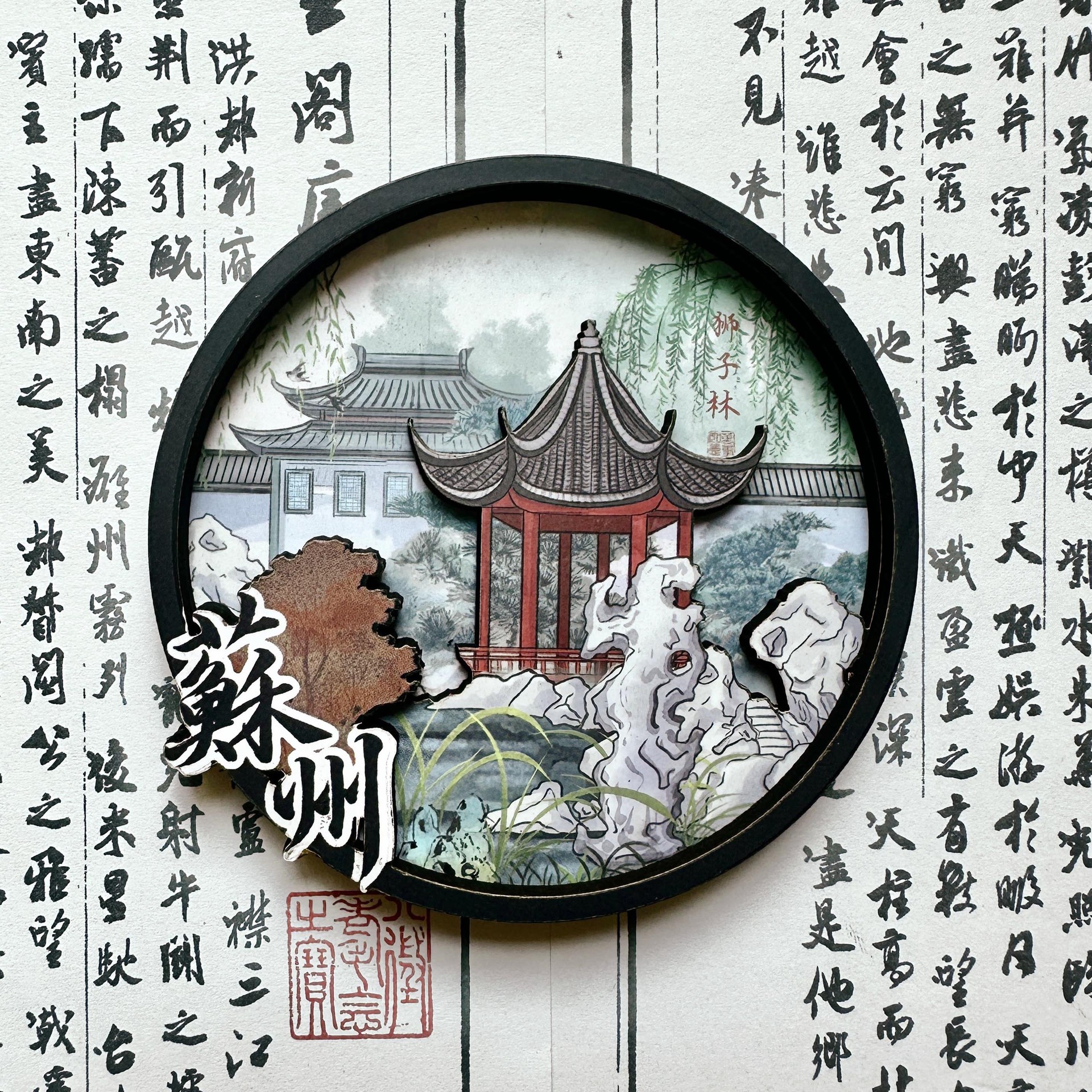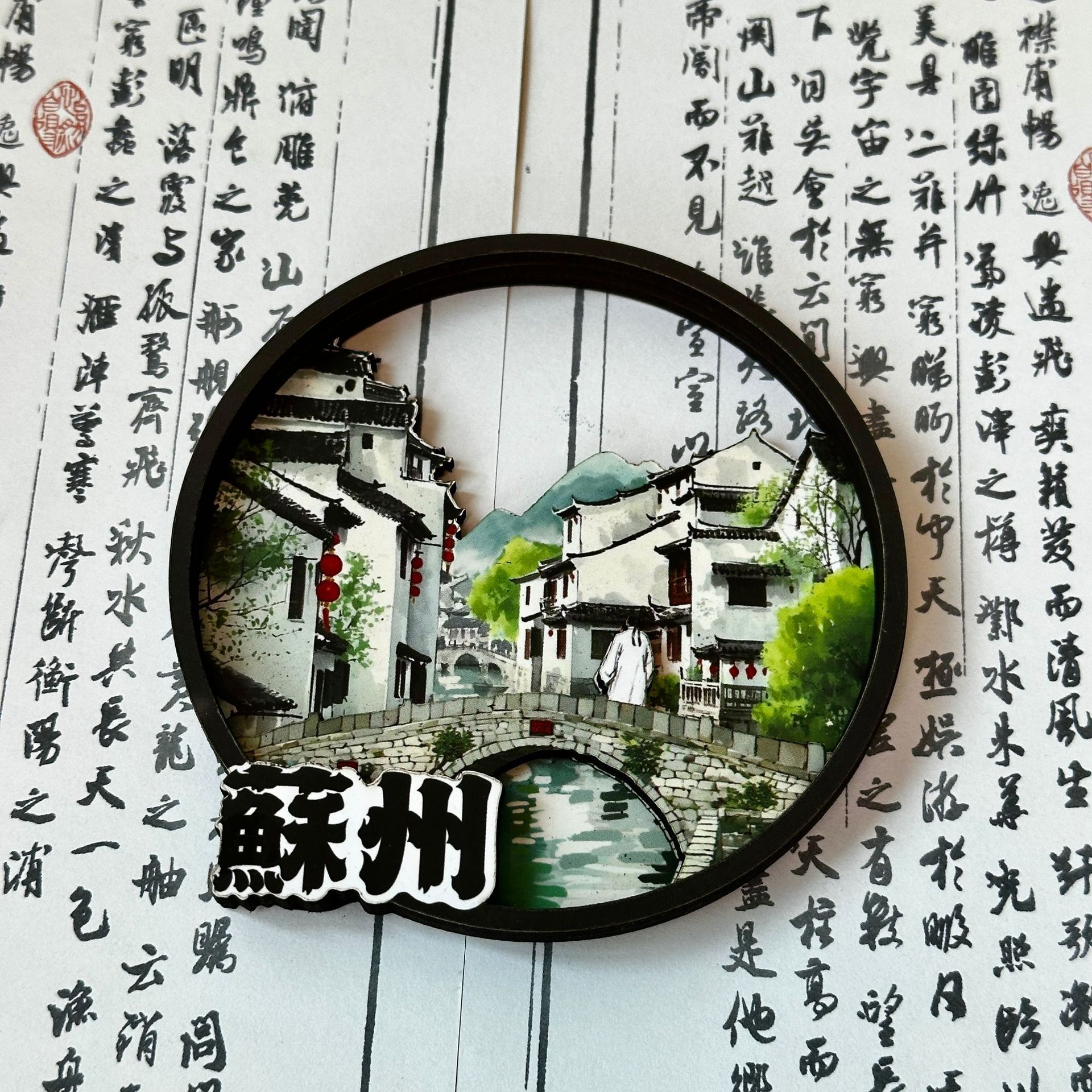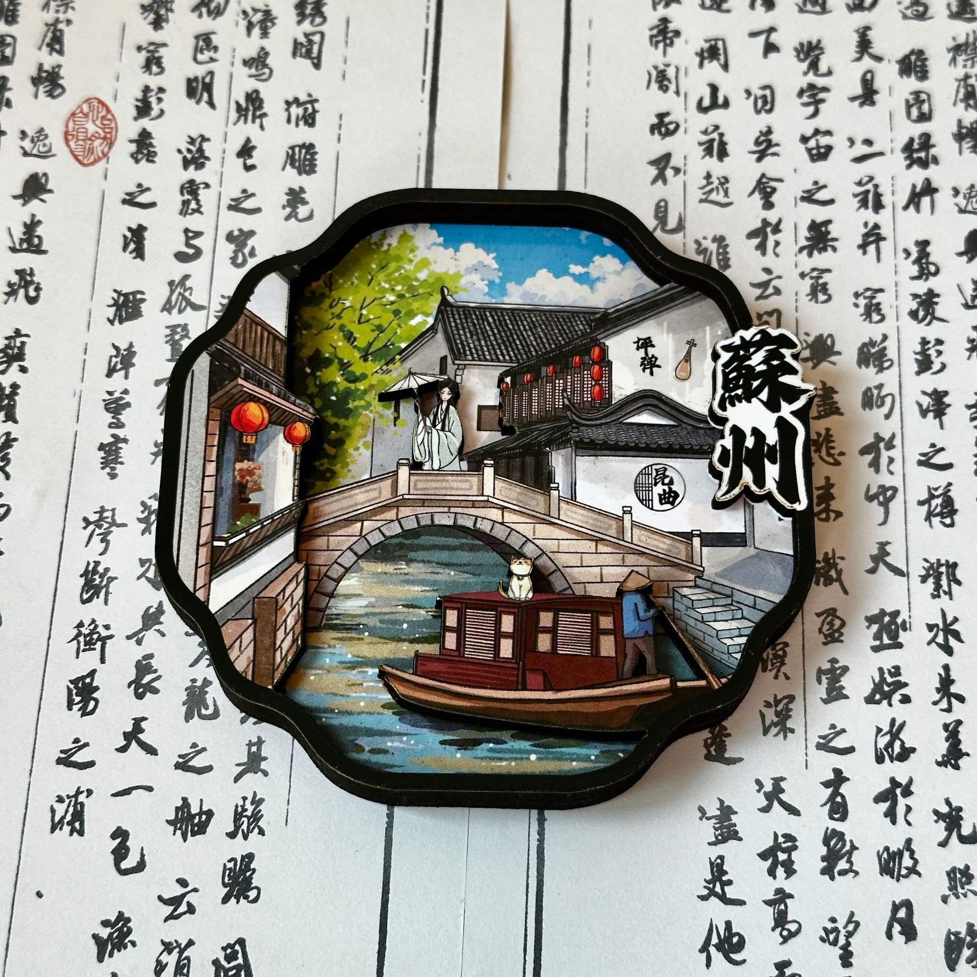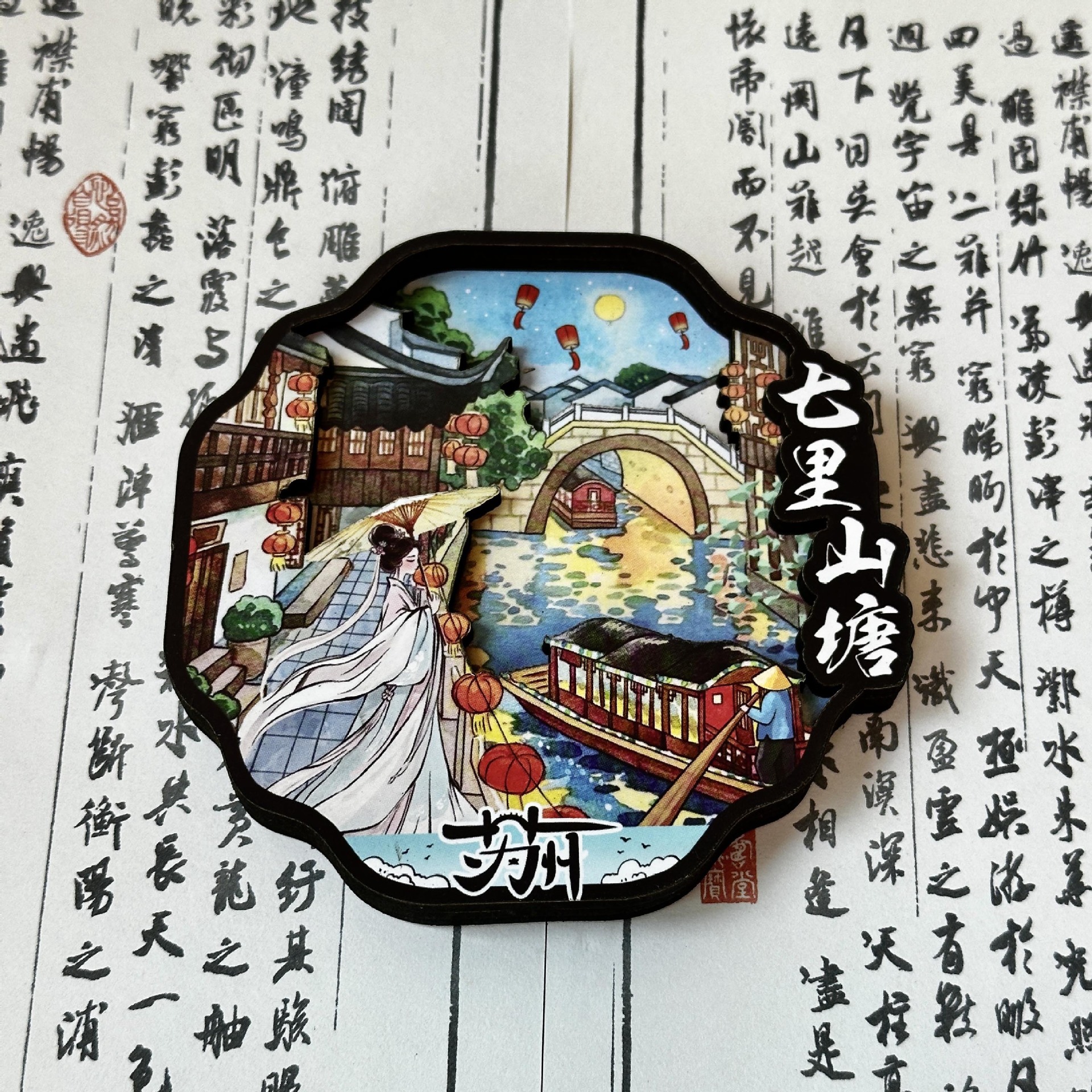 Suzhou wooden China-Chic window opening refrigerator with tassel fan, cultural and creative tourist city landmark, creative souvenir gift