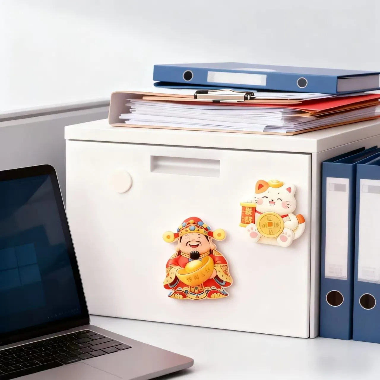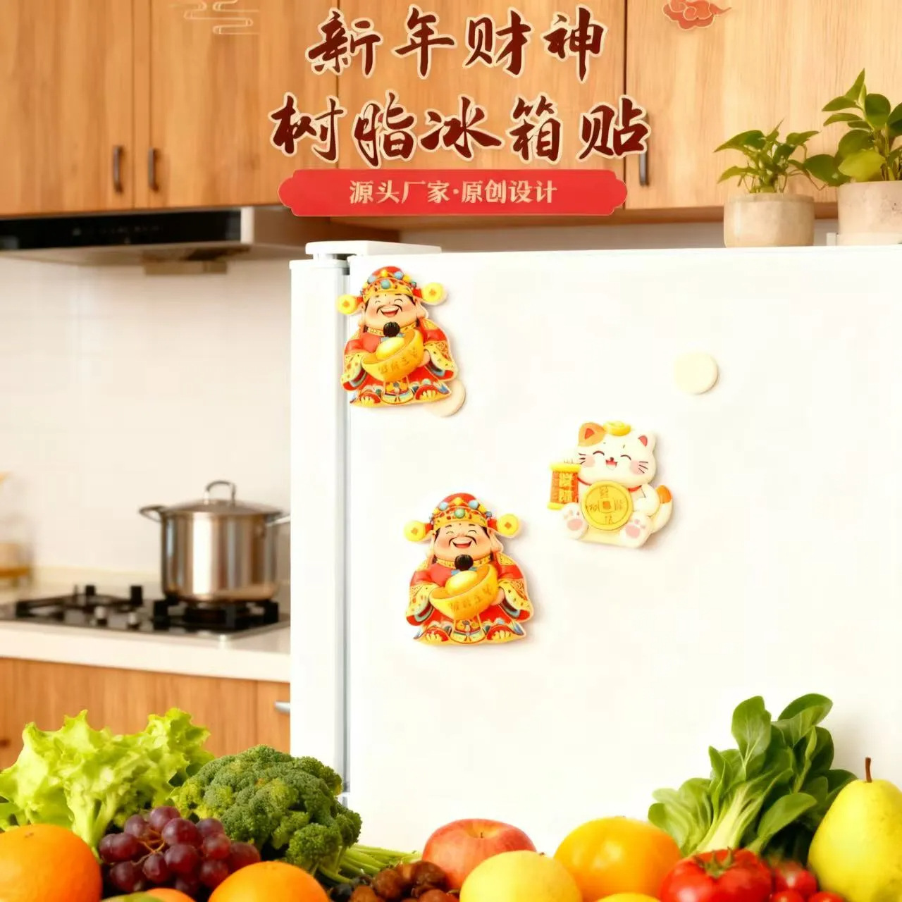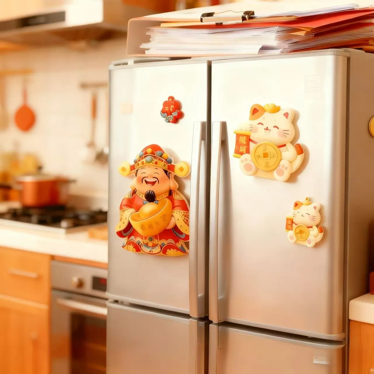 Cute and Creative God of Wealth, Lucky Cat, Refrigerator Sticker, Cartoon 3D Magnetic Tape, Refrigerator Door Decoration, Rotating and Joyful Ornament