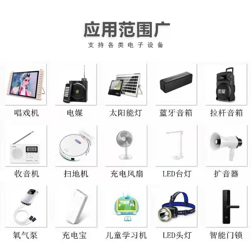 | Scope of application | portable projector;Fish exploration artifact;Surveillance camera;Small household appliances;Electronic toy gun;Emergency lighting lamp;Heating products;Car accessories;robot vacuum cleaner;walkie-talkie;Portable energy storage power supply;Fever pillow;vacuum cleaner;camping light;Portable speaker;cordless power tools;Lithium battery for garden tools;bubble machine;power bank |